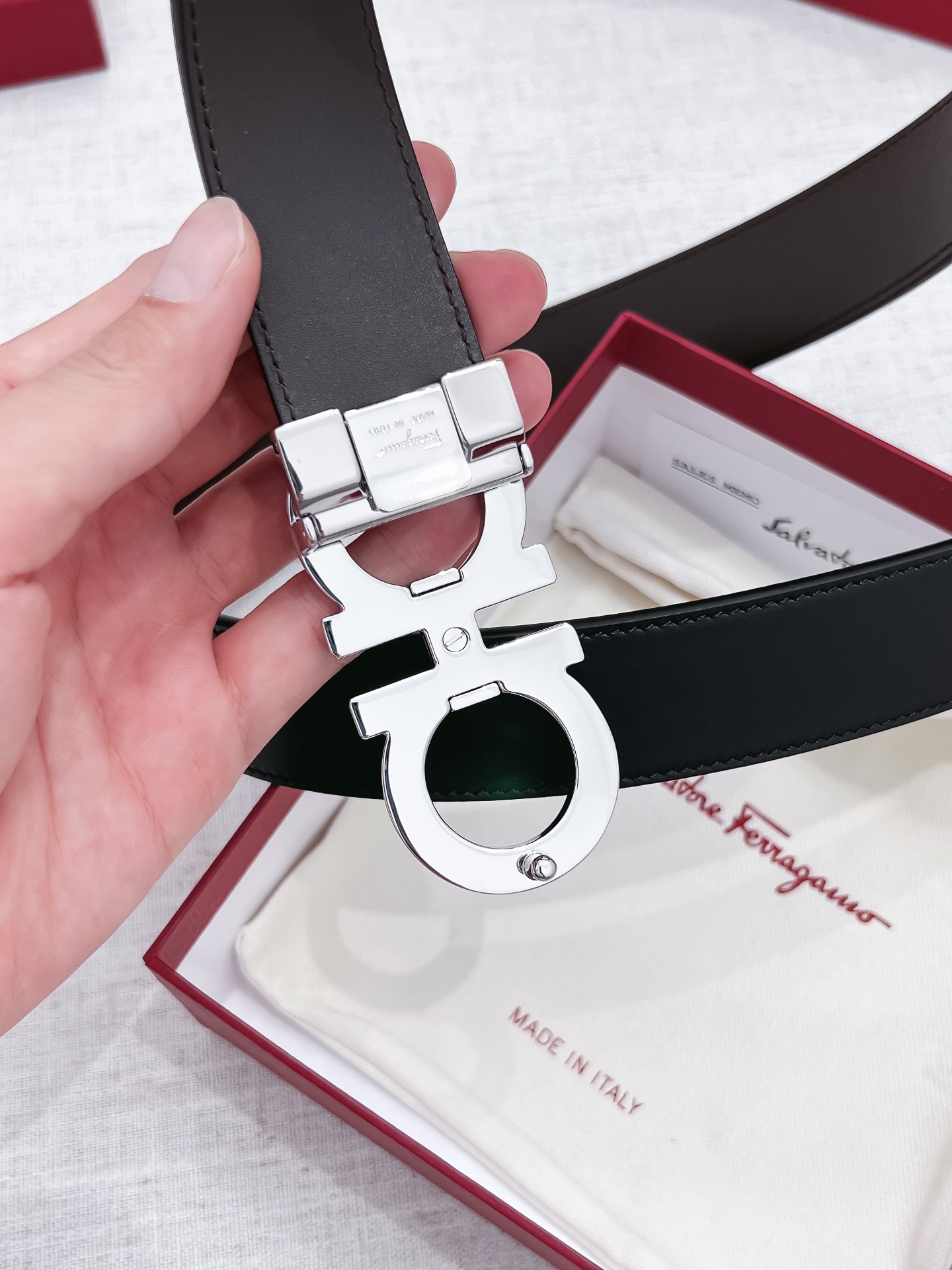 這款皮帶是AAAAA 1:1 質量(非常棒). 使用了和原版一模一樣的材料. 商標部分也保持了和菲拉格慕/Salvatore Ferragamo一樣. 圖片拍攝是實物皮帶拍攝, 您所收到的實物保證和我們圖片一模一樣.