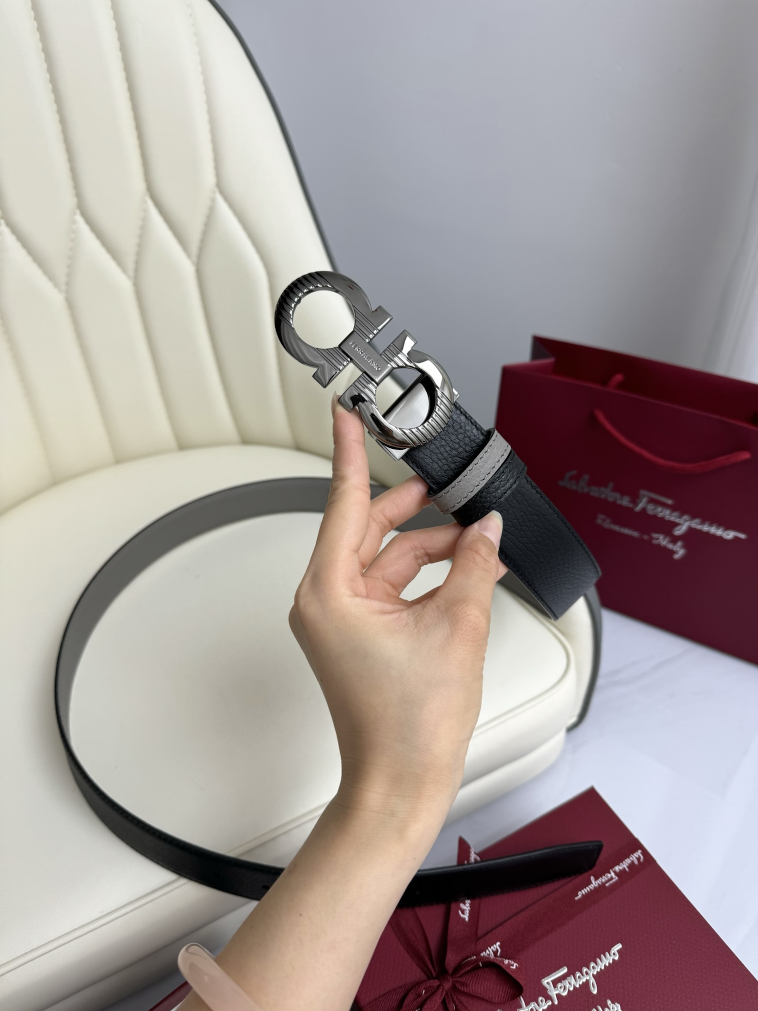 這款皮帶是AAAAA 1:1 質量(非常棒). 使用了和原版一模一樣的材料. 商標部分也保持了和菲拉格慕/Salvatore Ferragamo一樣. 圖片拍攝是實物皮帶拍攝, 您所收到的實物保證和我們圖片一模一樣.