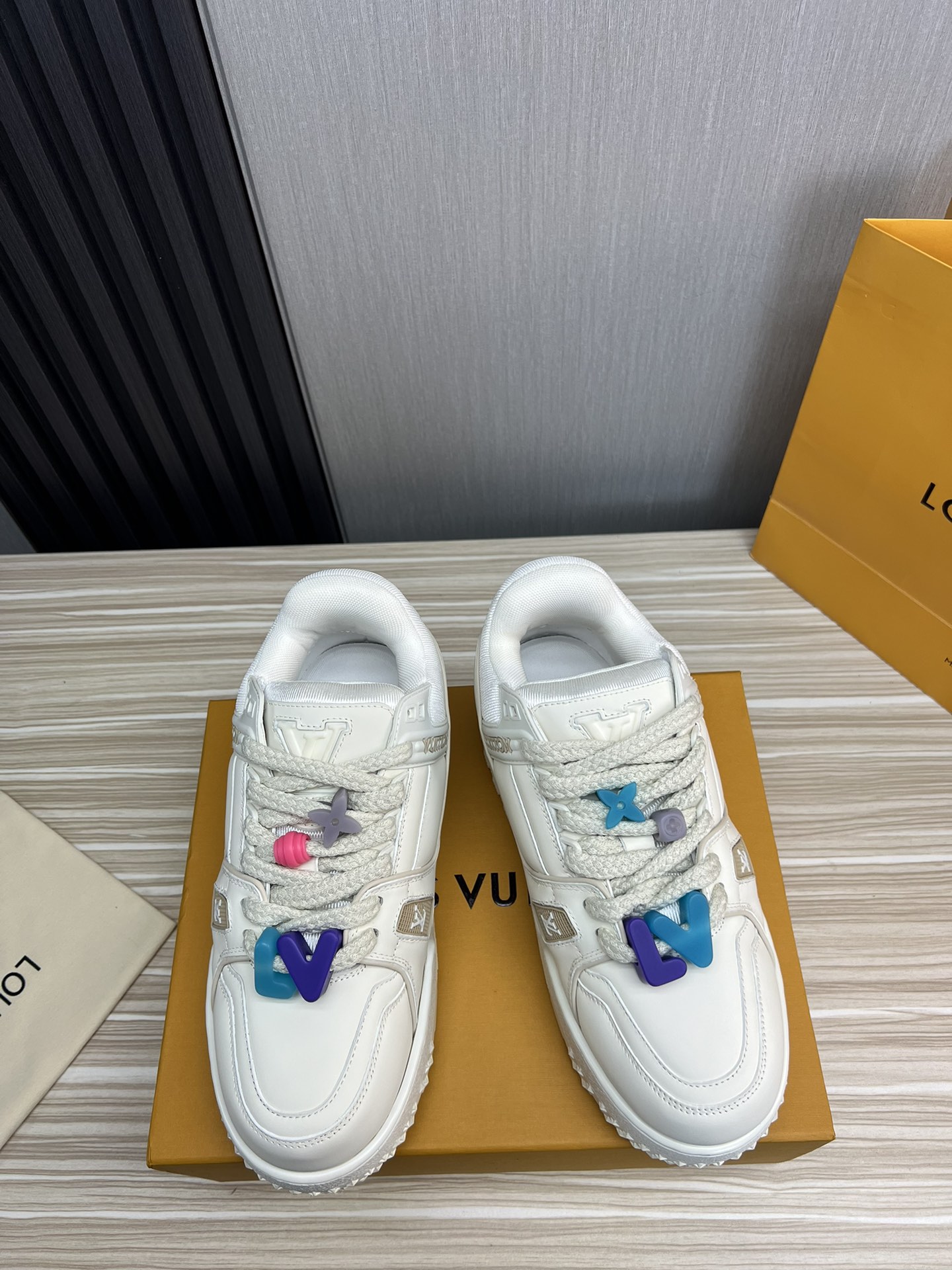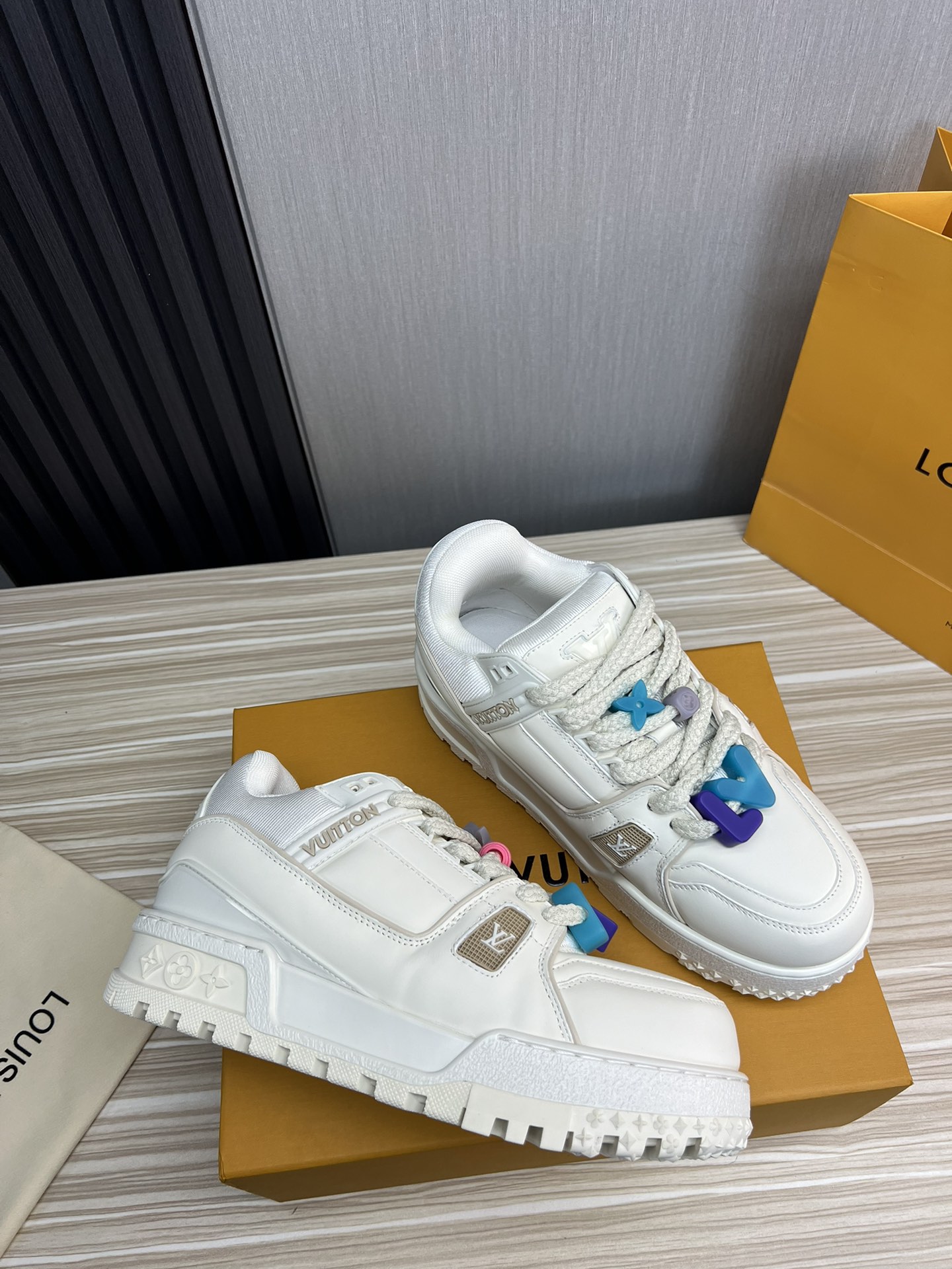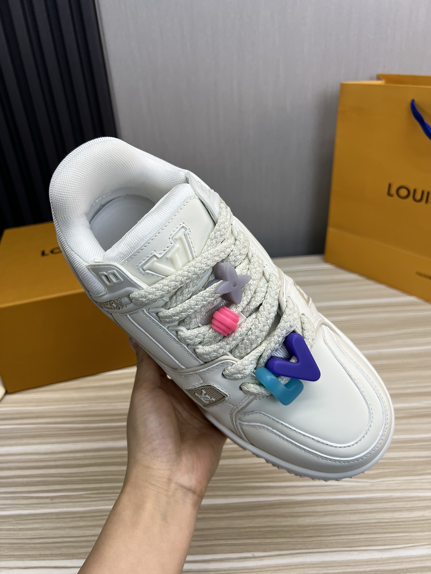 這款鞋子是AAAAA 1:1 質量(非常棒). 使用了和原版一模一樣的材料. 商標部分也保持了和路易威登/Louis Vuitton一樣. 圖片拍攝是實物鞋子拍攝, 您所收到的實物保證和我們圖片一模一樣.