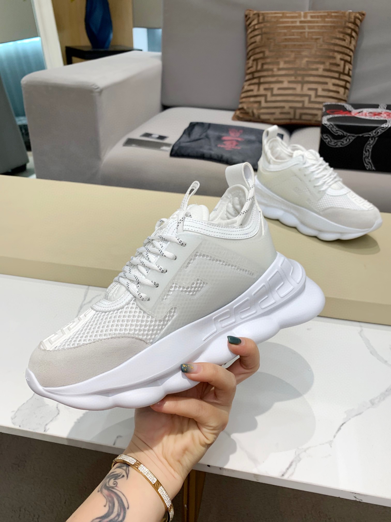 這款鞋子是AAAAA 1:1 質量(非常棒). 使用了和原版一模一樣的材料. 商標部分也保持了和范思哲/Versace一樣. 圖片拍攝是實物鞋子拍攝, 您所收到的實物保證和我們圖片一模一樣.