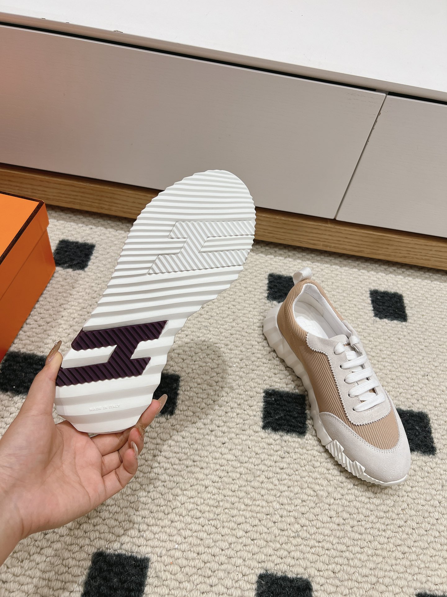 這款鞋子是AAAAA 1:1 質量(非常棒). 使用了和原版一模一樣的材料. 商標部分也保持了和愛馬仕/Hermes一樣. 圖片拍攝是實物鞋子拍攝, 您所收到的實物保證和我們圖片一模一樣.