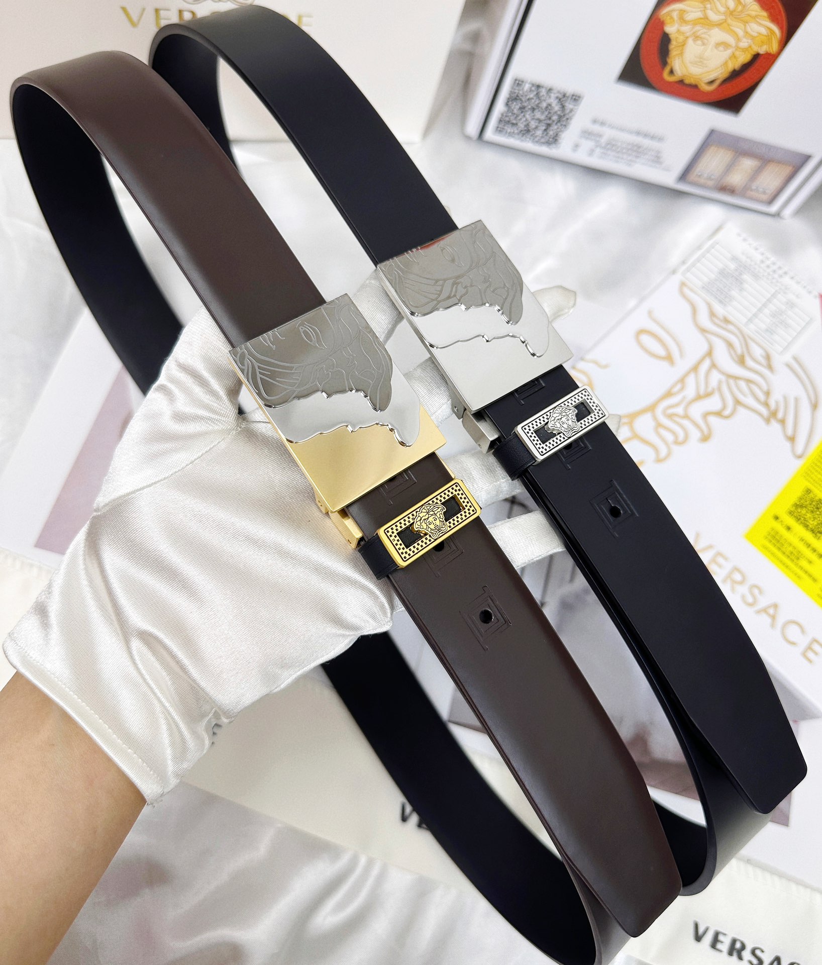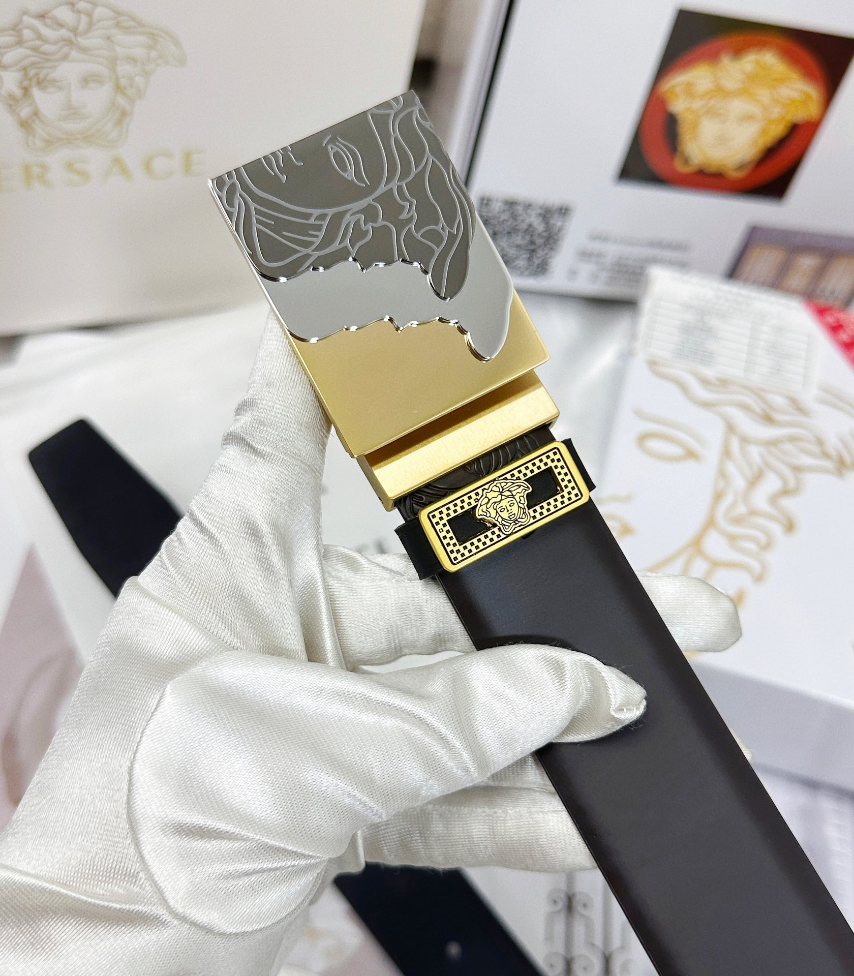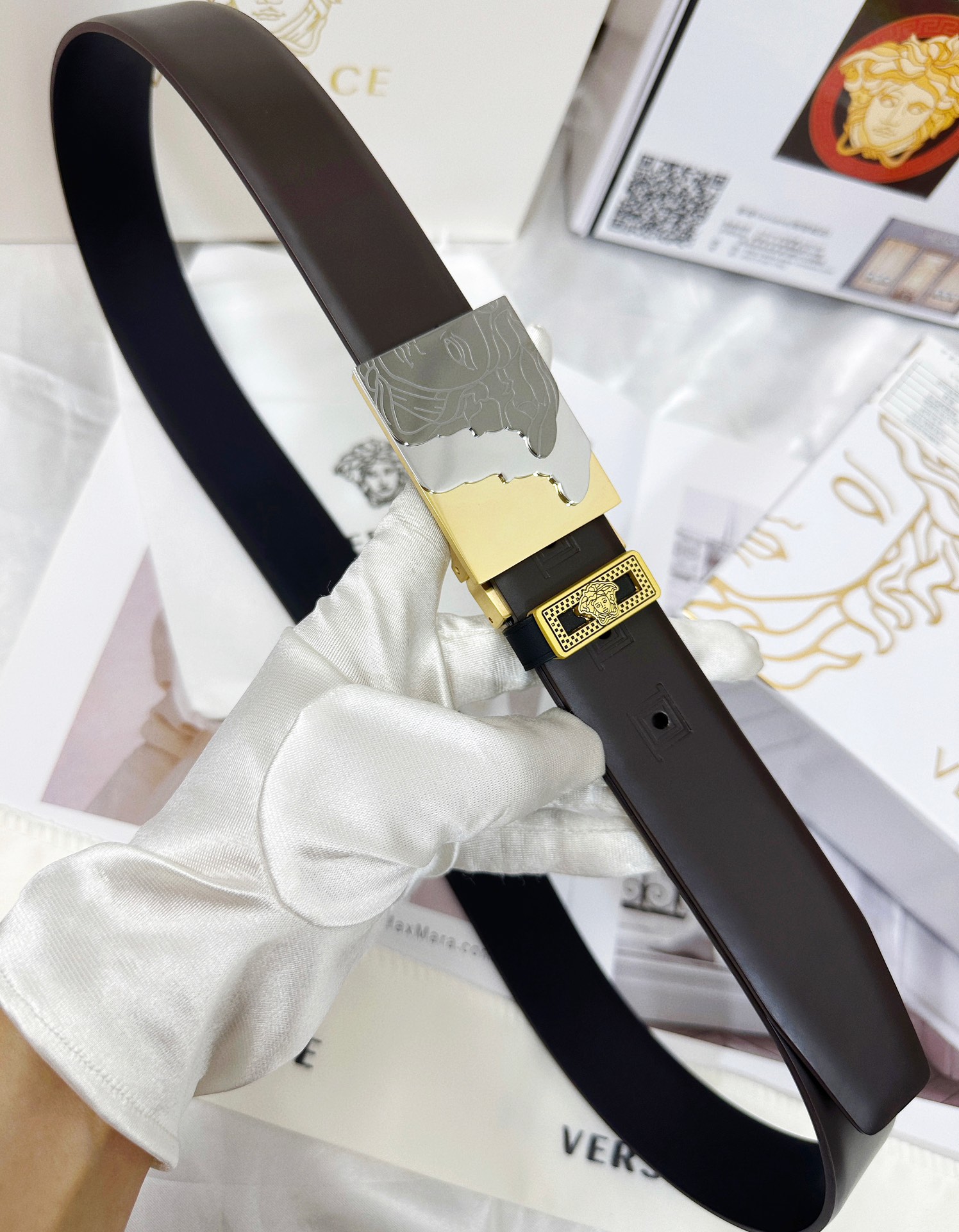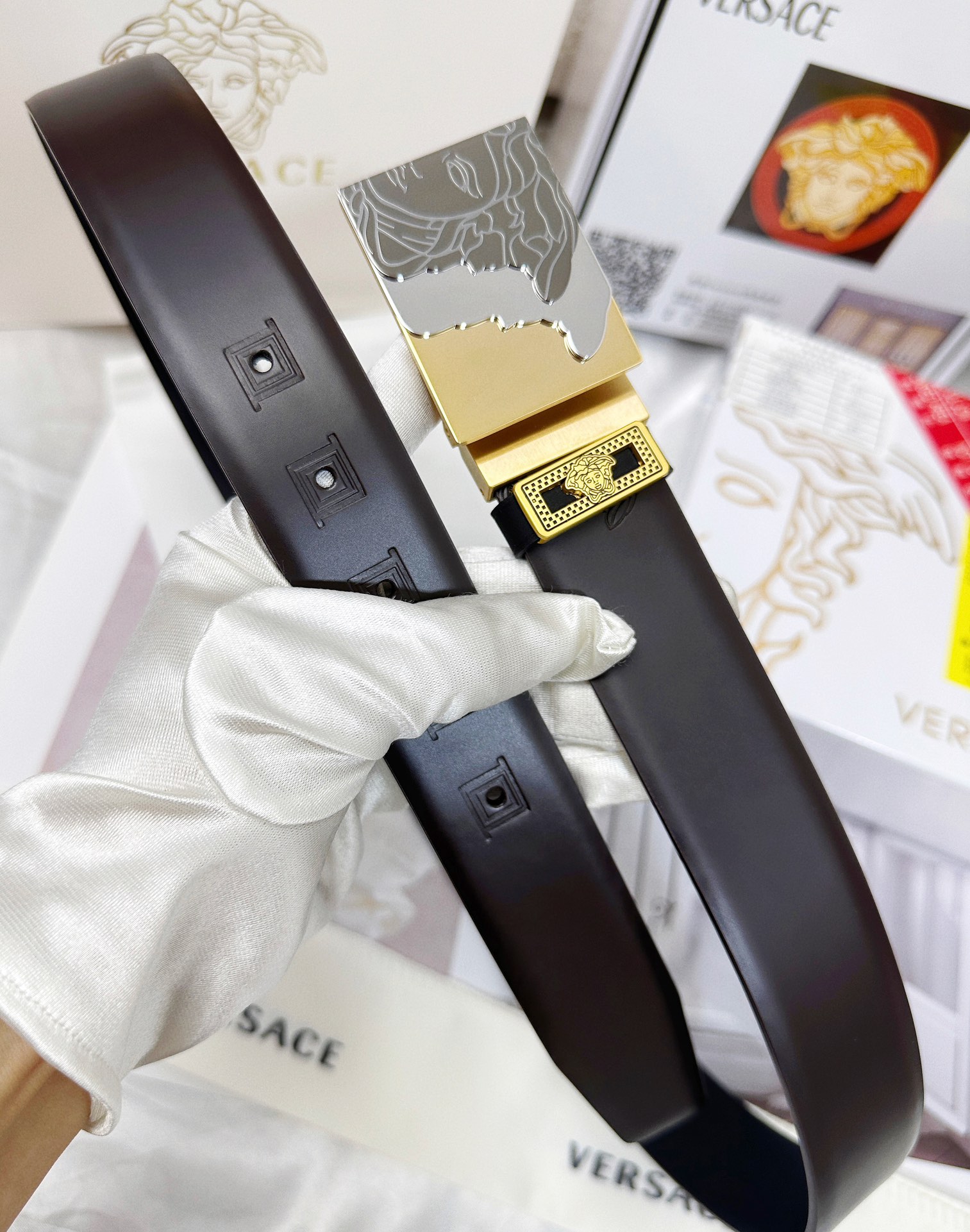 這款皮帶是AAAAA 1:1 質量(非常棒). 使用了和原版一模一樣的材料. 商標部分也保持了和范思哲/Versace一樣. 圖片拍攝是實物皮帶拍攝, 您所收到的實物保證和我們圖片一模一樣.