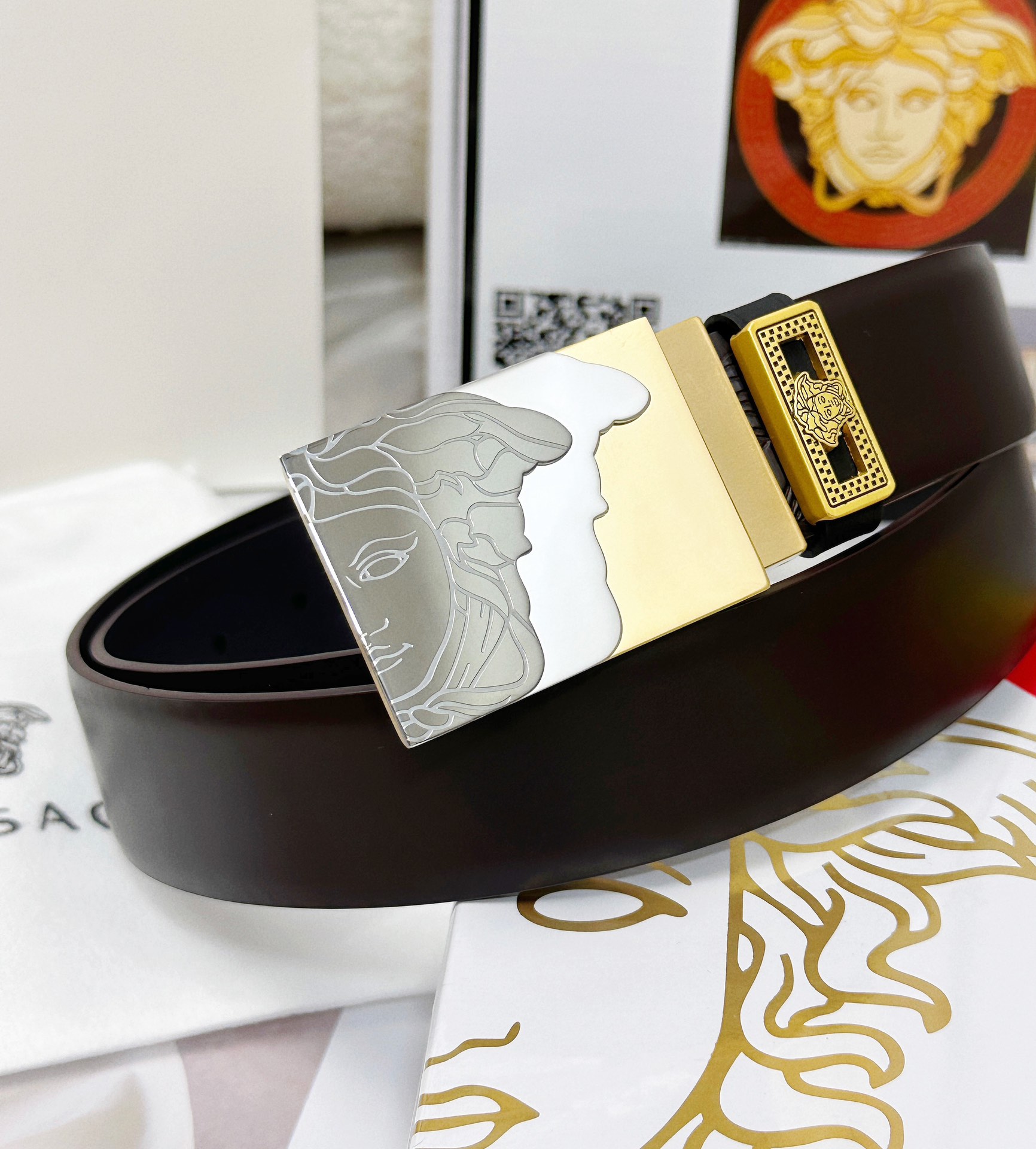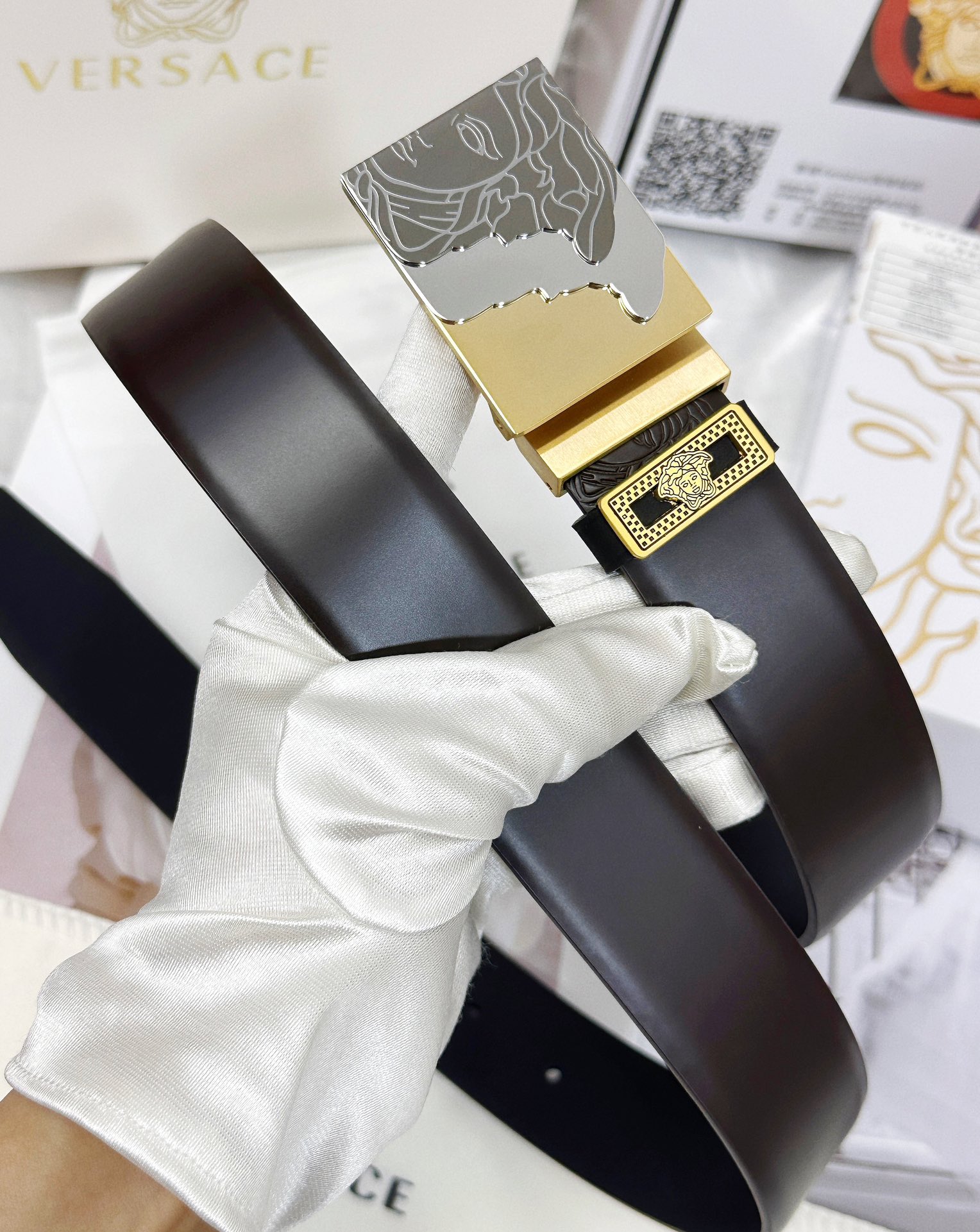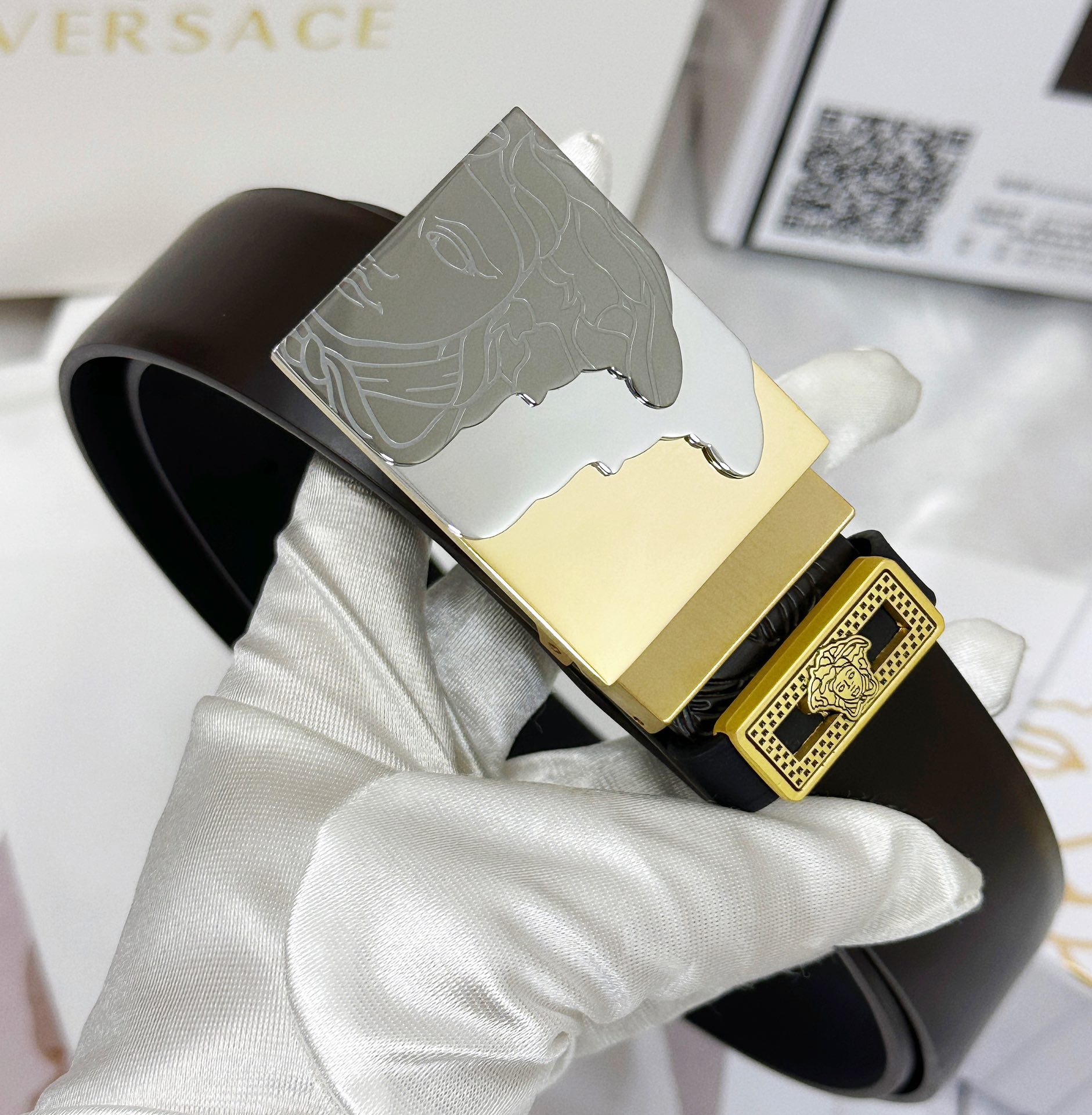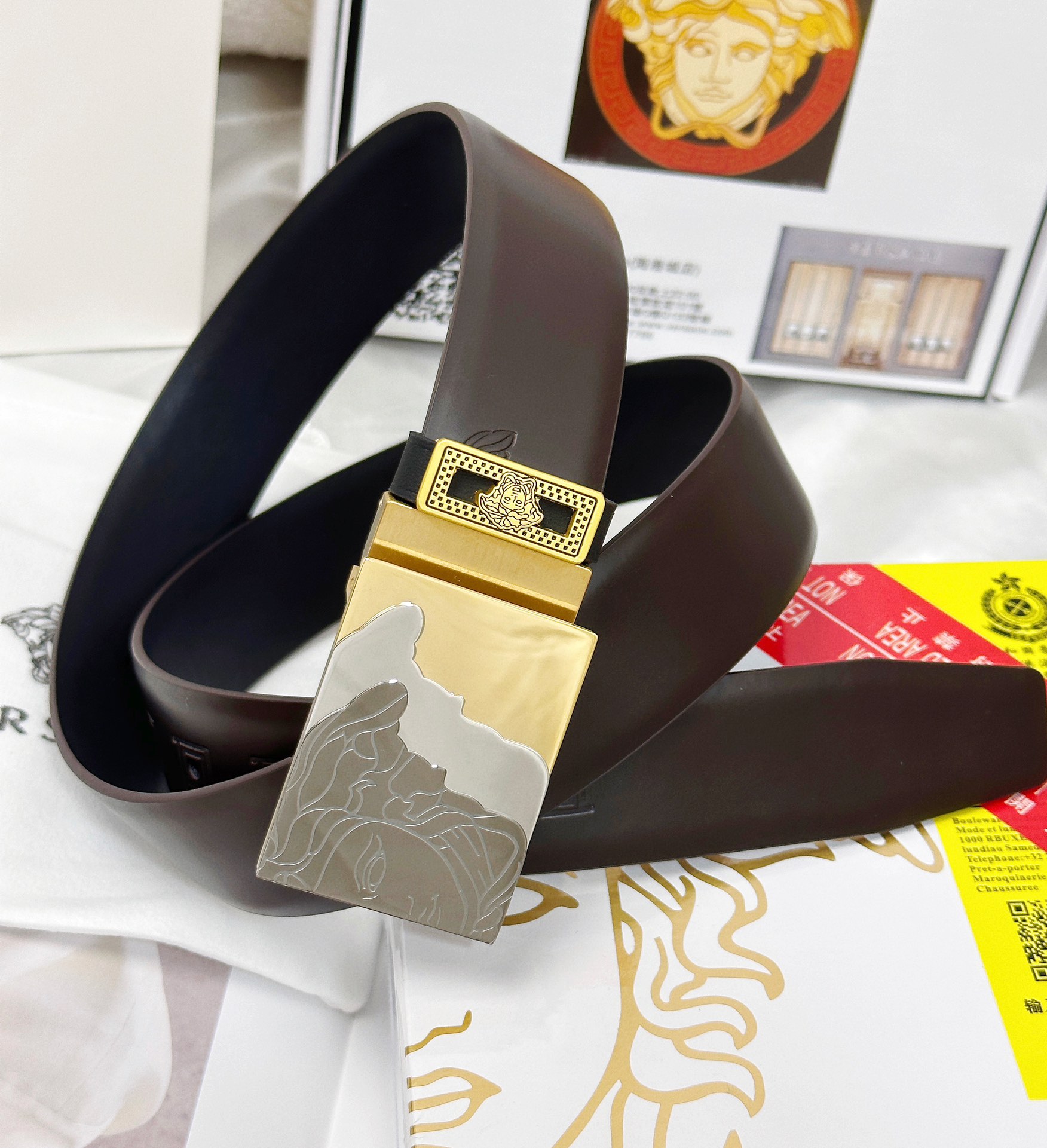 這款皮帶是AAAAA 1:1 質量(非常棒). 使用了和原版一模一樣的材料. 商標部分也保持了和范思哲/Versace一樣. 圖片拍攝是實物皮帶拍攝, 您所收到的實物保證和我們圖片一模一樣.