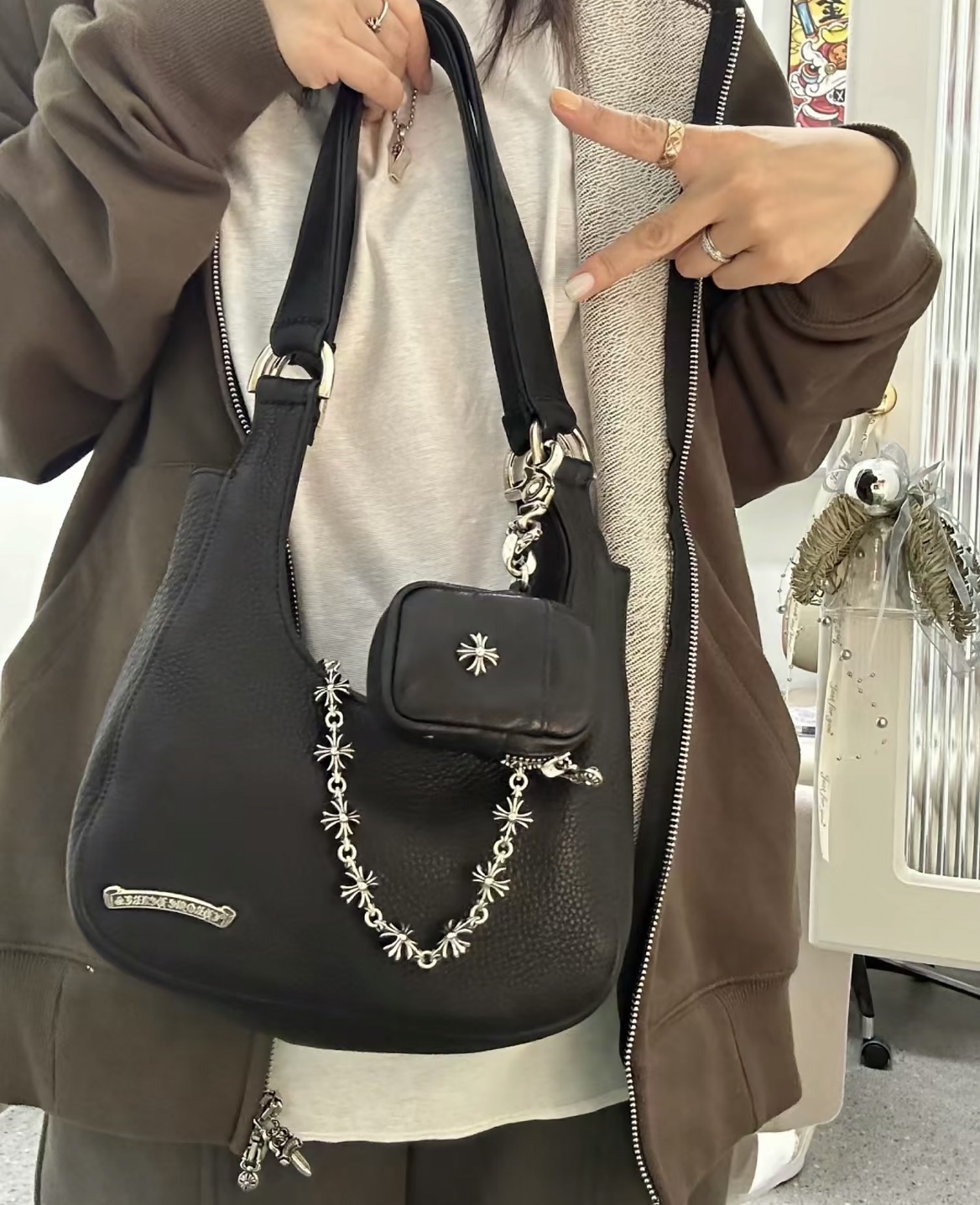 這款包包是AAAAA 1:1 質量(非常棒). 使用了和原版一模一樣的材料. 商標部分也保持了和鉻心/Chrome Hearts一樣. 圖片拍攝是實物包包拍攝, 您所收到的實物保證和我們圖片一模一樣.