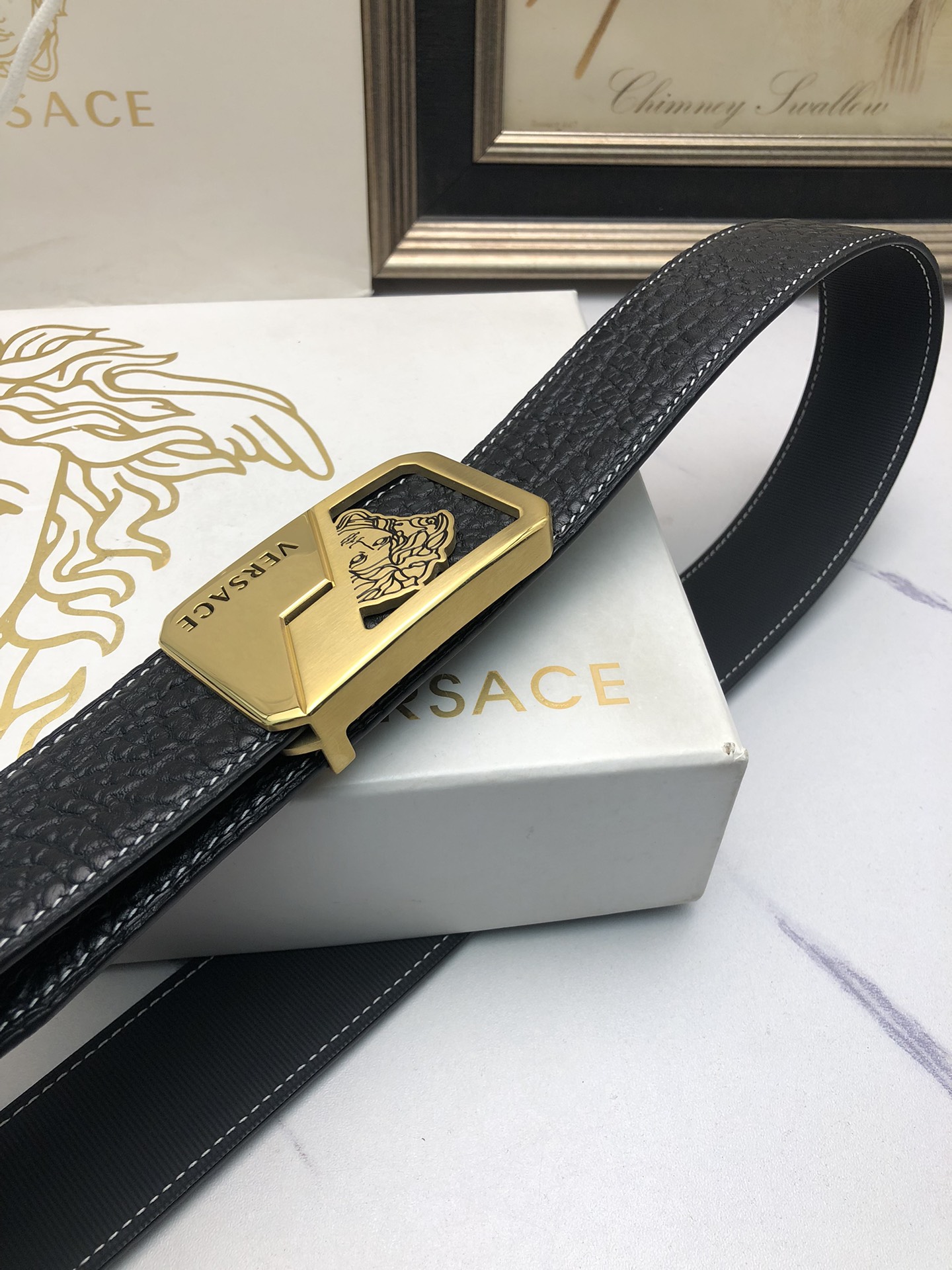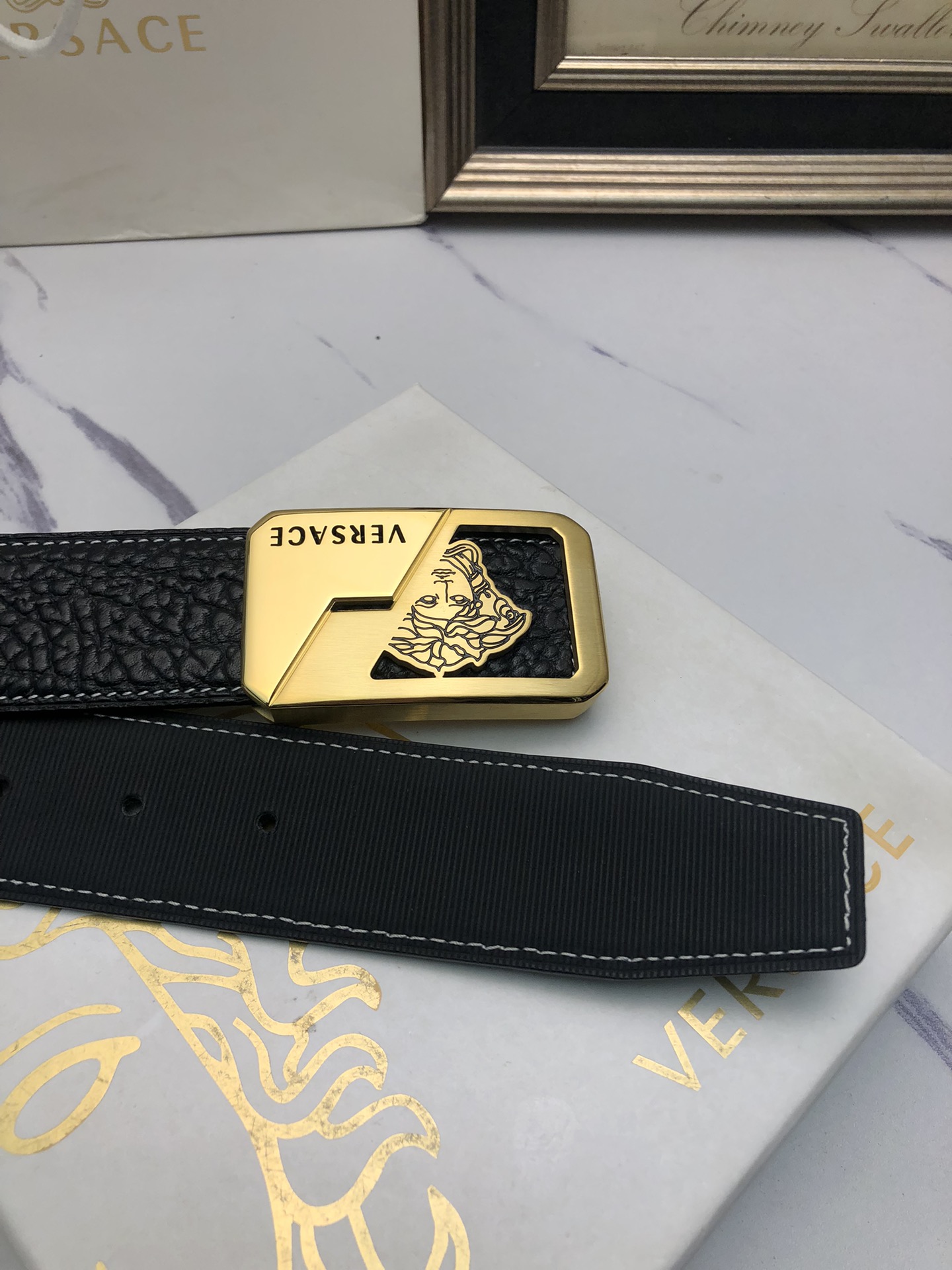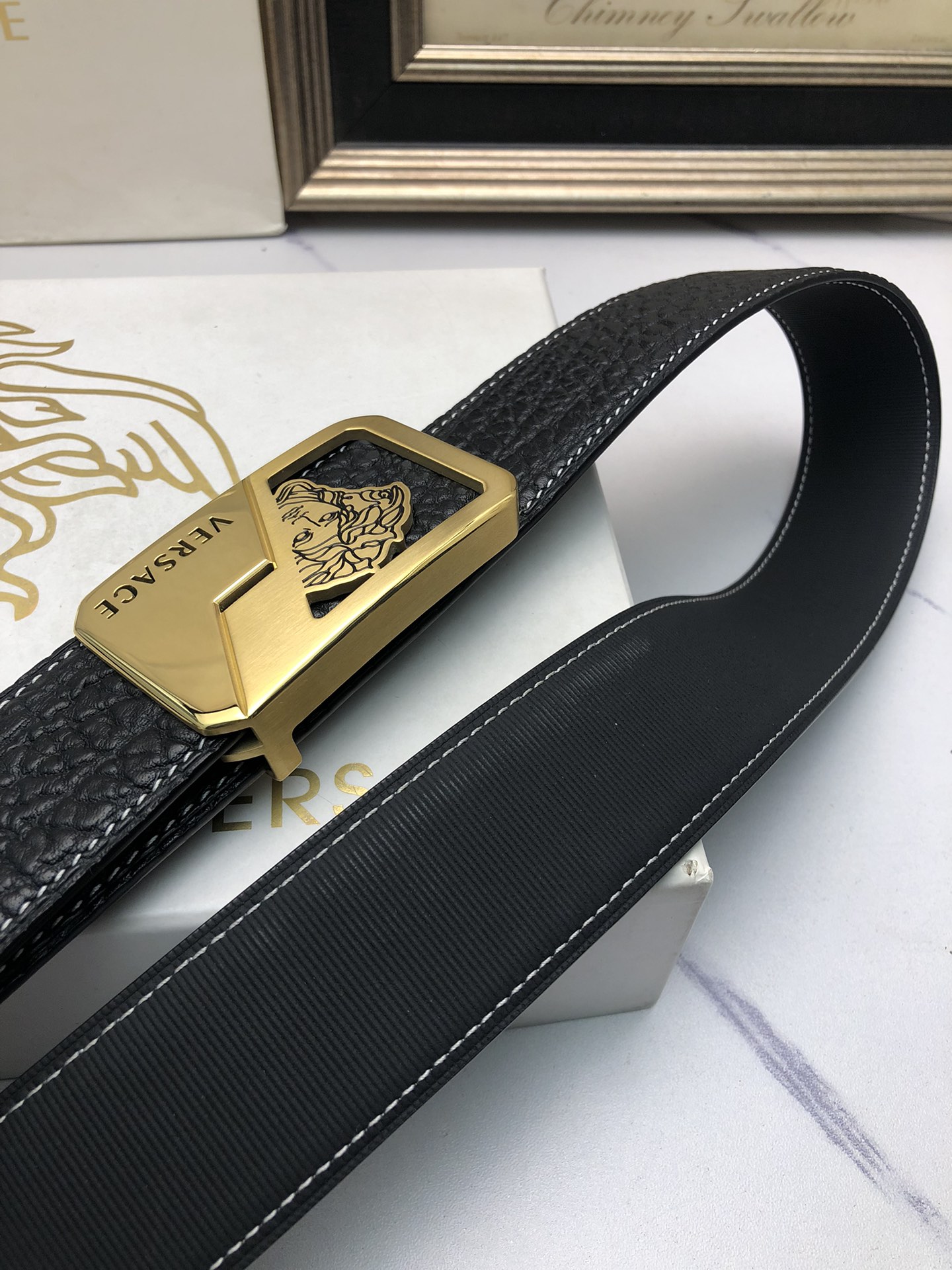 這款皮帶是AAAAA 1:1 質量(非常棒). 使用了和原版一模一樣的材料. 商標部分也保持了和范思哲/Versace一樣. 圖片拍攝是實物皮帶拍攝, 您所收到的實物保證和我們圖片一模一樣.
