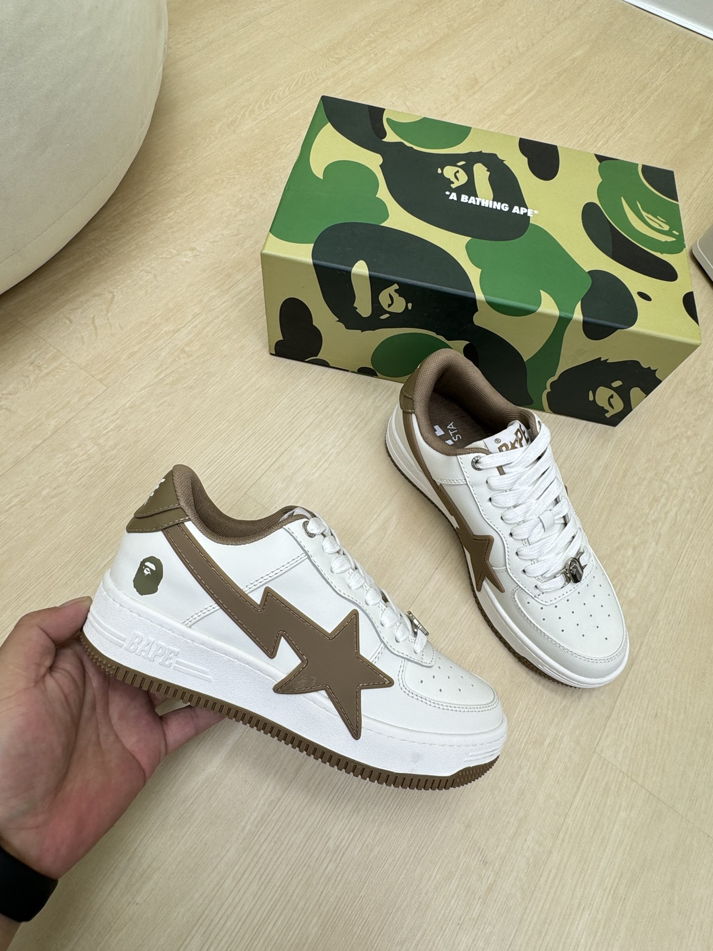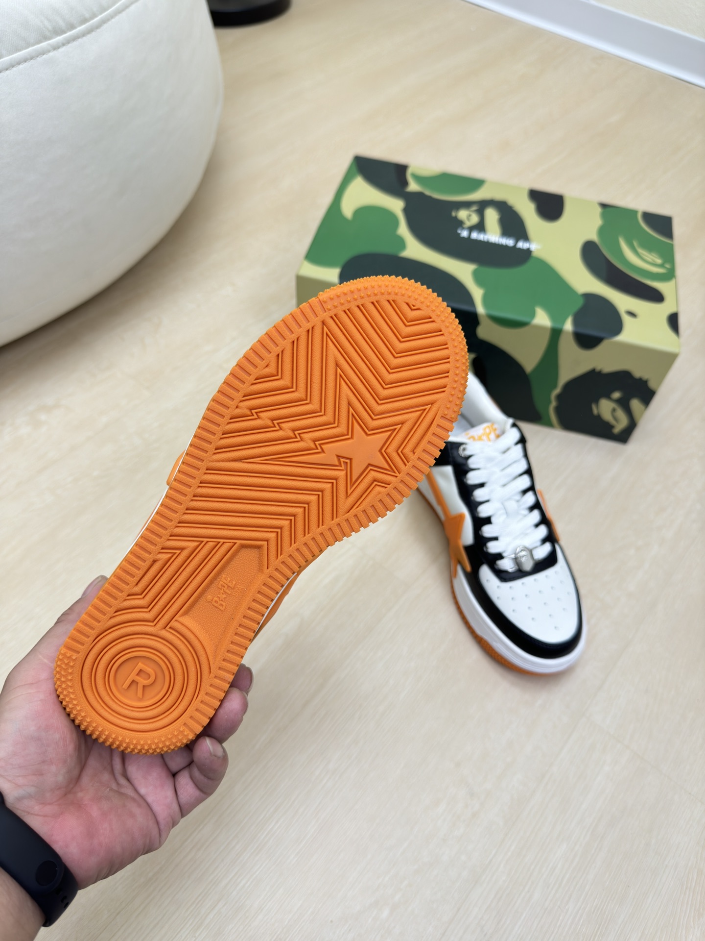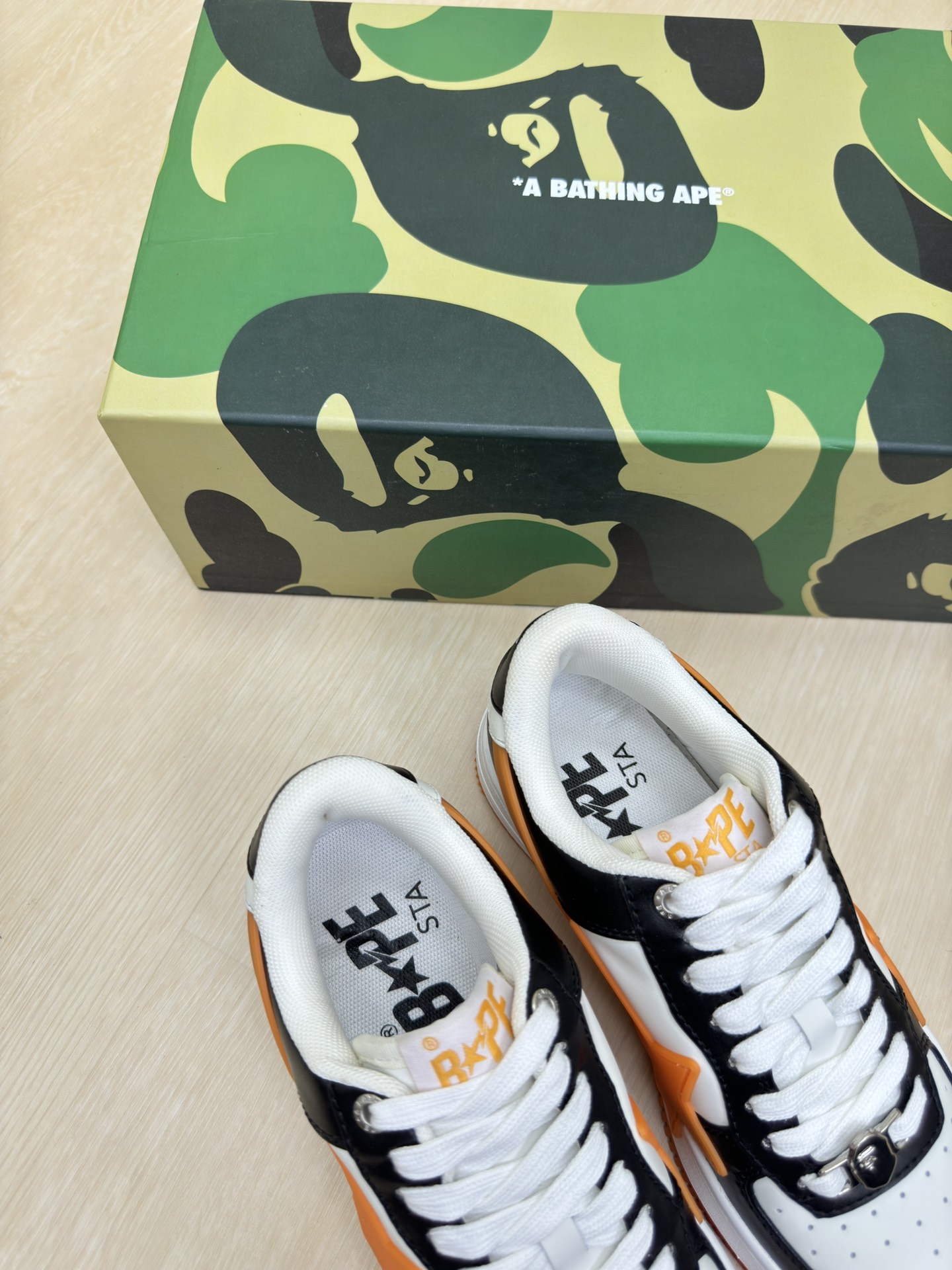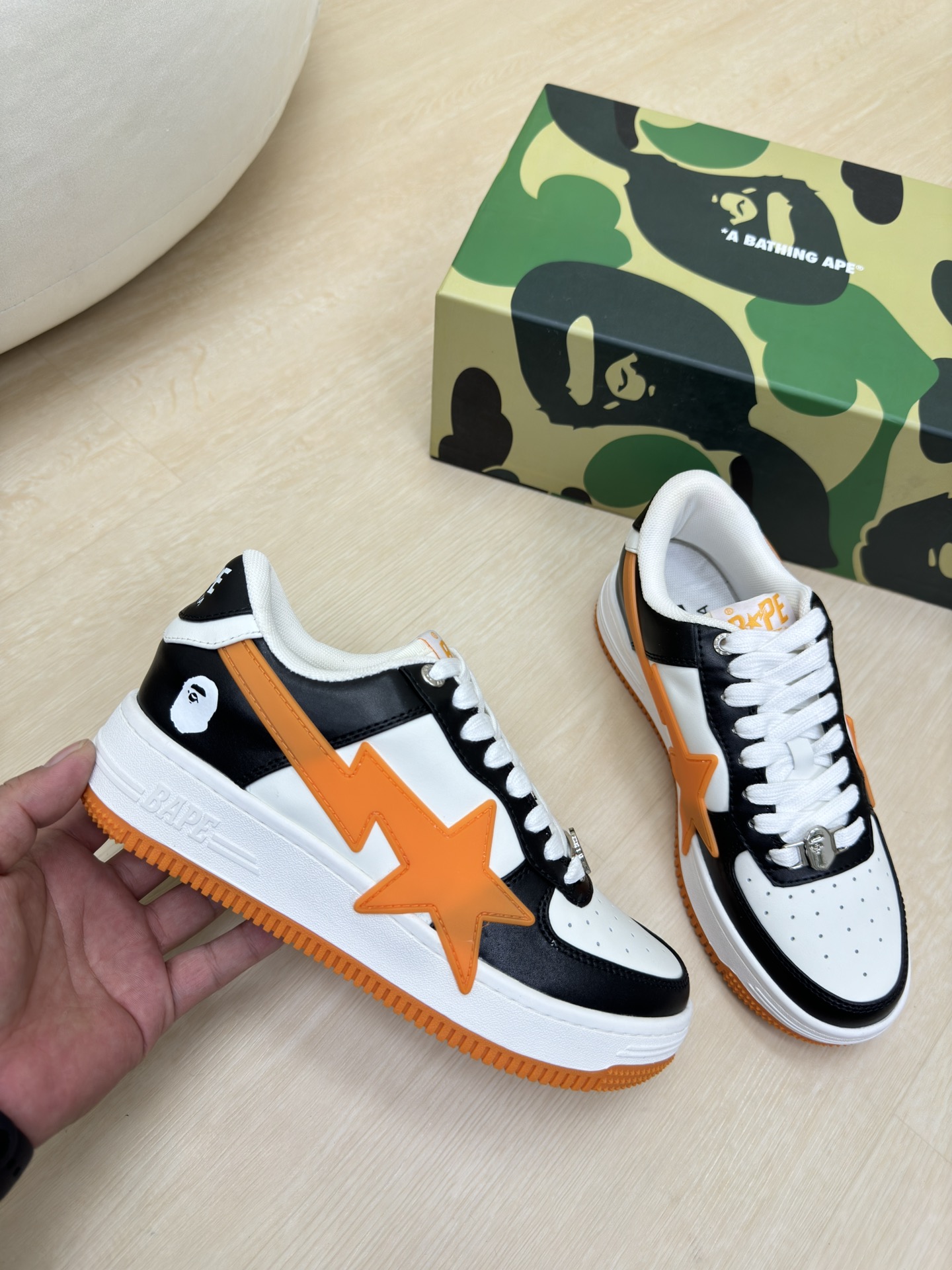 這款鞋子是AAAAA 1:1 質量(非常棒). 使用了和原版一模一樣的材料. 商標部分也保持了和Bape一樣. 圖片拍攝是實物鞋子拍攝, 您所收到的實物保證和我們圖片一模一樣.