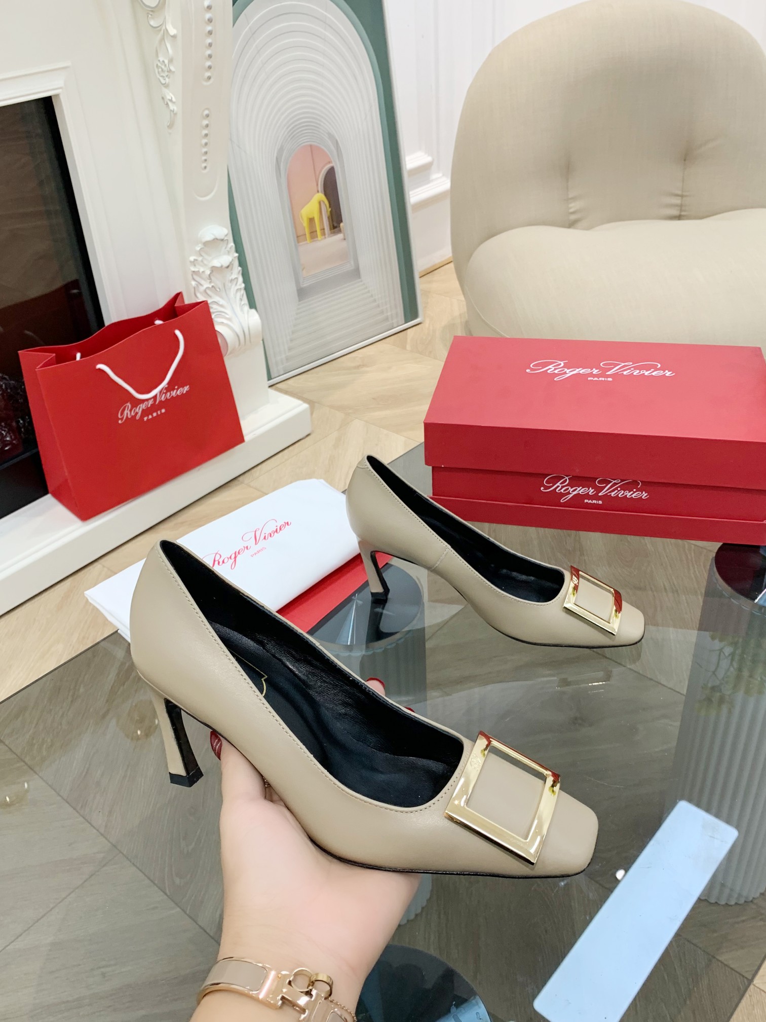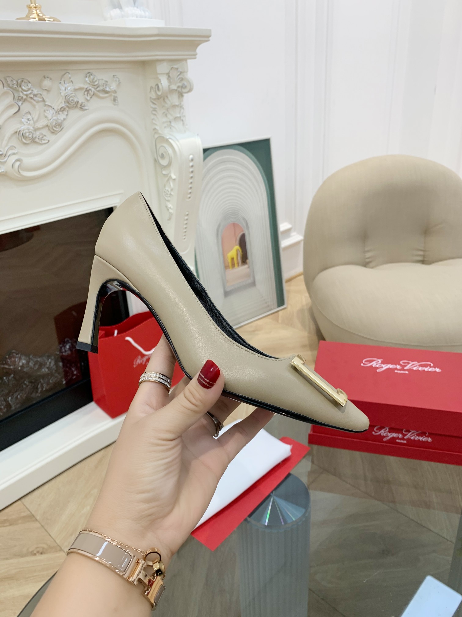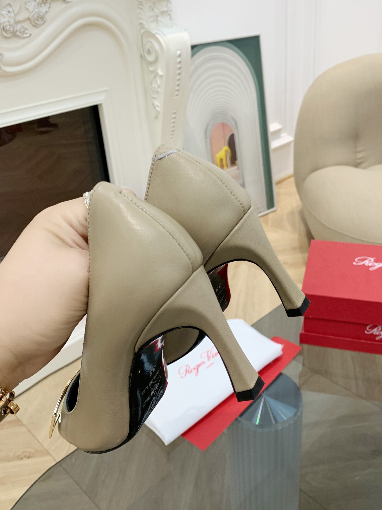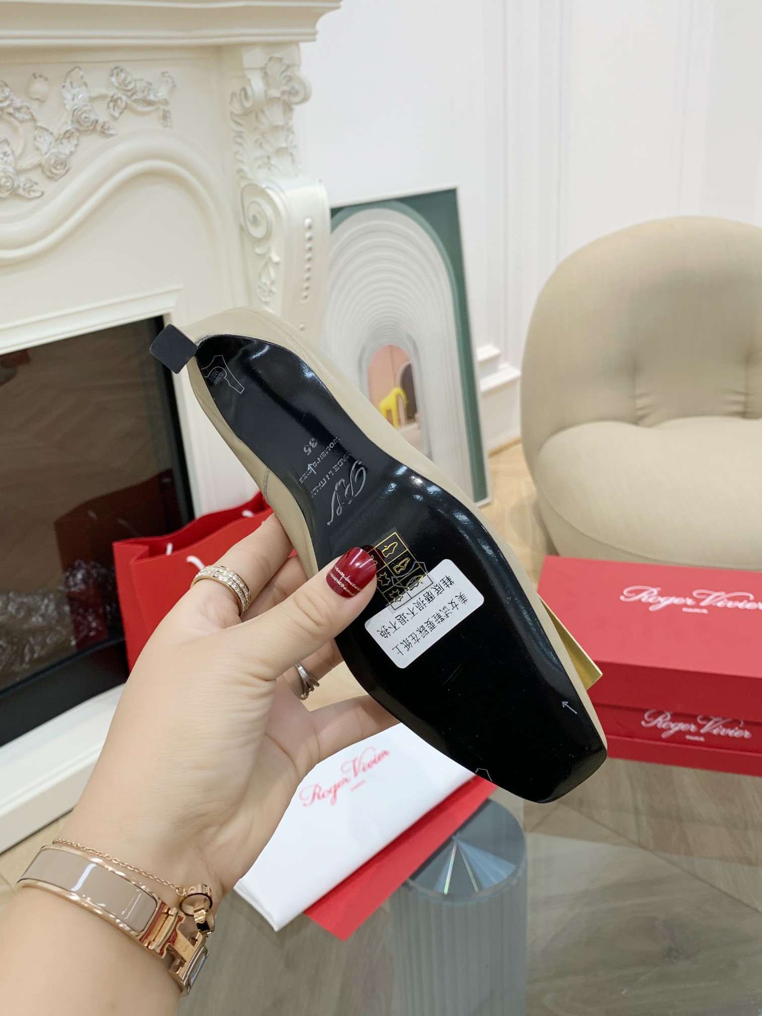 這款鞋子是AAAAA 1:1 質量(非常棒). 使用了和原版一模一樣的材料. 商標部分也保持了和羅傑維維耶/Roger Vivier一樣. 圖片拍攝是實物鞋子拍攝, 您所收到的實物保證和我們圖片一模一樣.