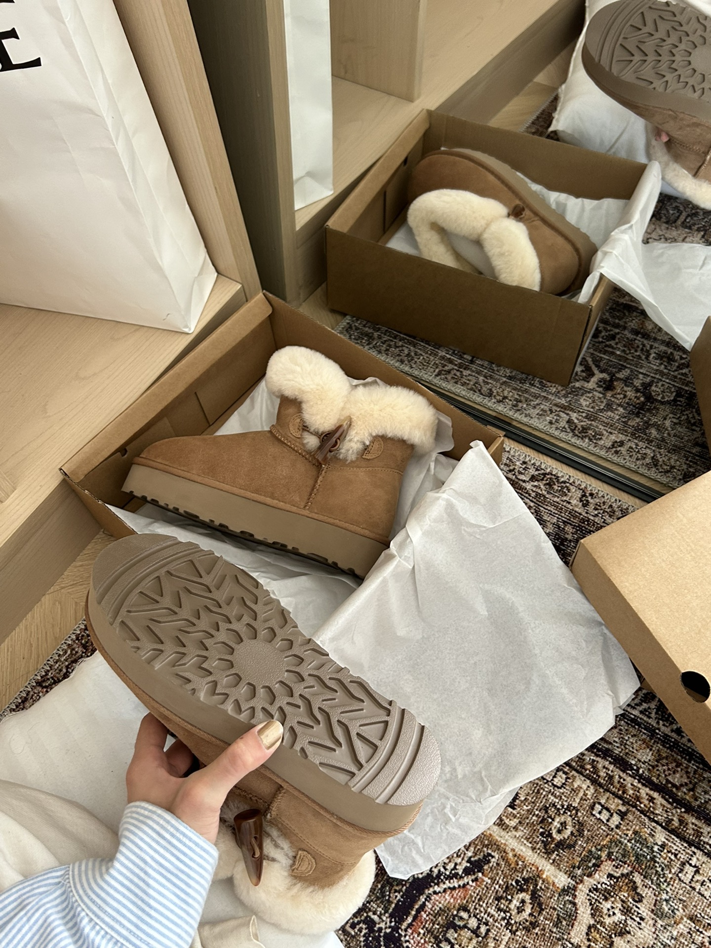 這款鞋子是AAAAA 1:1 質量(非常棒). 使用了和原版一模一樣的材料. 商標部分也保持了和UGG一樣. 圖片拍攝是實物鞋子拍攝, 您所收到的實物保證和我們圖片一模一樣.