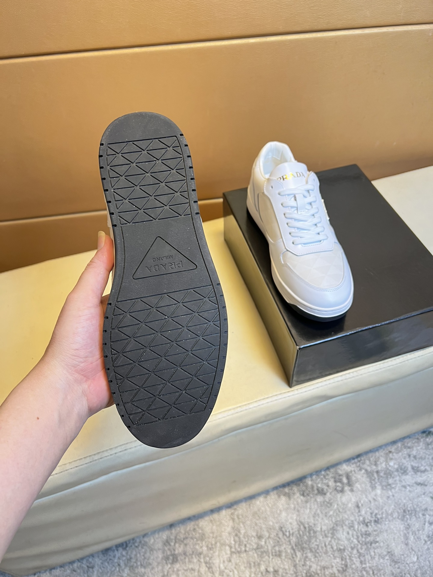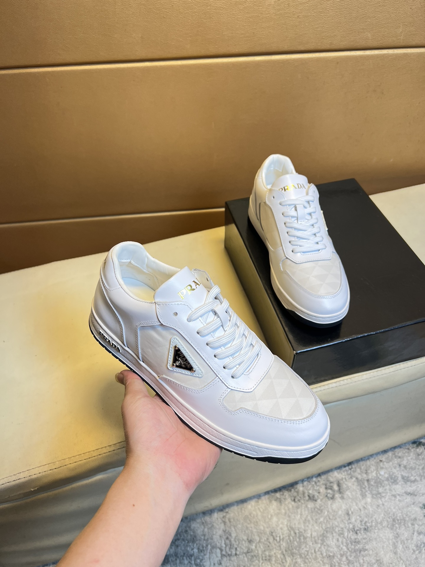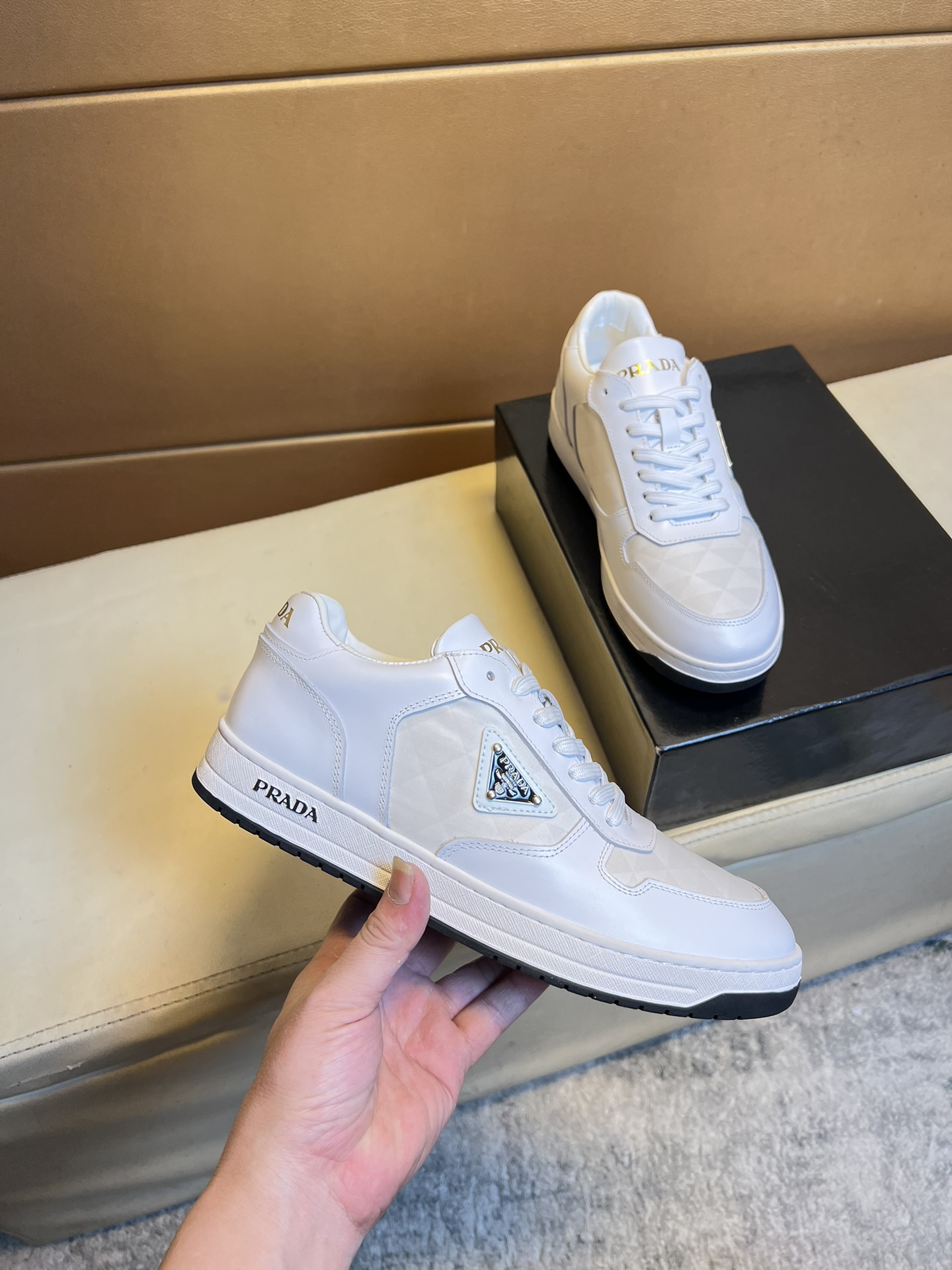 這款鞋子是AAAAA 1:1 質量(非常棒). 使用了和原版一模一樣的材料. 商標部分也保持了和普拉達/Prada一樣. 圖片拍攝是實物鞋子拍攝, 您所收到的實物保證和我們圖片一模一樣.