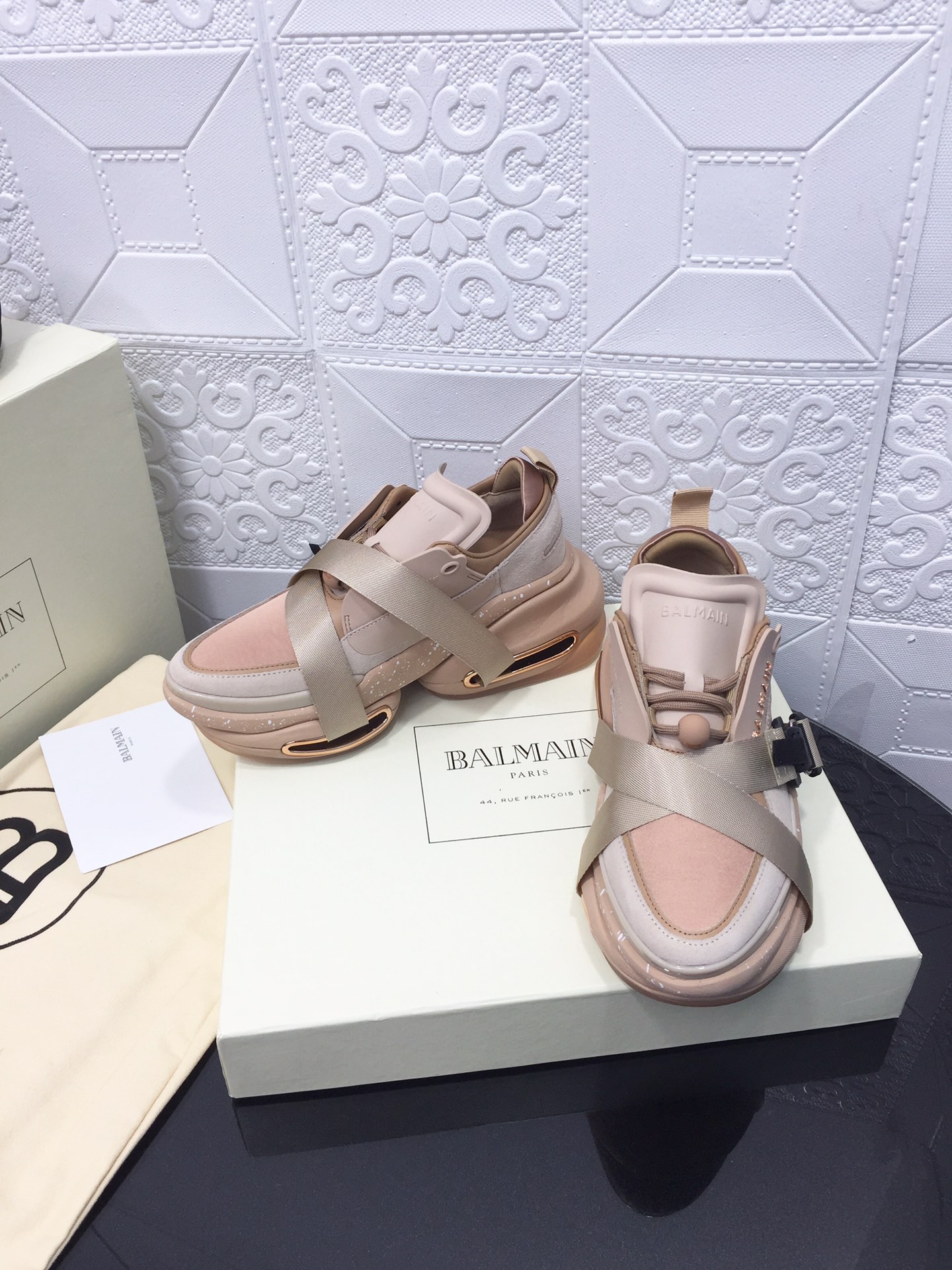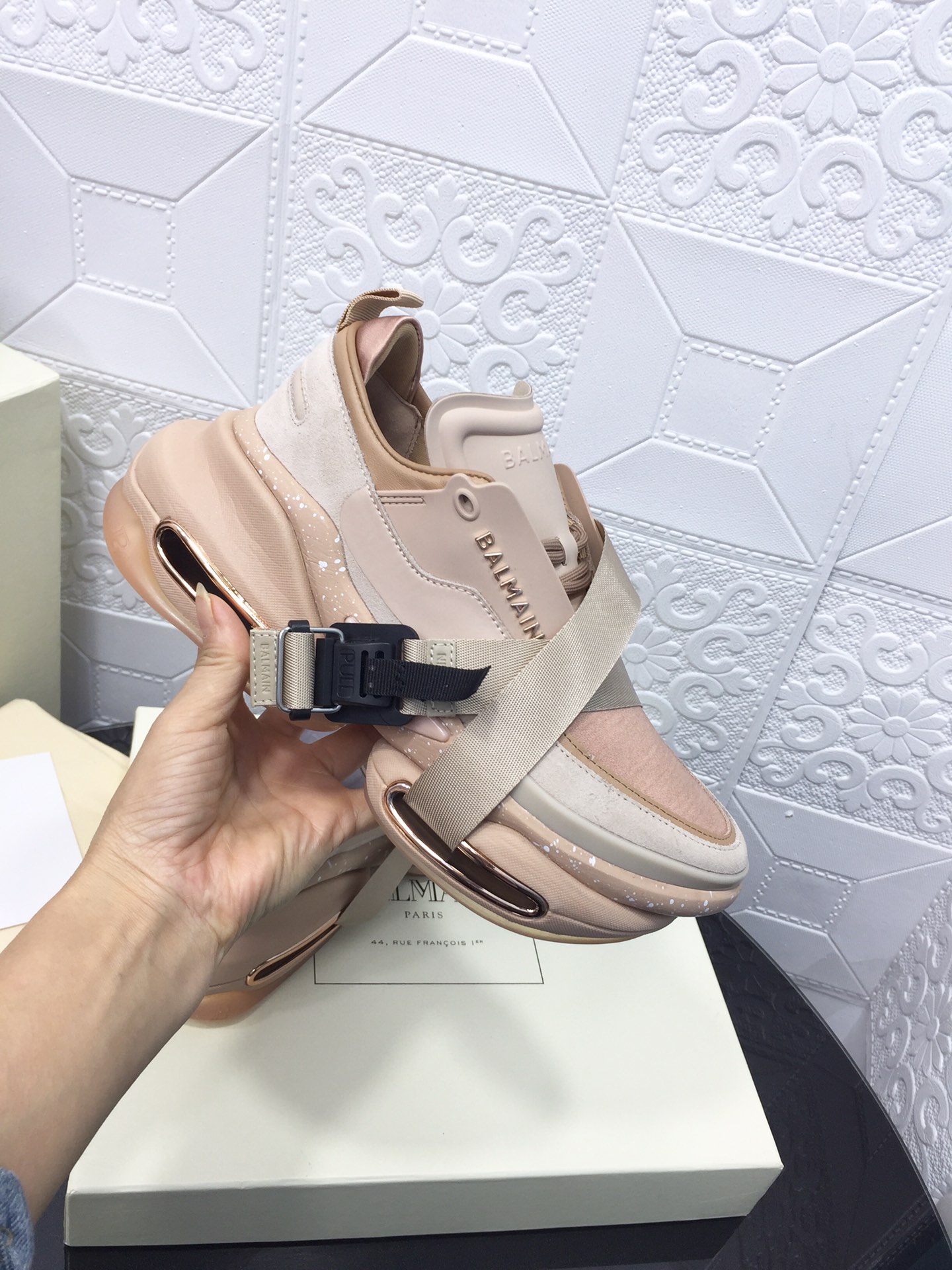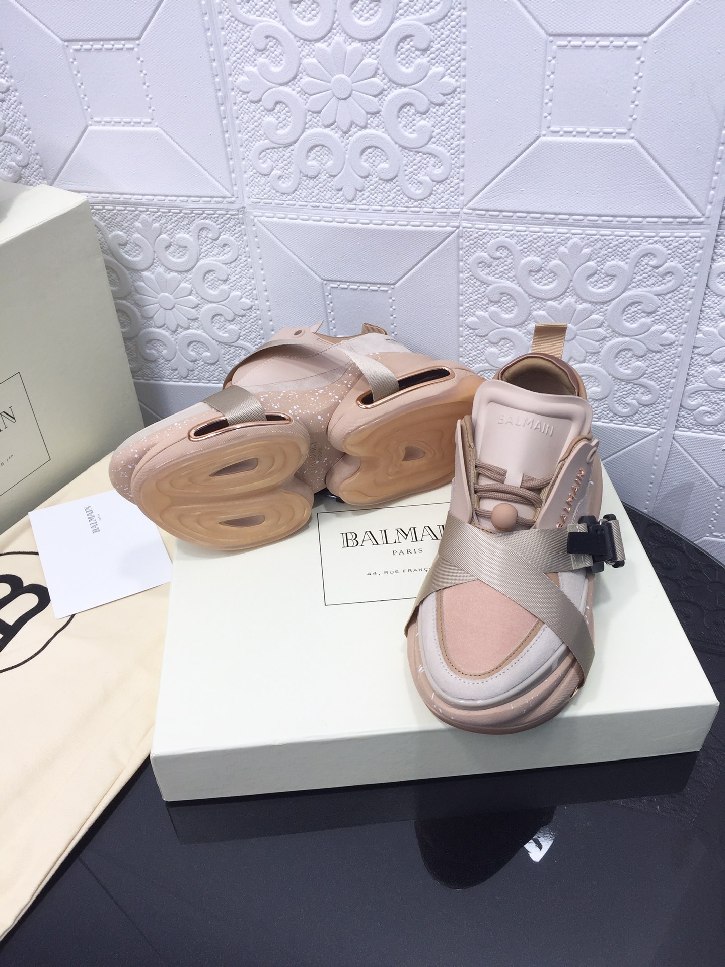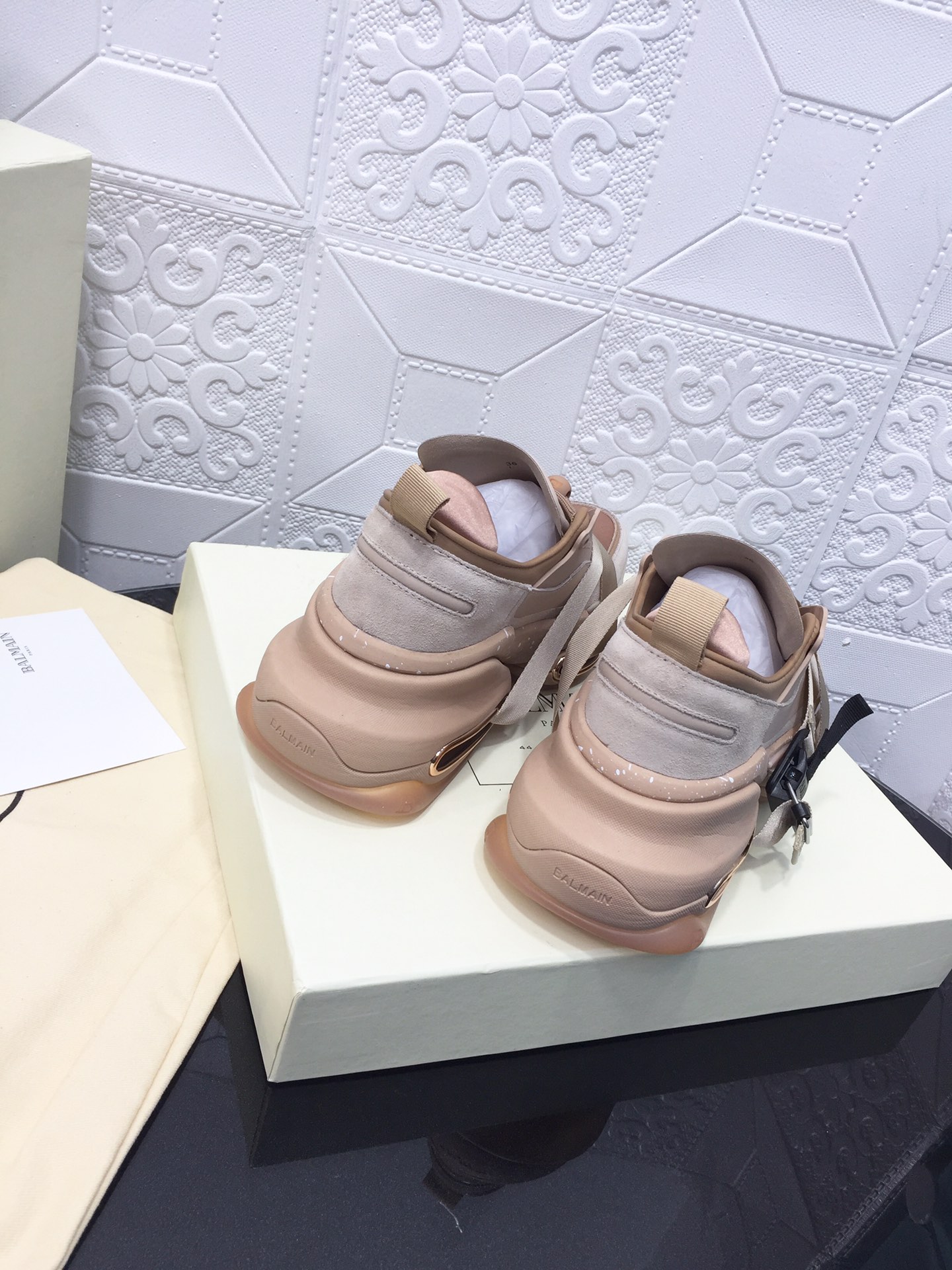 這款鞋子是AAAAA 1:1 質量(非常棒). 使用了和原版一模一樣的材料. 商標部分也保持了和巴爾曼/Balmain一樣. 圖片拍攝是實物鞋子拍攝, 您所收到的實物保證和我們圖片一模一樣.