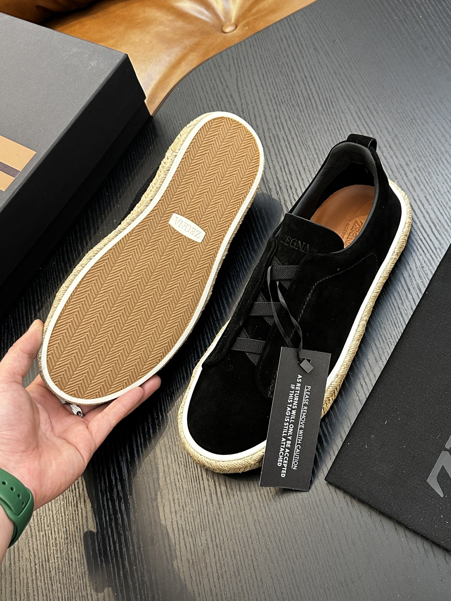這款鞋子是AAAAA 1:1 質量(非常棒). 使用了和原版一模一樣的材料. 商標部分也保持了和Zegna一樣. 圖片拍攝是實物鞋子拍攝, 您所收到的實物保證和我們圖片一模一樣.