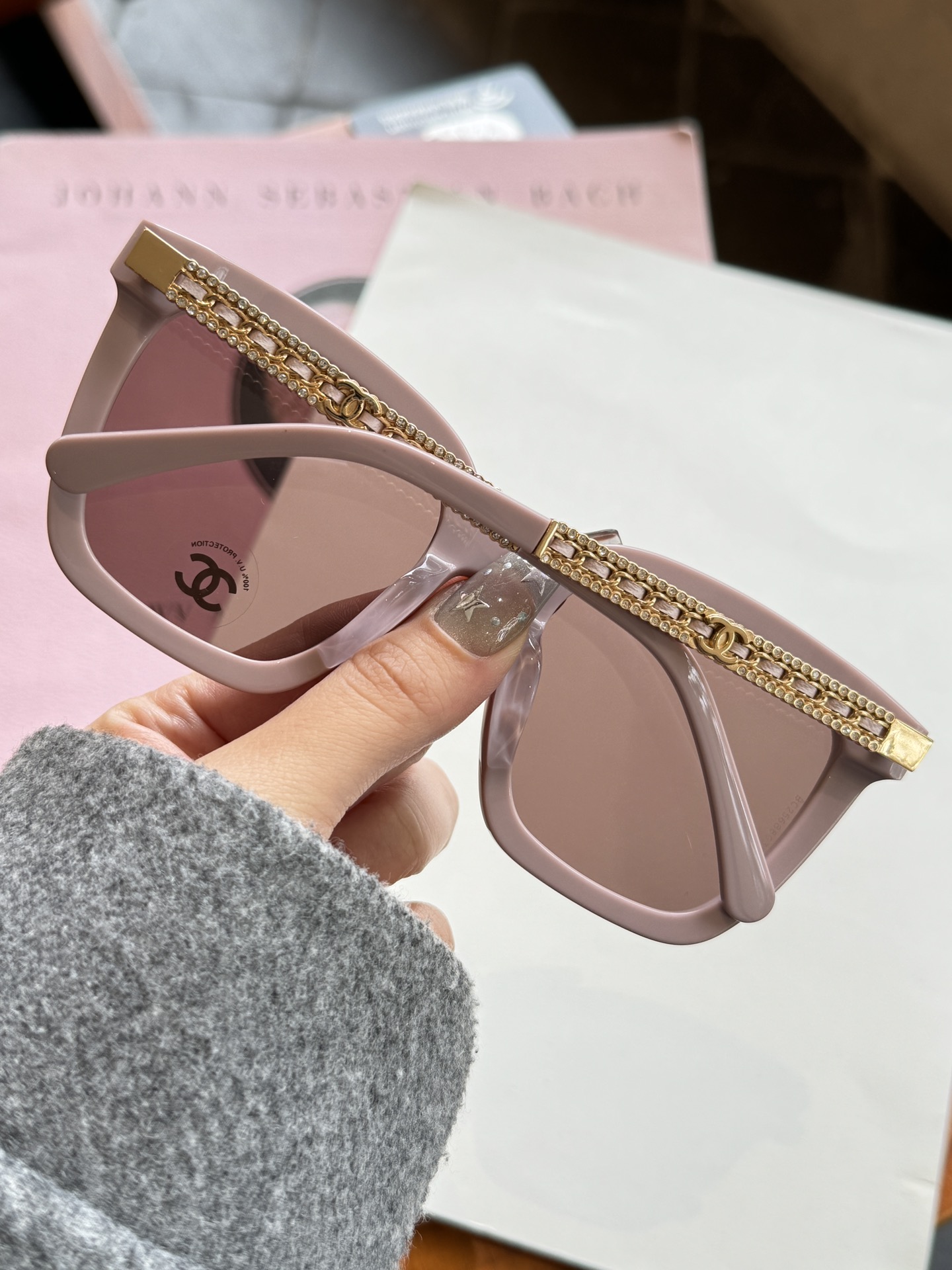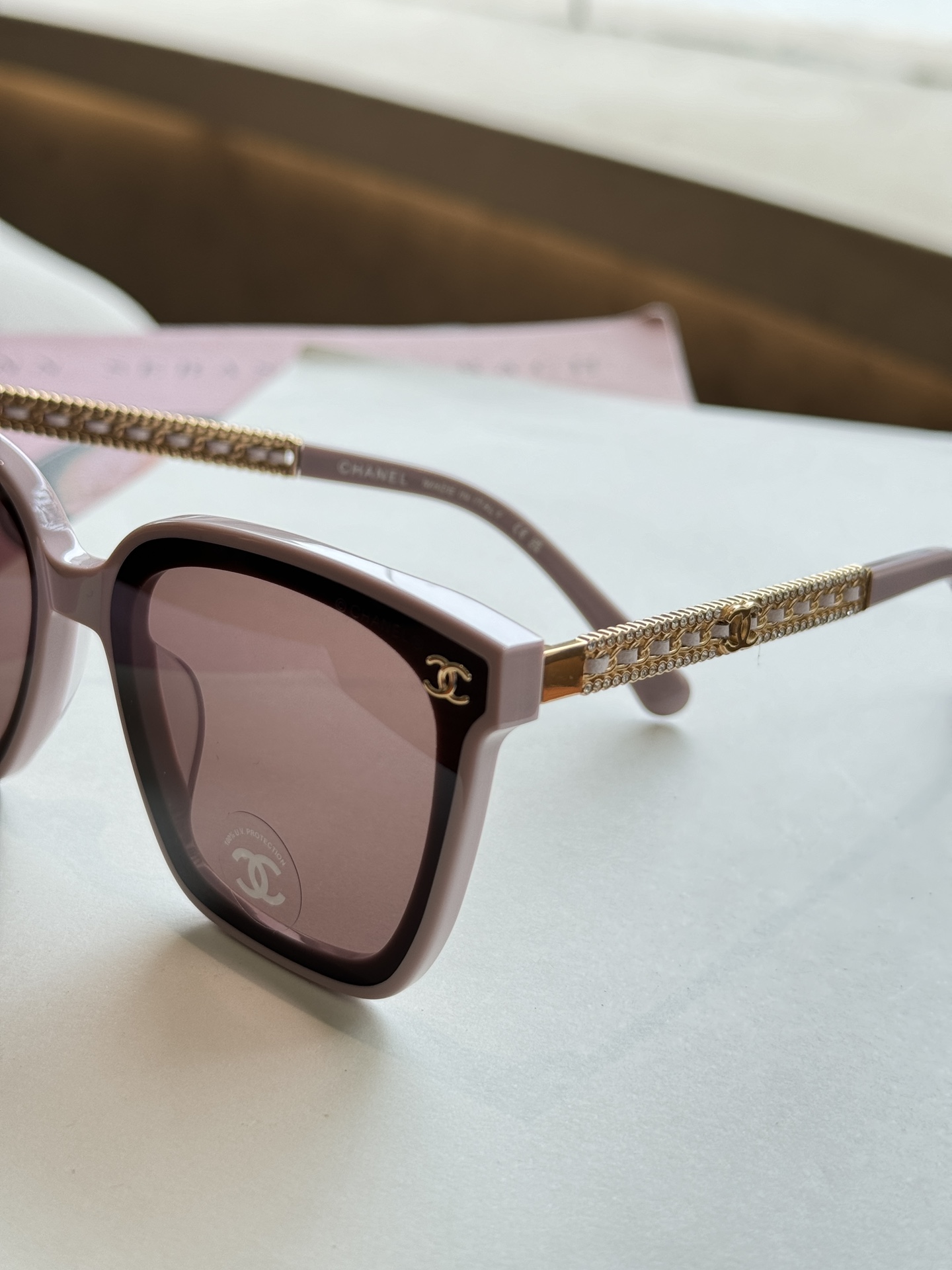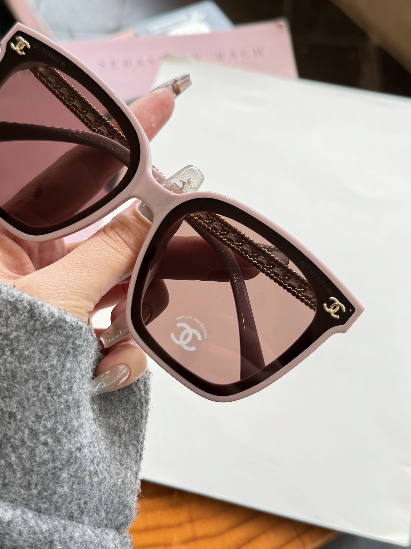 這款太陽眼鏡是AAAAA 1:1 質量(非常棒). 使用了和原版一模一樣的材料. 商標部分也保持了和香奈兒/Chanel一樣. 圖片拍攝是實物太陽眼鏡拍攝, 您所收到的實物保證和我們圖片一模一樣.