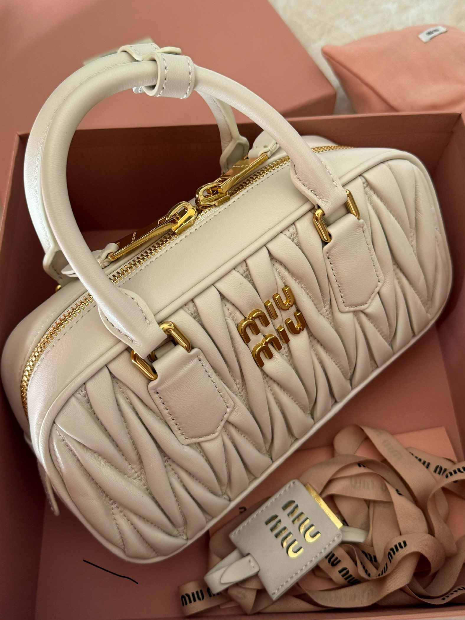 這款包包是AAAAA 1:1 質量(非常棒). 使用了和原版一模一樣的材料. 商標部分也保持了和繆繆/Miu Miu一樣. 圖片拍攝是實物包包拍攝, 您所收到的實物保證和我們圖片一模一樣.