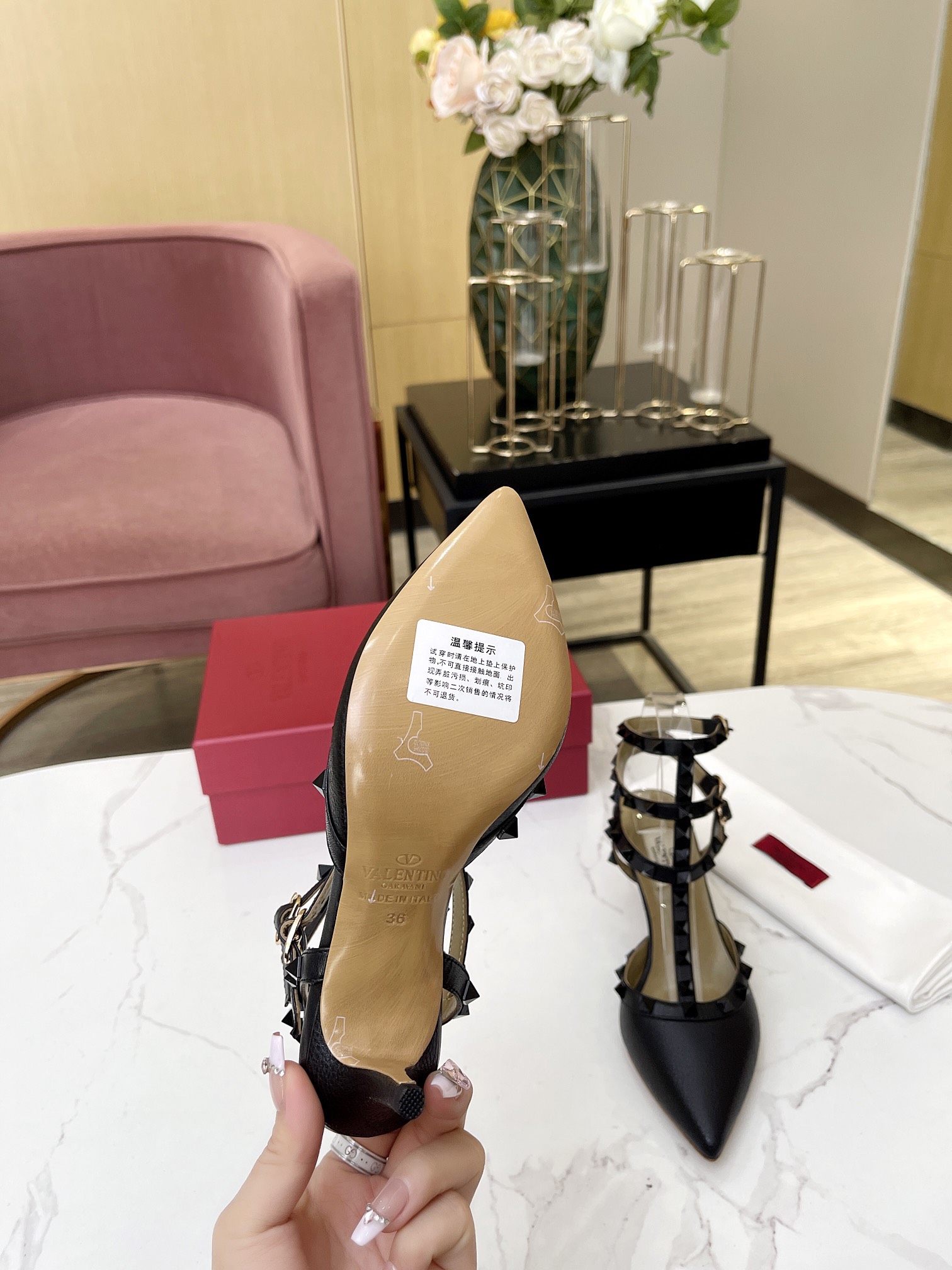 這款鞋子是AAAAA 1:1 質量(非常棒). 使用了和原版一模一樣的材料. 商標部分也保持了和瓦倫蒂諾/Valentino一樣. 圖片拍攝是實物鞋子拍攝, 您所收到的實物保證和我們圖片一模一樣.