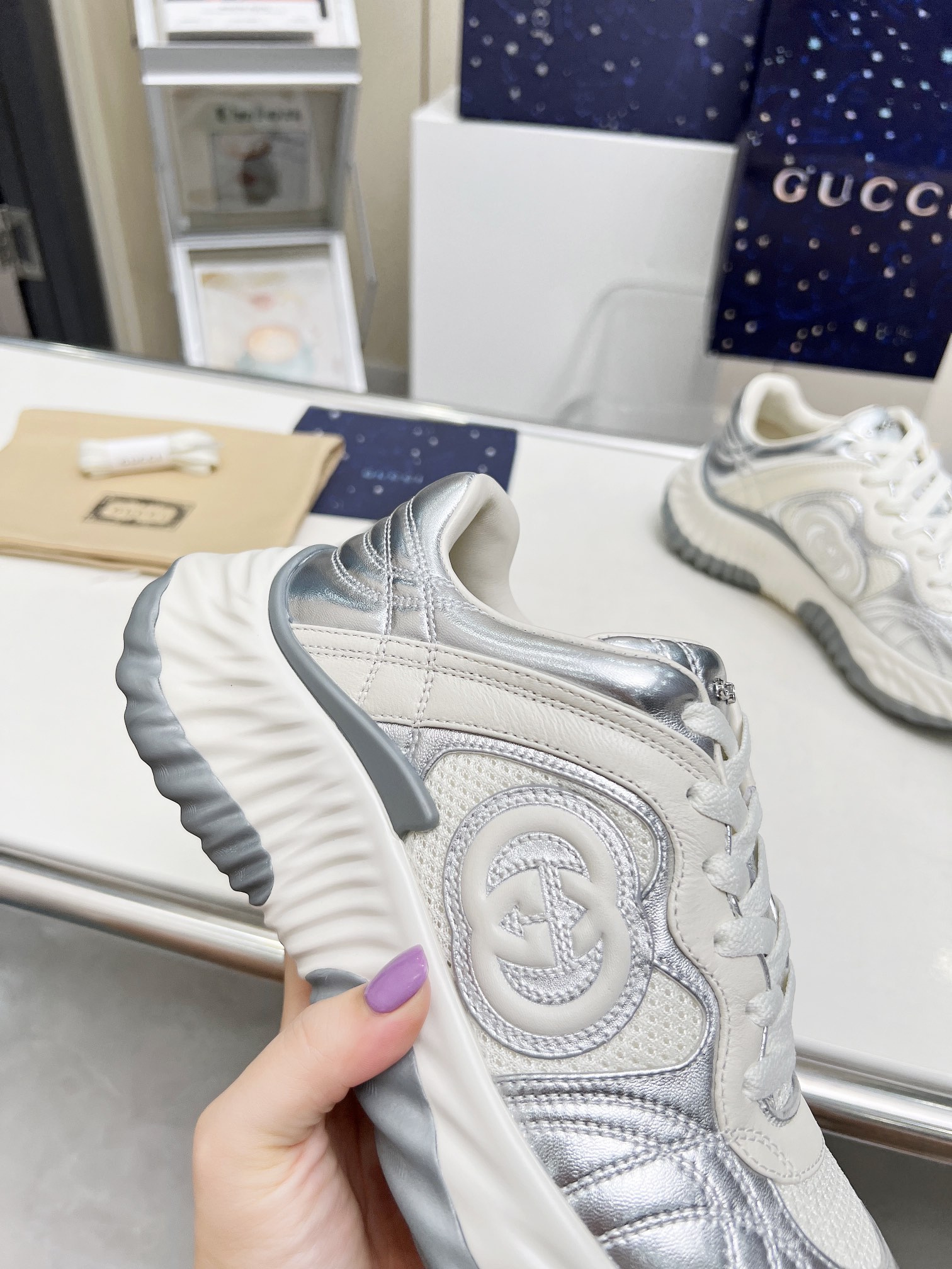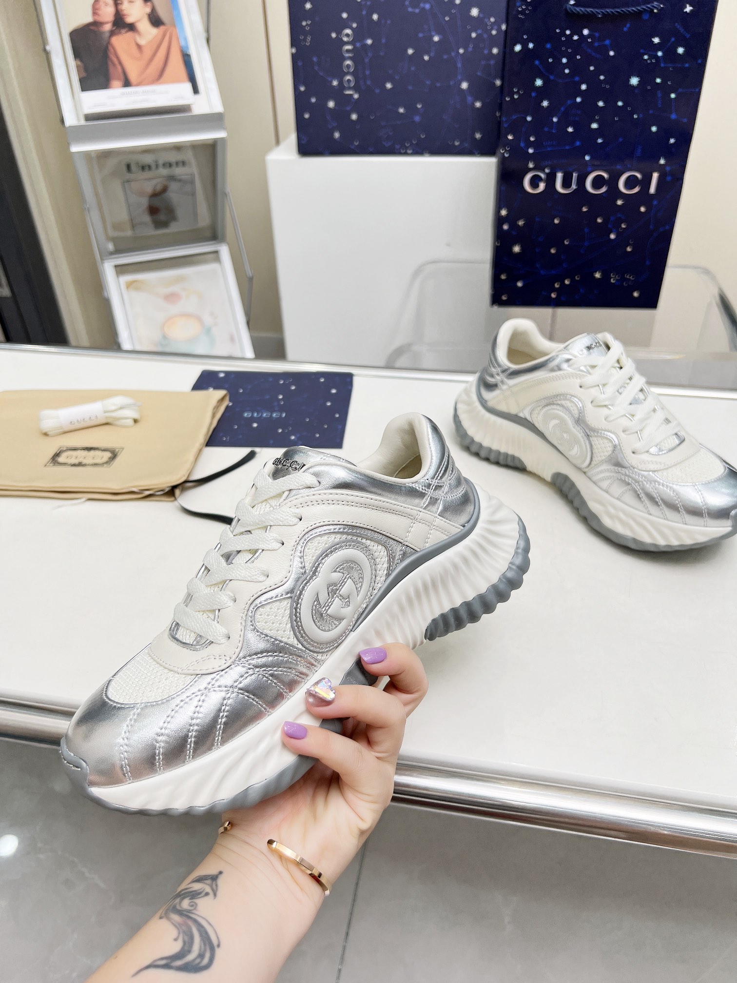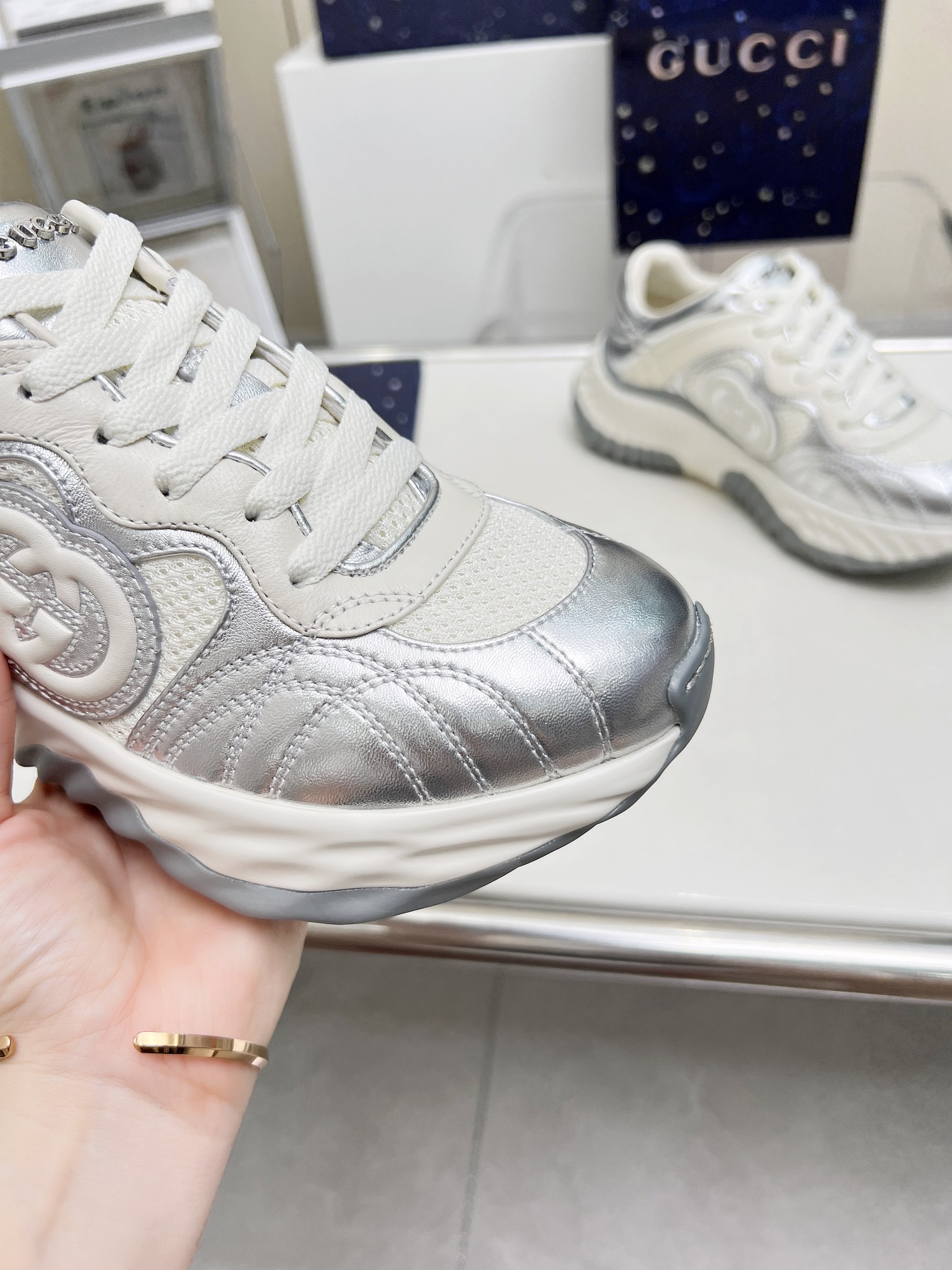 這款鞋子是AAAAA 1:1 質量(非常棒). 使用了和原版一模一樣的材料. 商標部分也保持了和古奇/Gucci一樣. 圖片拍攝是實物鞋子拍攝, 您所收到的實物保證和我們圖片一模一樣.