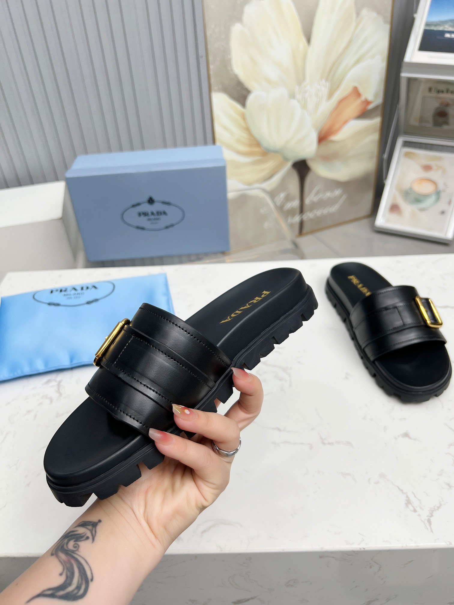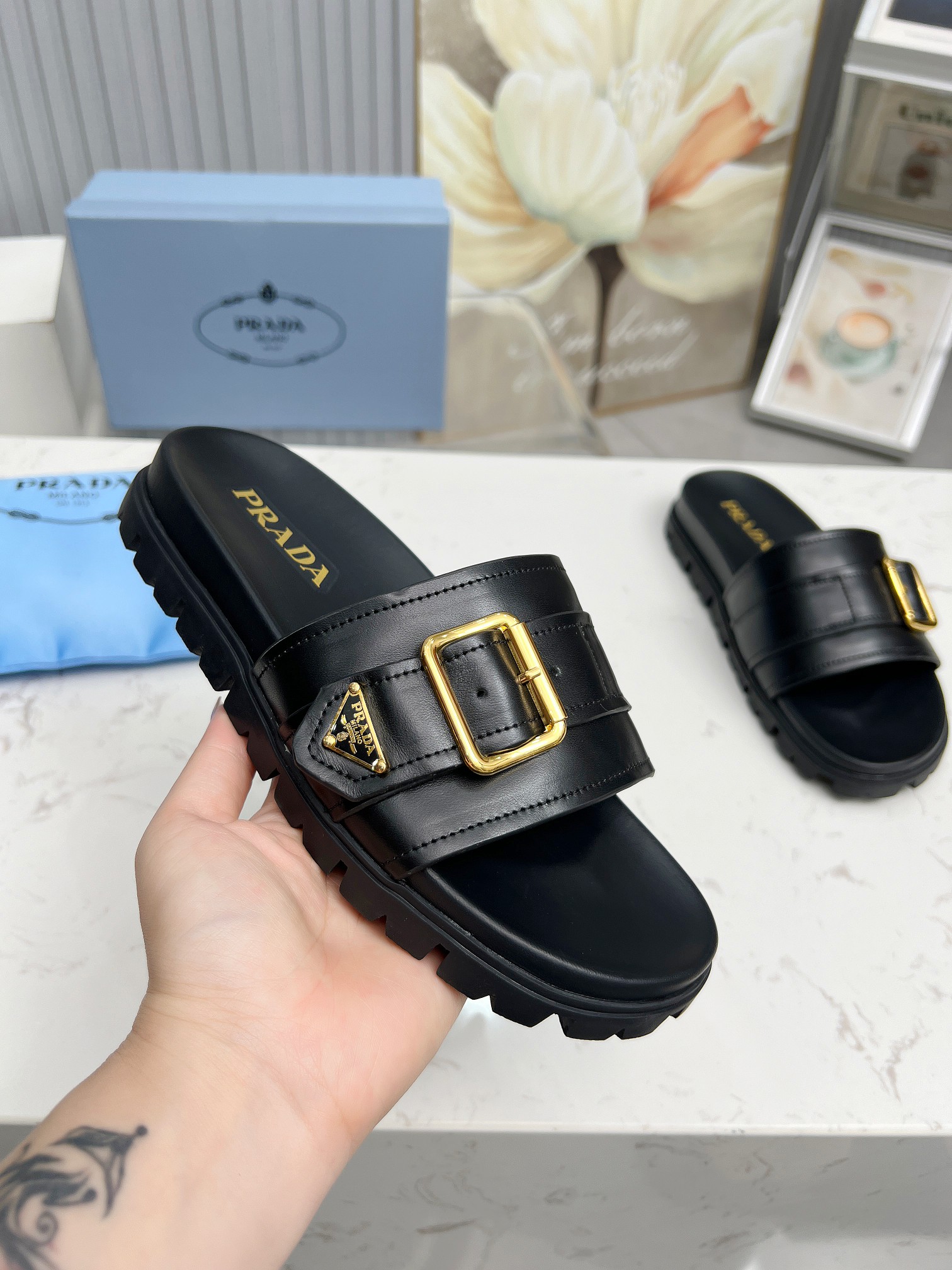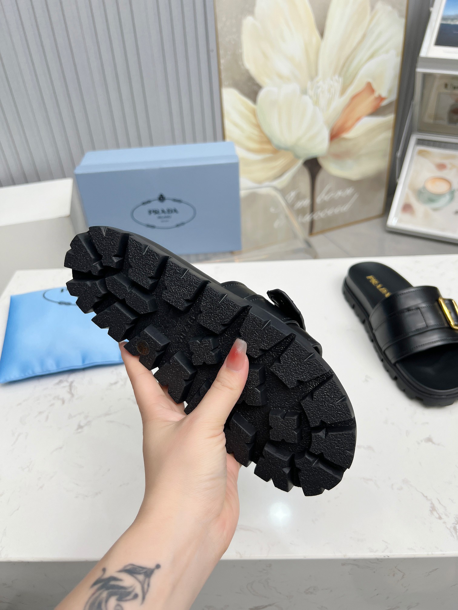這款鞋子是AAAAA 1:1 質量(非常棒). 使用了和原版一模一樣的材料. 商標部分也保持了和普拉達/Prada一樣. 圖片拍攝是實物鞋子拍攝, 您所收到的實物保證和我們圖片一模一樣.