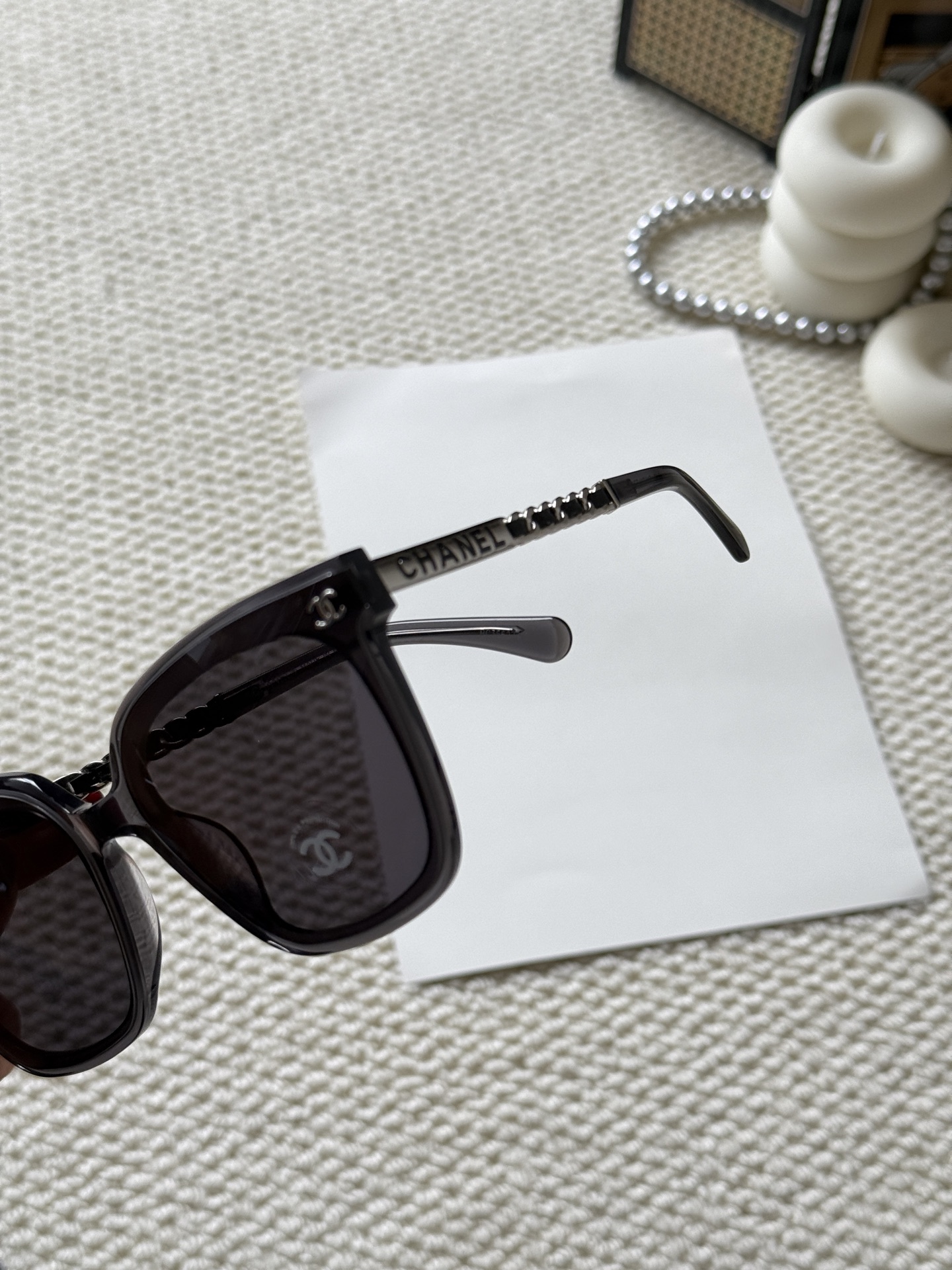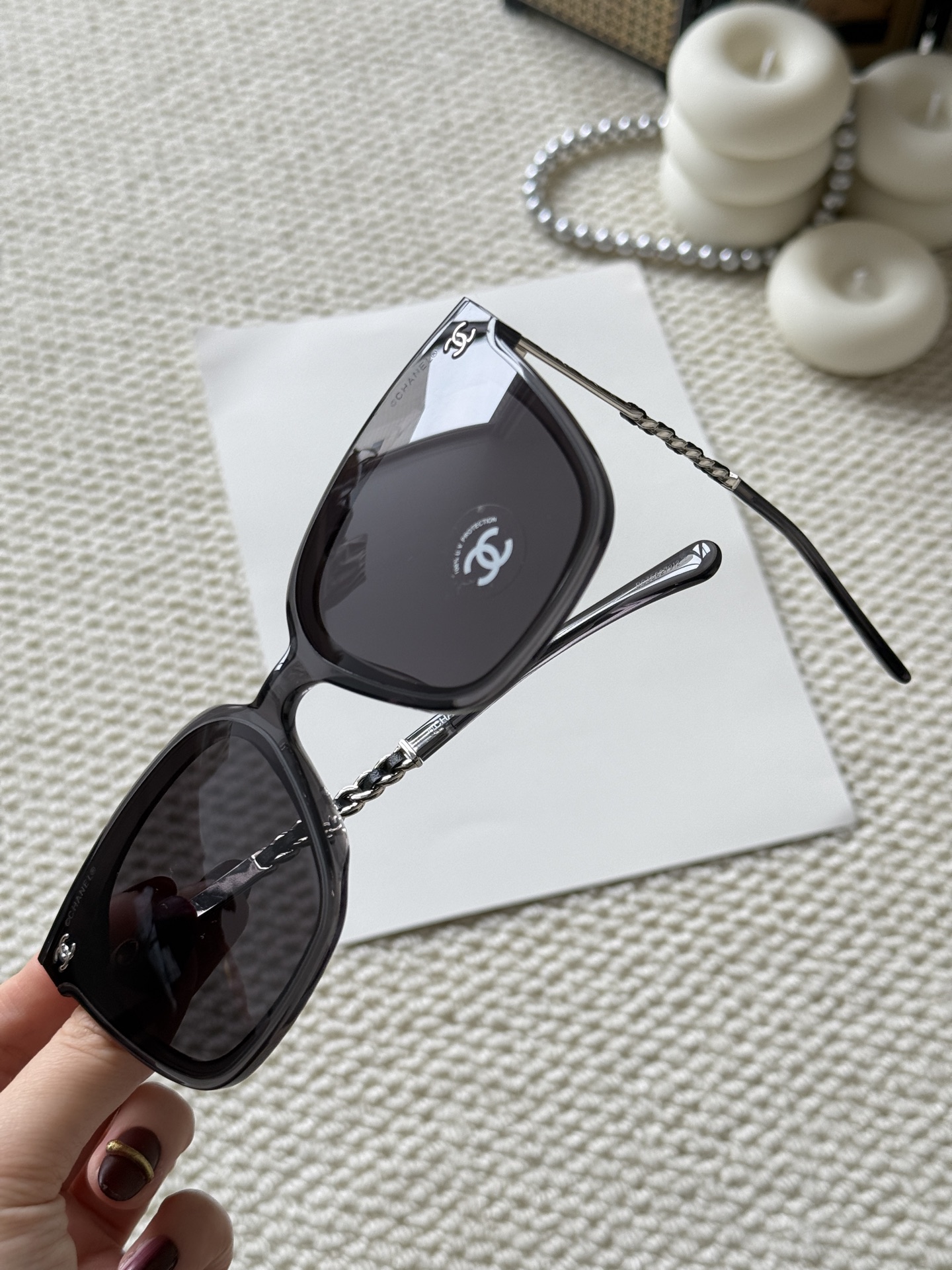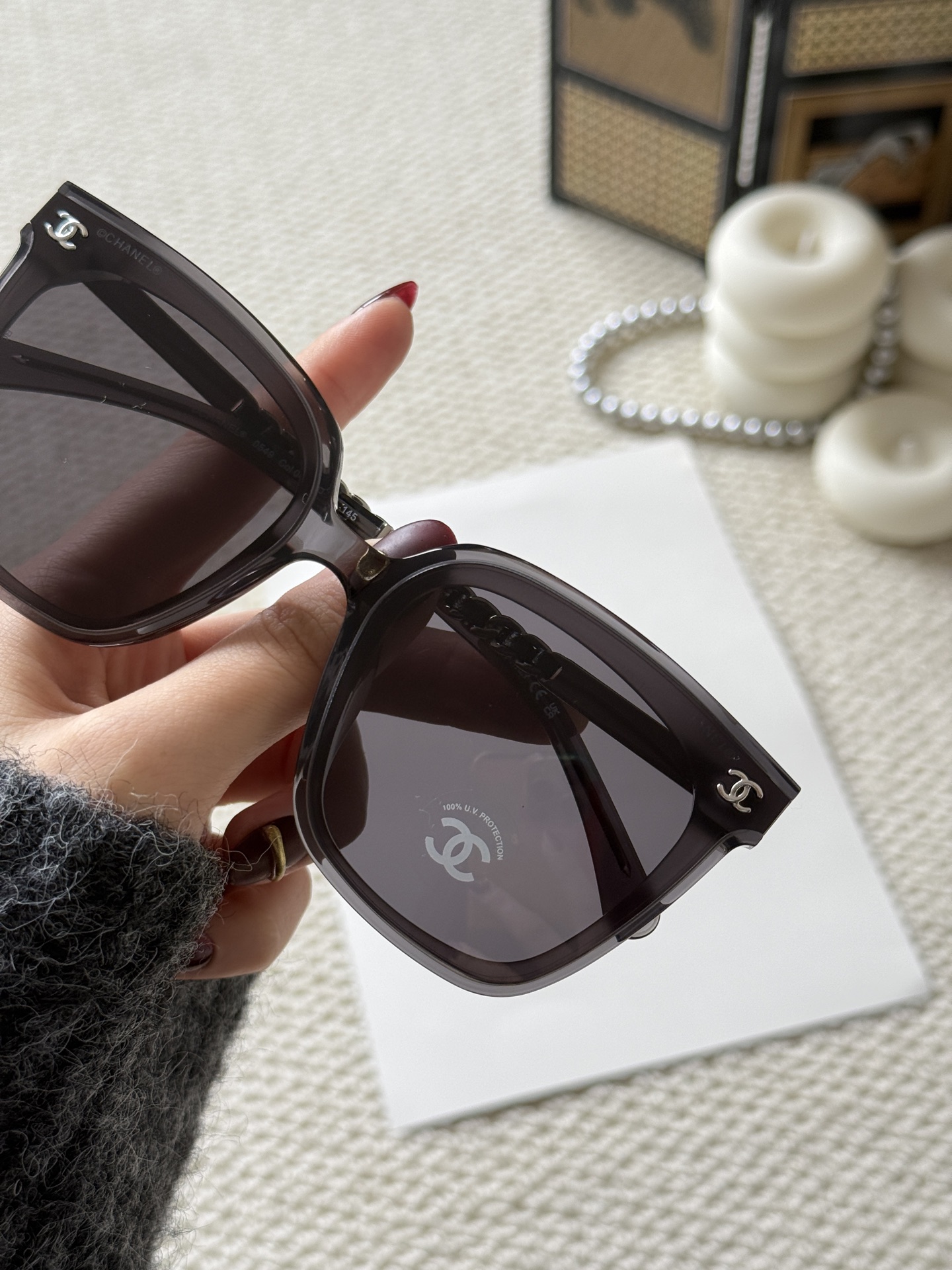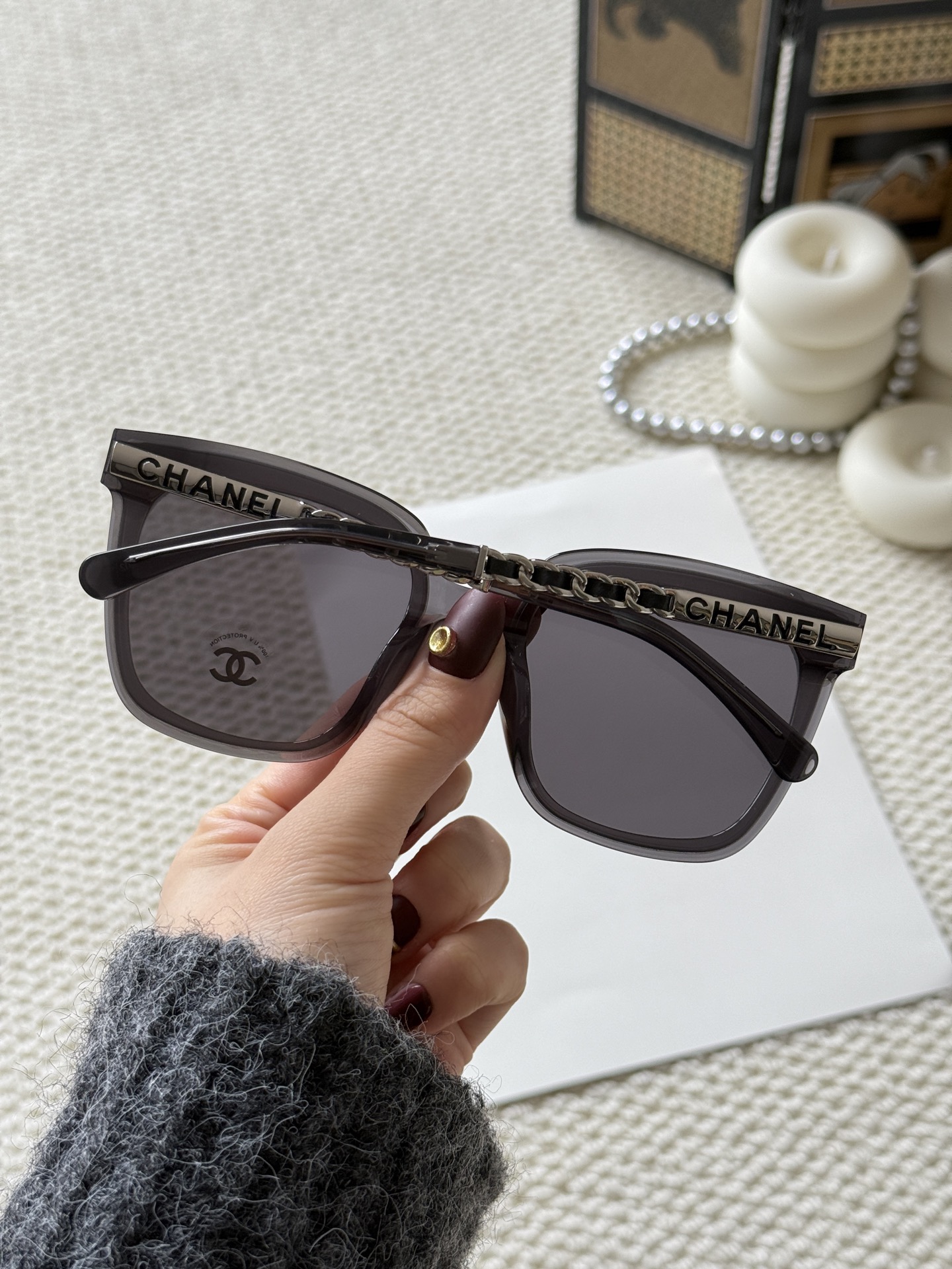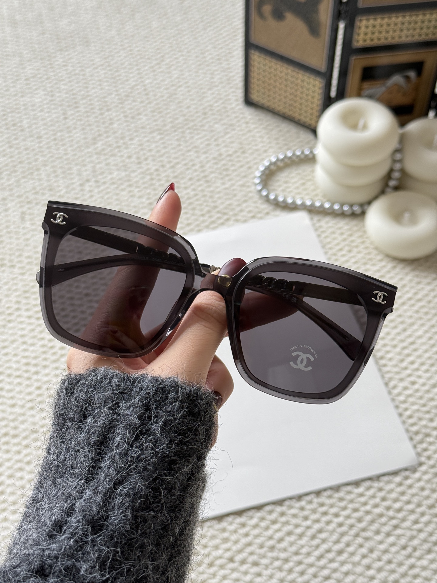 這款太陽眼鏡是AAAAA 1:1 質量(非常棒). 使用了和原版一模一樣的材料. 商標部分也保持了和香奈兒/Chanel一樣. 圖片拍攝是實物太陽眼鏡拍攝, 您所收到的實物保證和我們圖片一模一樣.