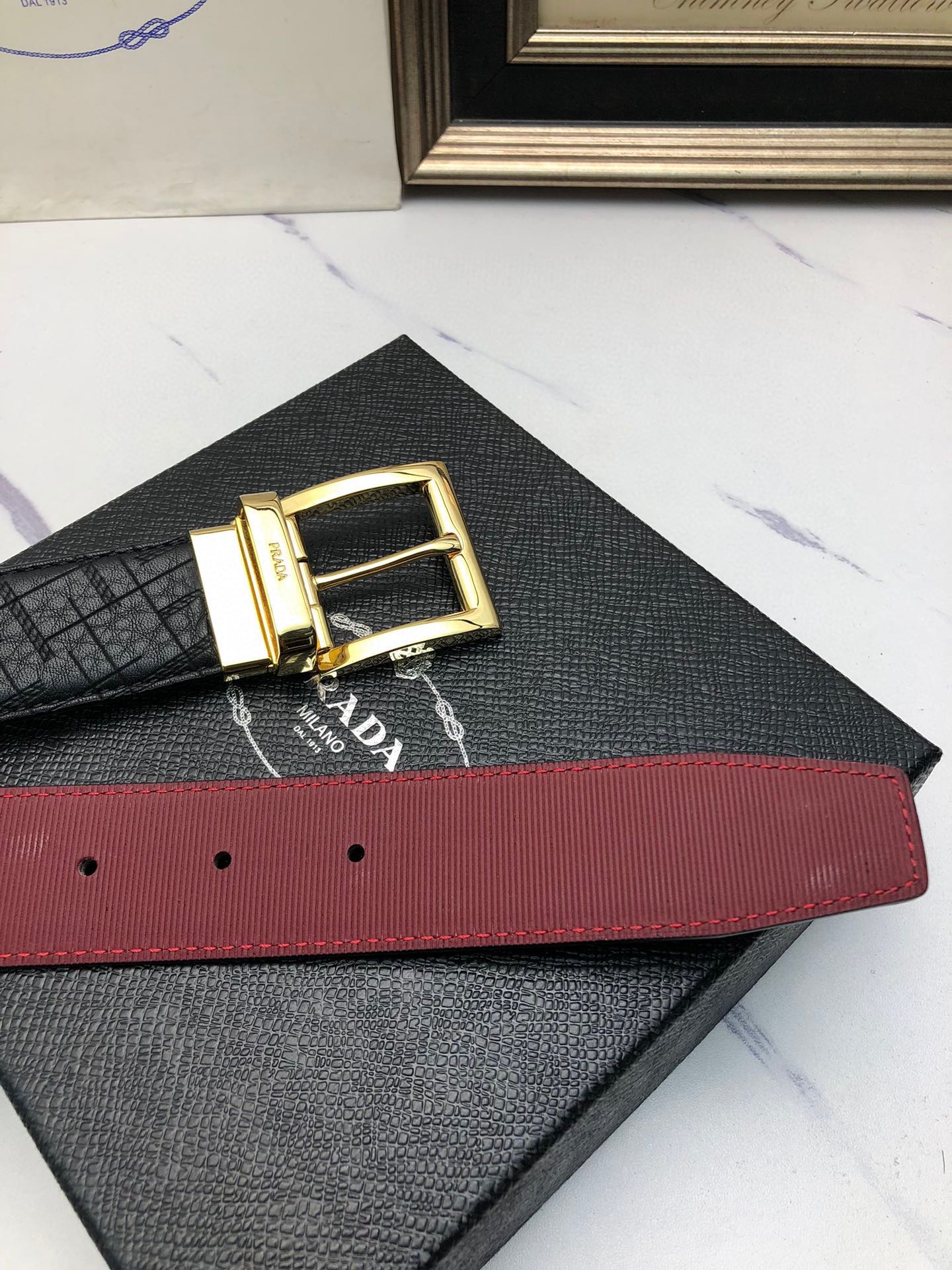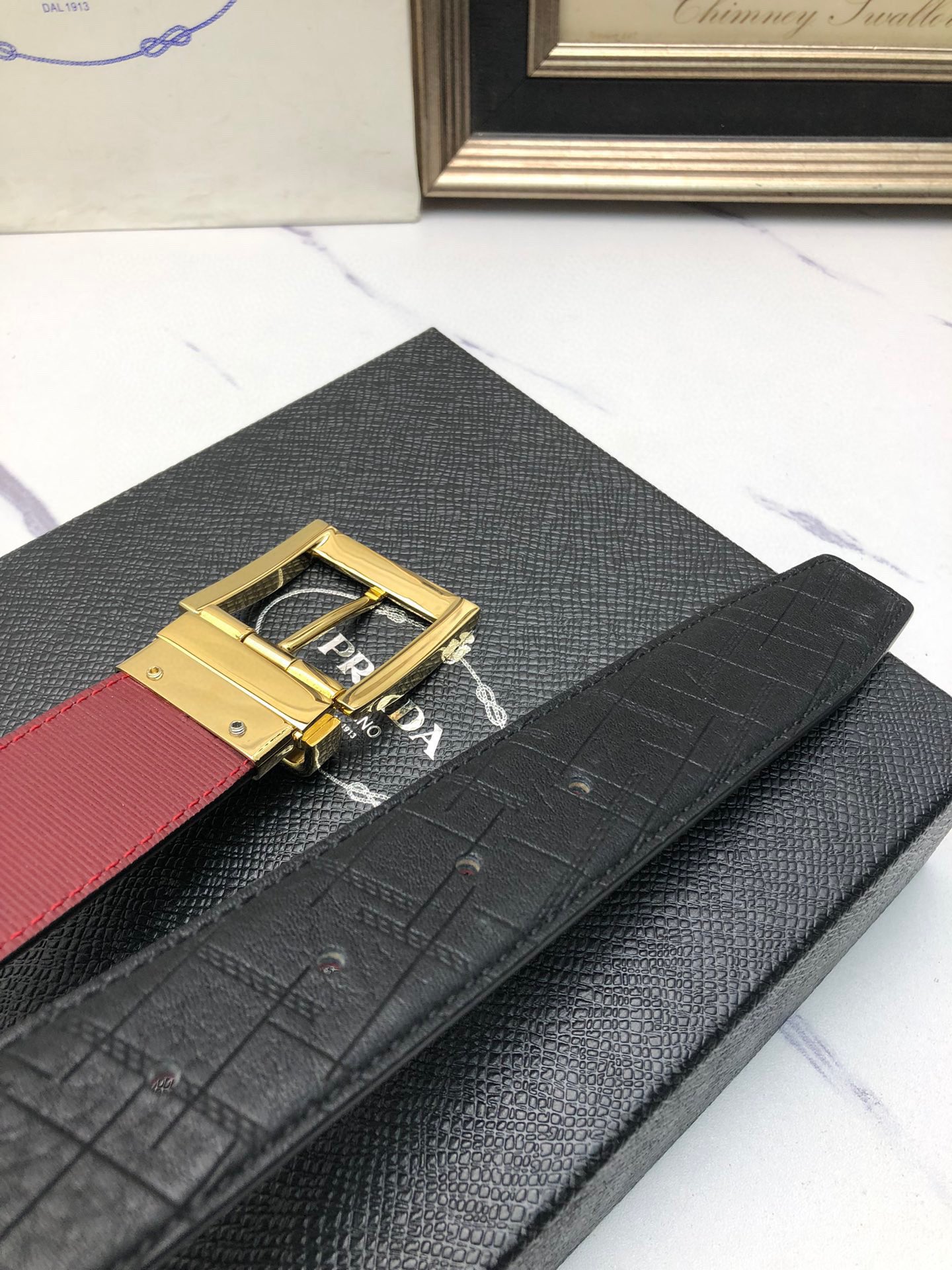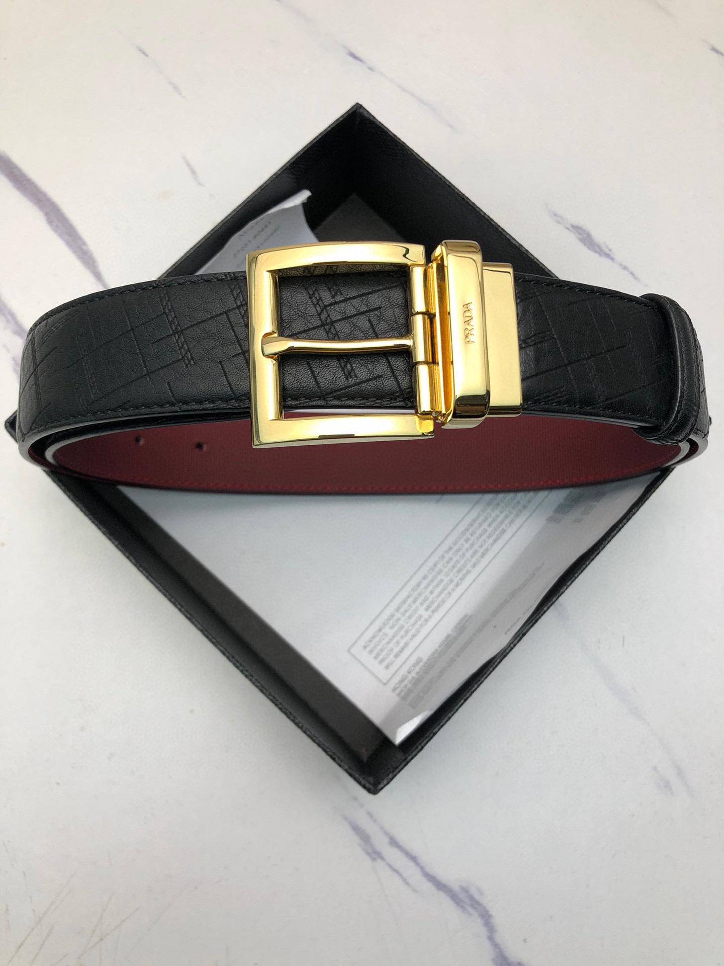 這款皮帶是AAAAA 1:1 質量(非常棒). 使用了和原版一模一樣的材料. 商標部分也保持了和普拉達/Prada一樣. 圖片拍攝是實物皮帶拍攝, 您所收到的實物保證和我們圖片一模一樣.