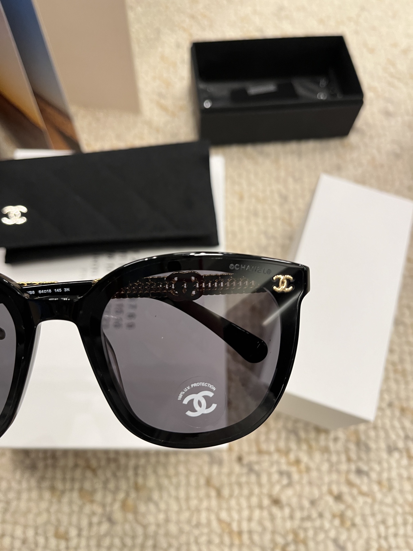 這款太陽眼鏡是AAAAA 1:1 質量(非常棒). 使用了和原版一模一樣的材料. 商標部分也保持了和香奈兒/Chanel一樣. 圖片拍攝是實物太陽眼鏡拍攝, 您所收到的實物保證和我們圖片一模一樣.