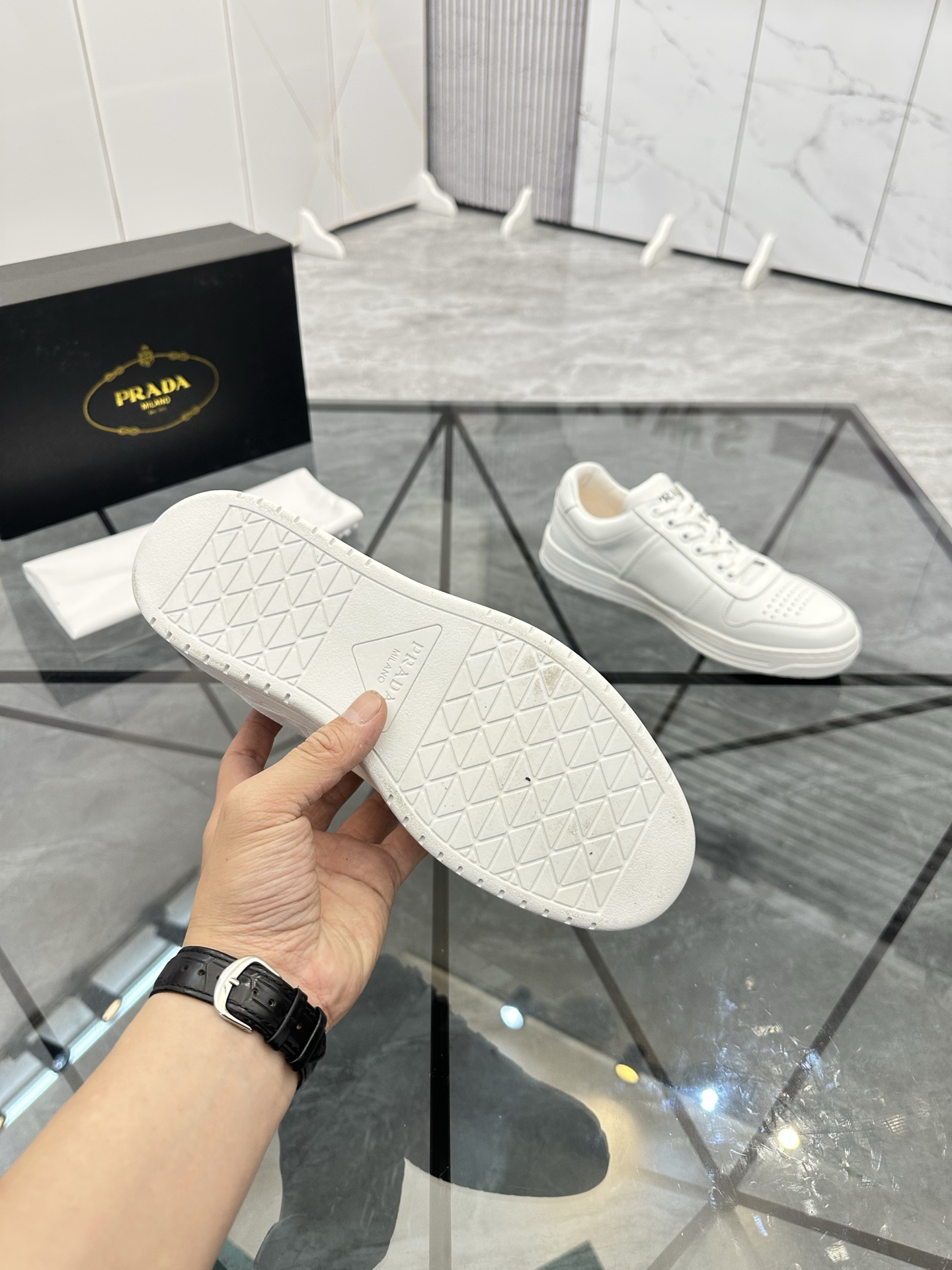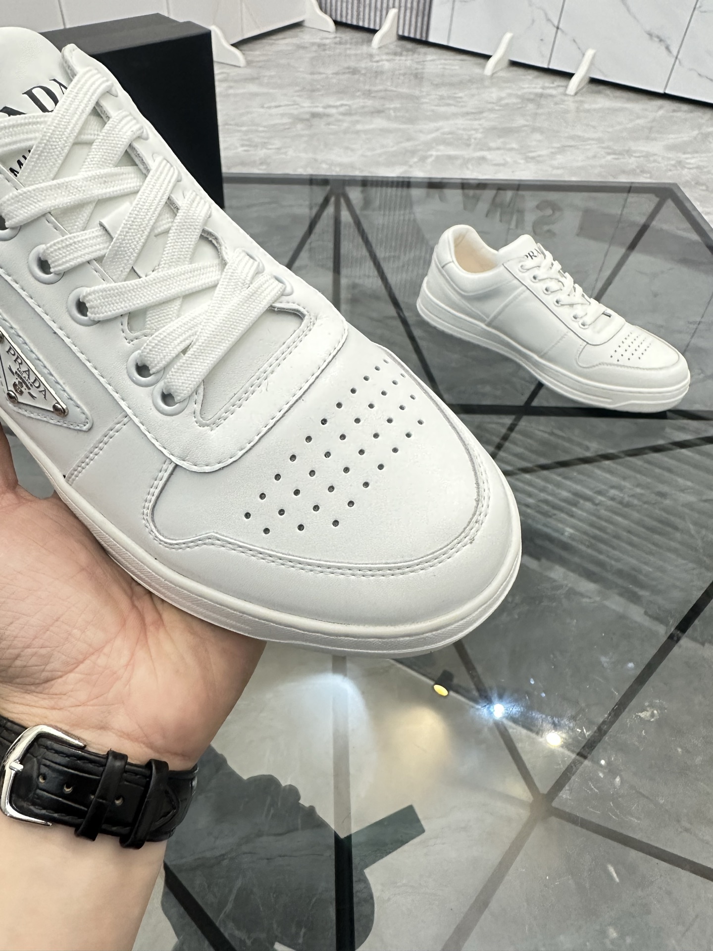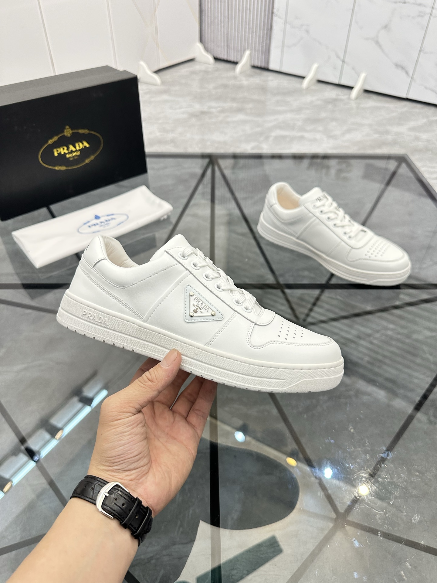 這款鞋子是AAAAA 1:1 質量(非常棒). 使用了和原版一模一樣的材料. 商標部分也保持了和普拉達/Prada一樣. 圖片拍攝是實物鞋子拍攝, 您所收到的實物保證和我們圖片一模一樣.