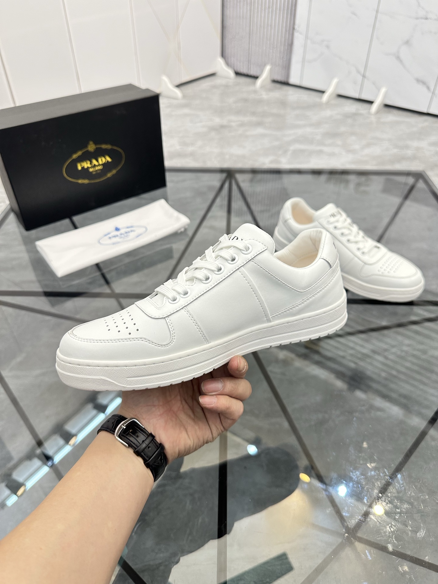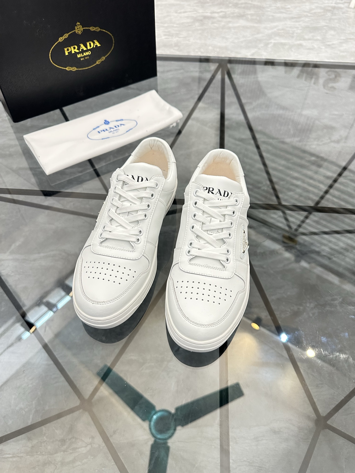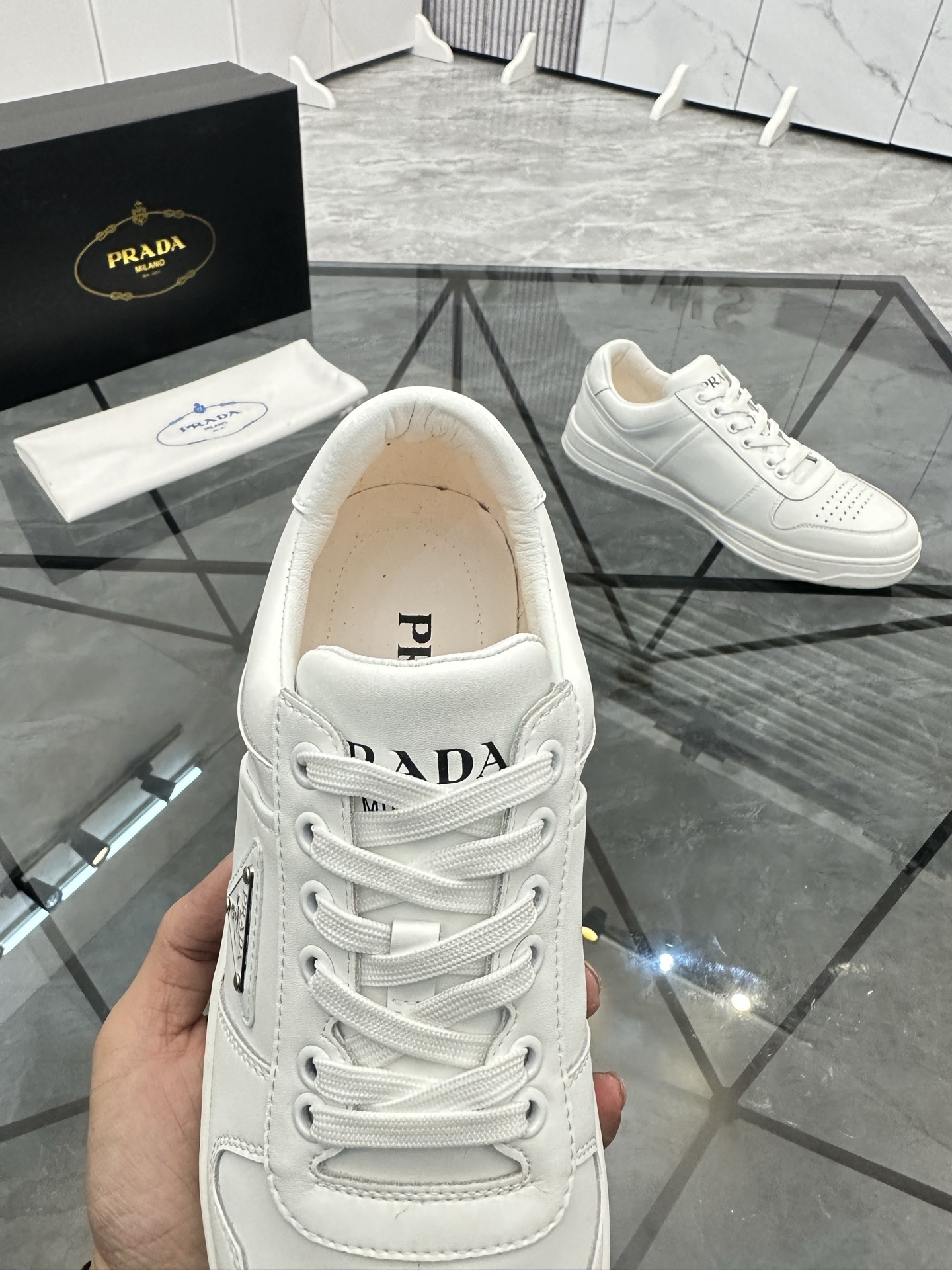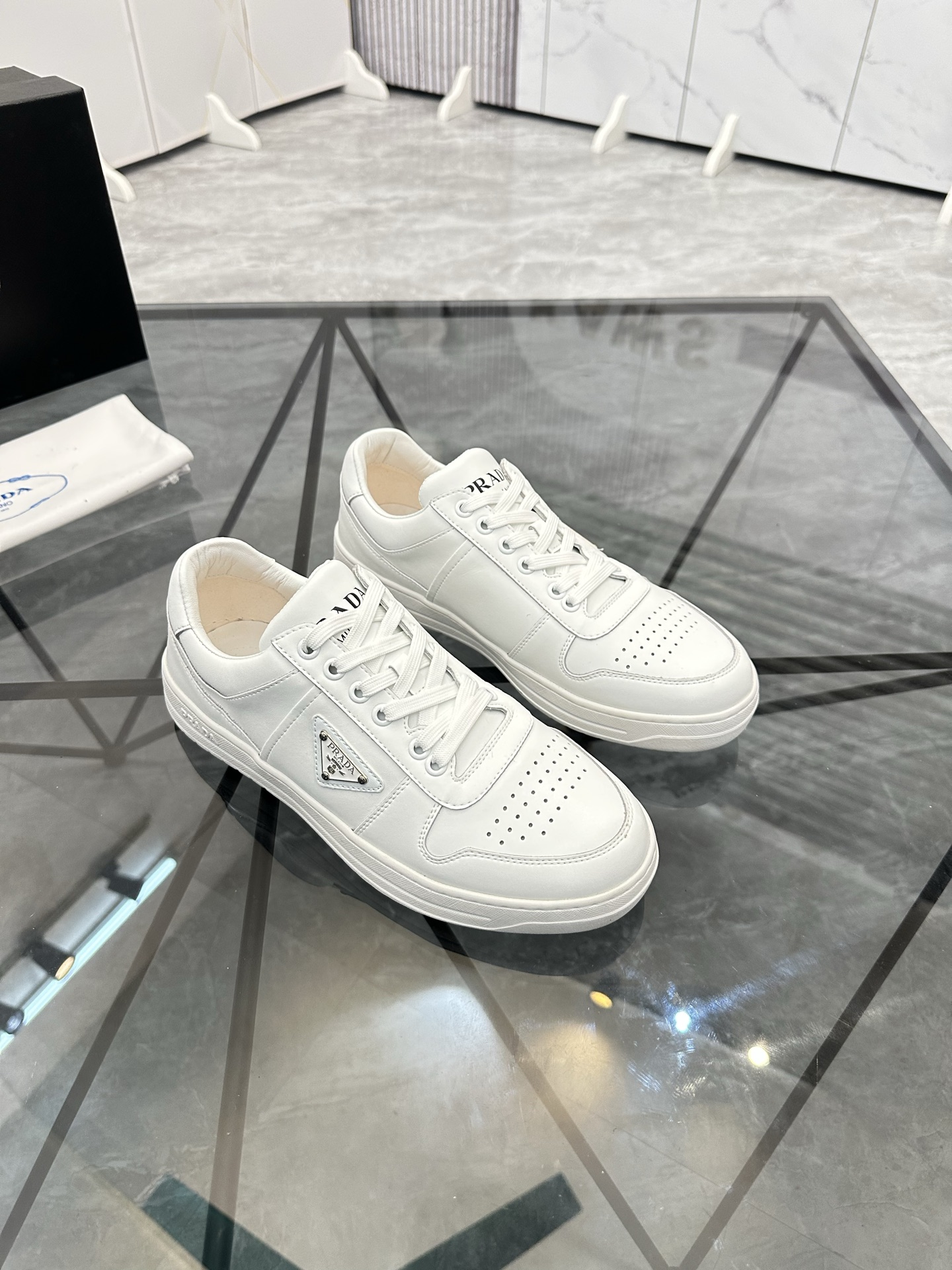 這款鞋子是AAAAA 1:1 質量(非常棒). 使用了和原版一模一樣的材料. 商標部分也保持了和普拉達/Prada一樣. 圖片拍攝是實物鞋子拍攝, 您所收到的實物保證和我們圖片一模一樣.