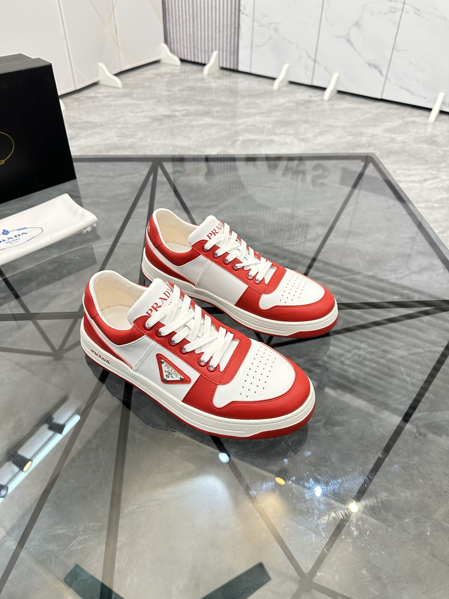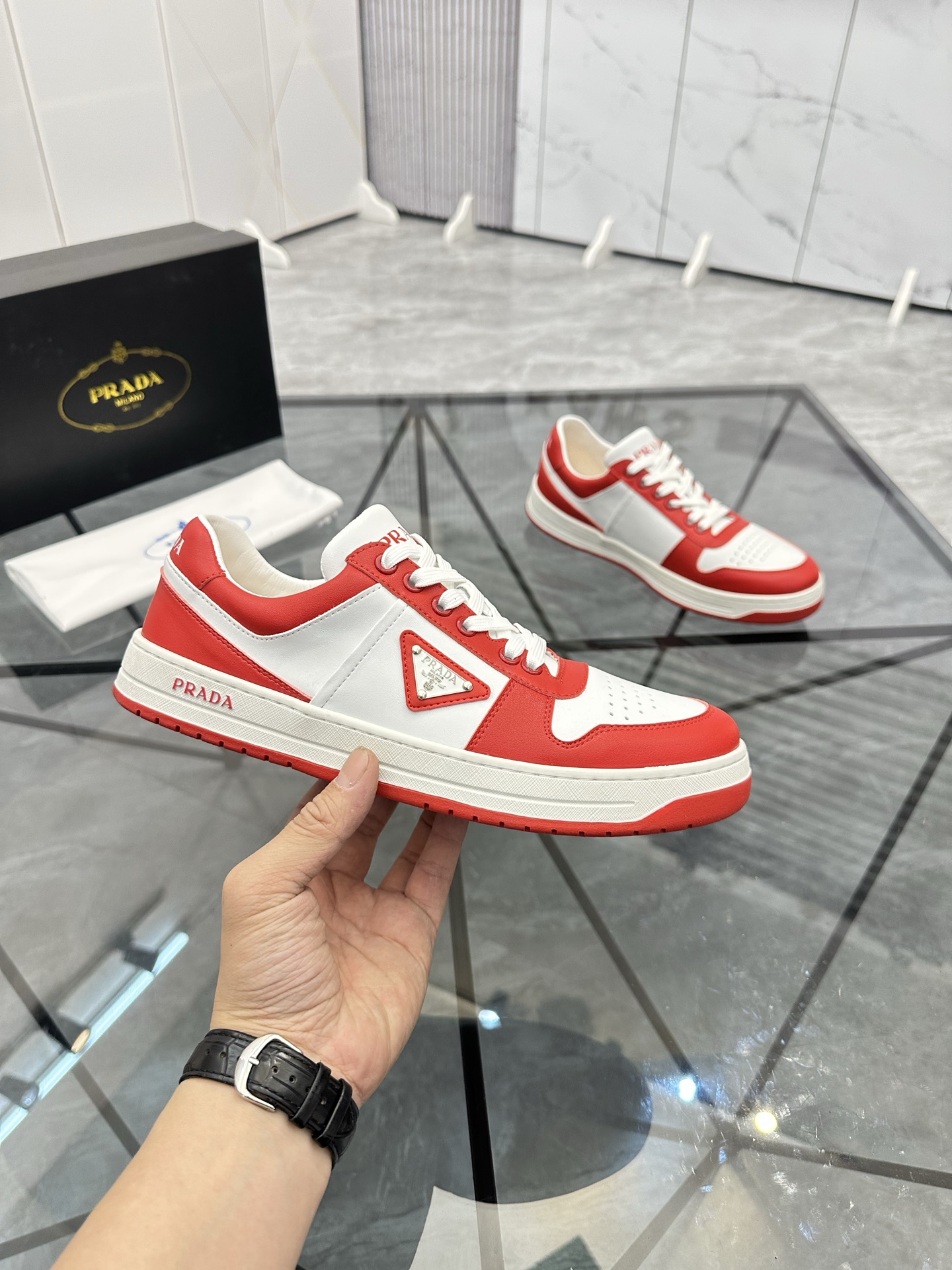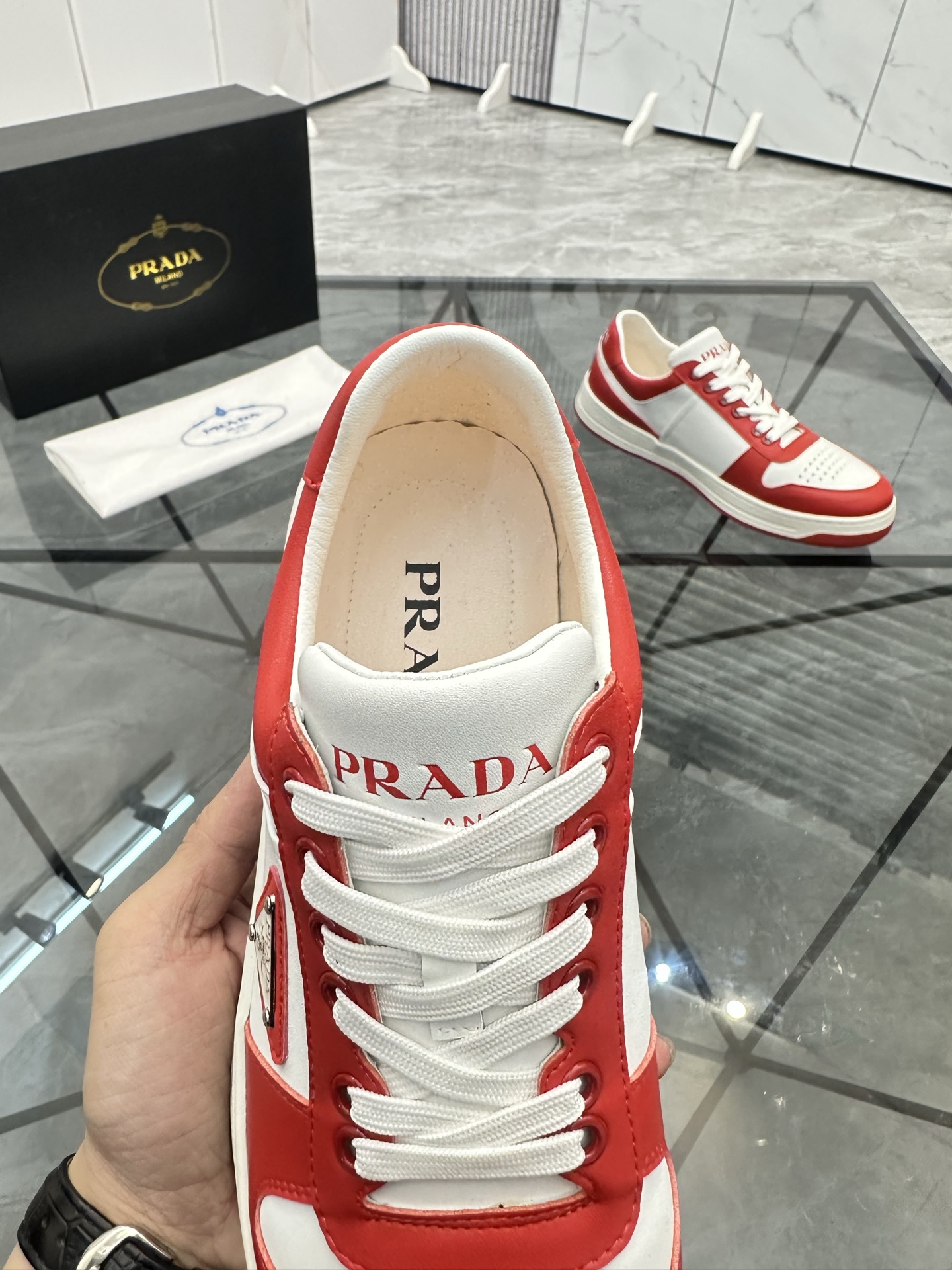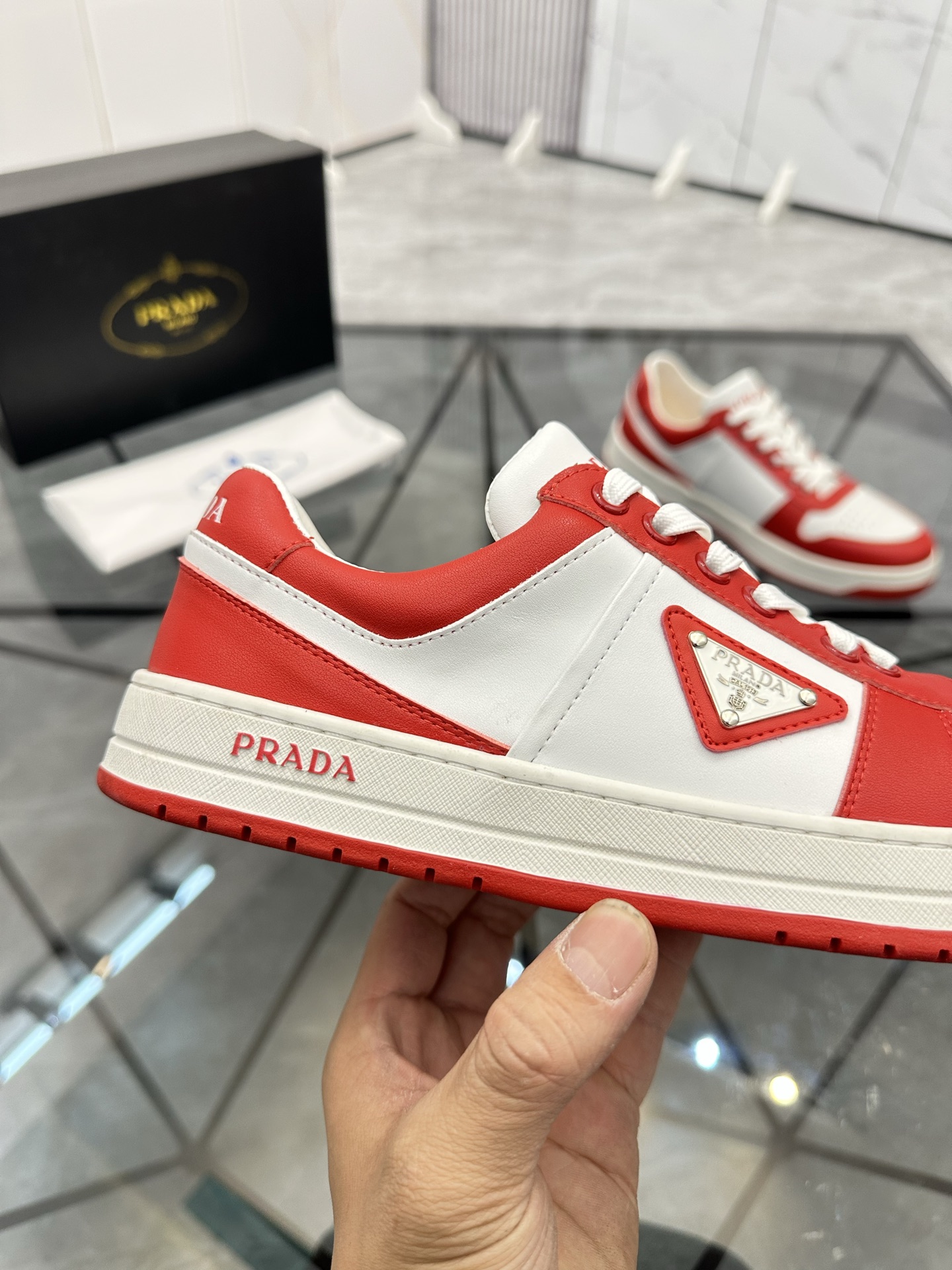 這款鞋子是AAAAA 1:1 質量(非常棒). 使用了和原版一模一樣的材料. 商標部分也保持了和普拉達/Prada一樣. 圖片拍攝是實物鞋子拍攝, 您所收到的實物保證和我們圖片一模一樣.