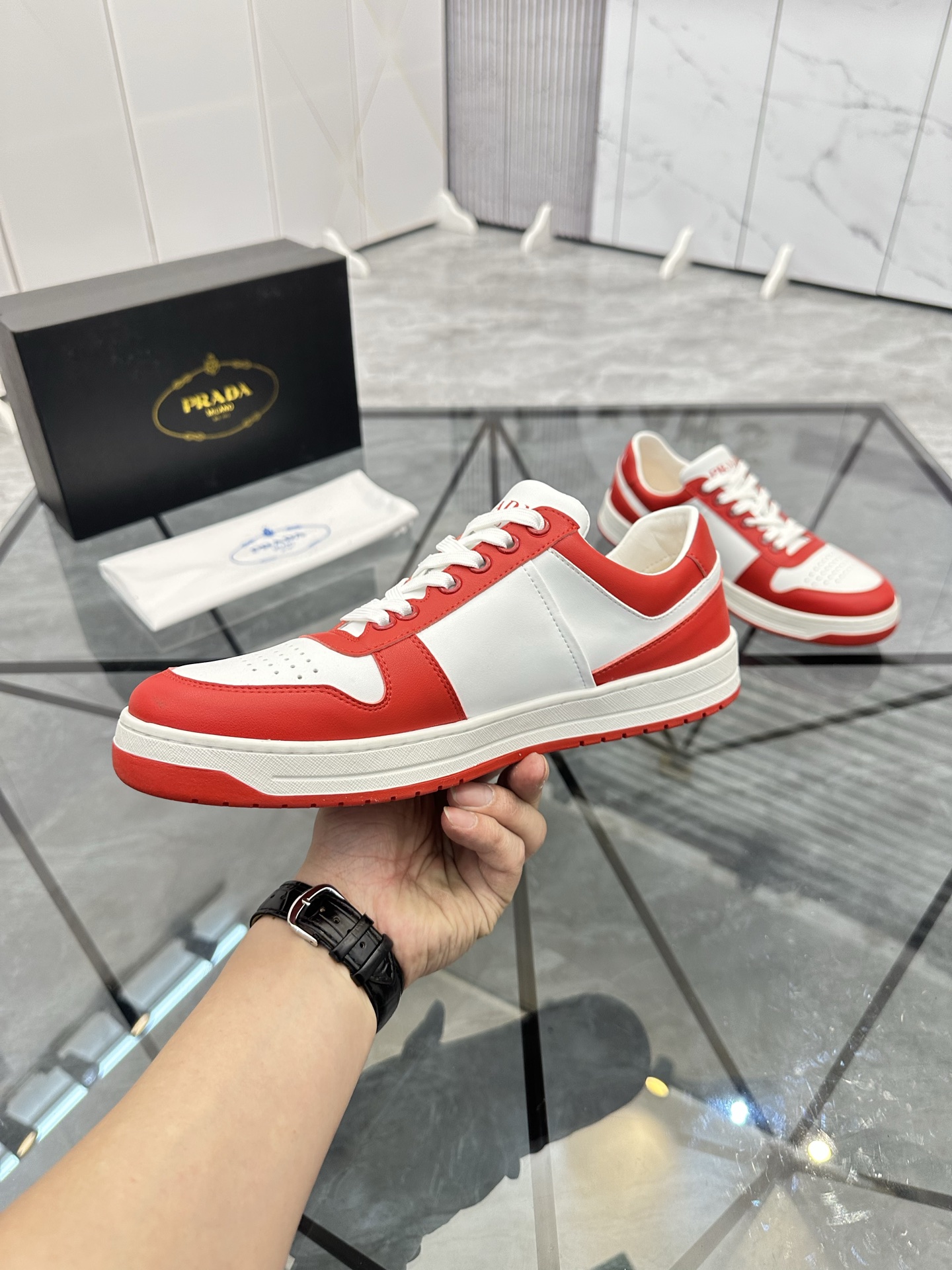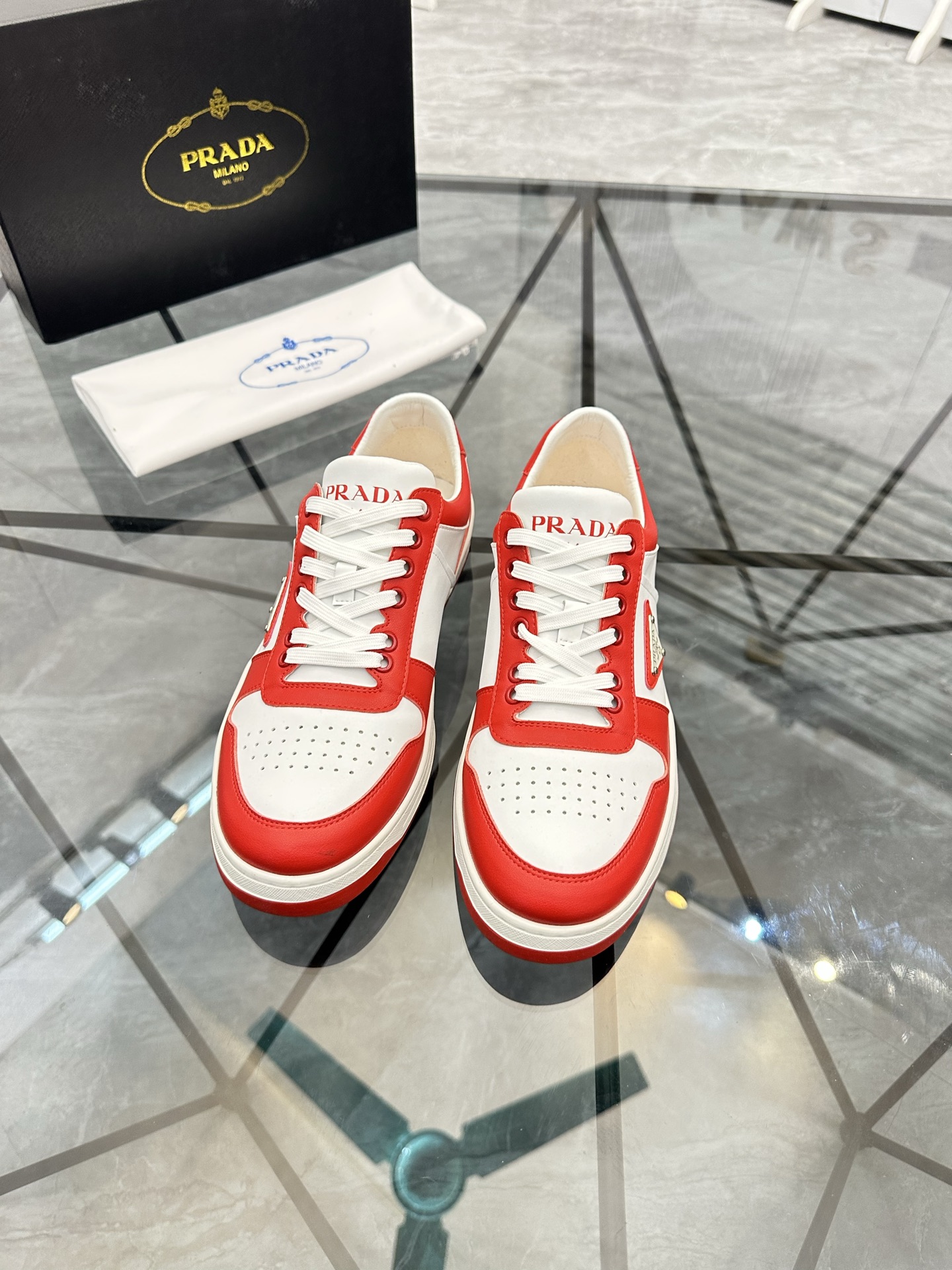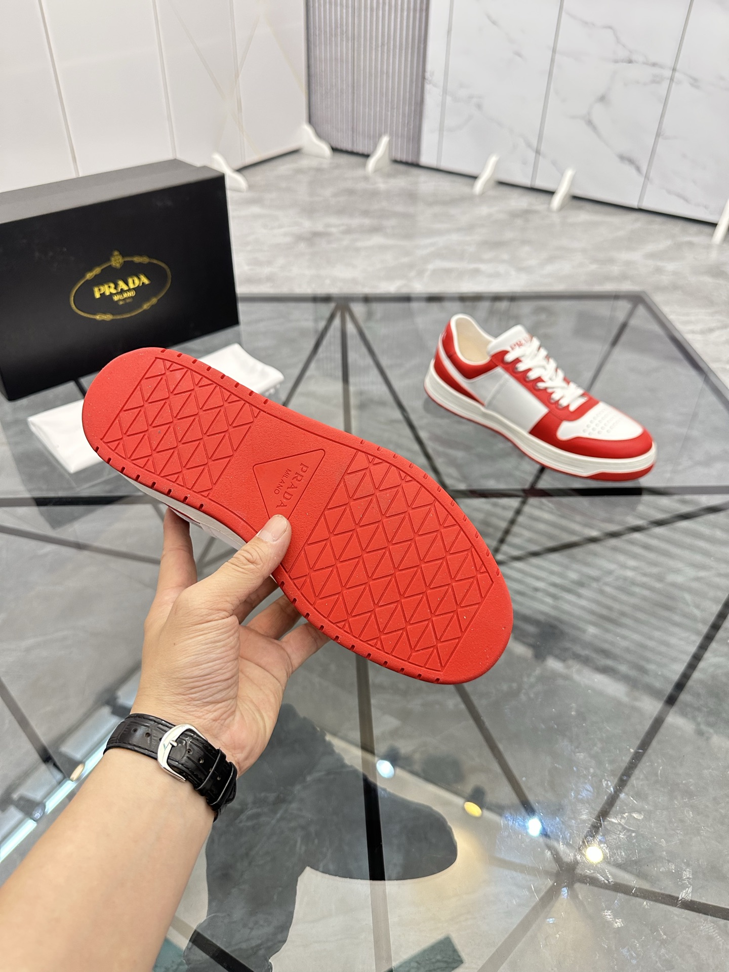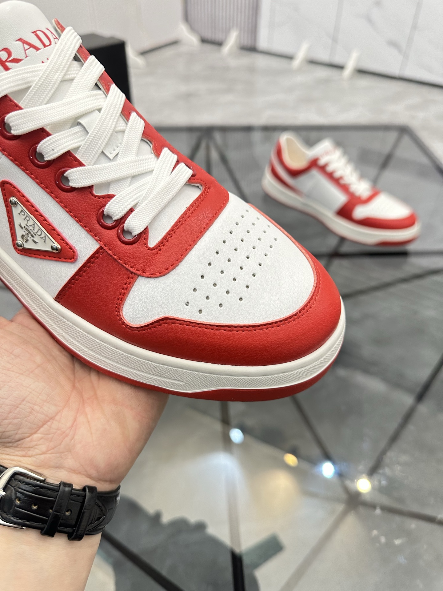 這款鞋子是AAAAA 1:1 質量(非常棒). 使用了和原版一模一樣的材料. 商標部分也保持了和普拉達/Prada一樣. 圖片拍攝是實物鞋子拍攝, 您所收到的實物保證和我們圖片一模一樣.