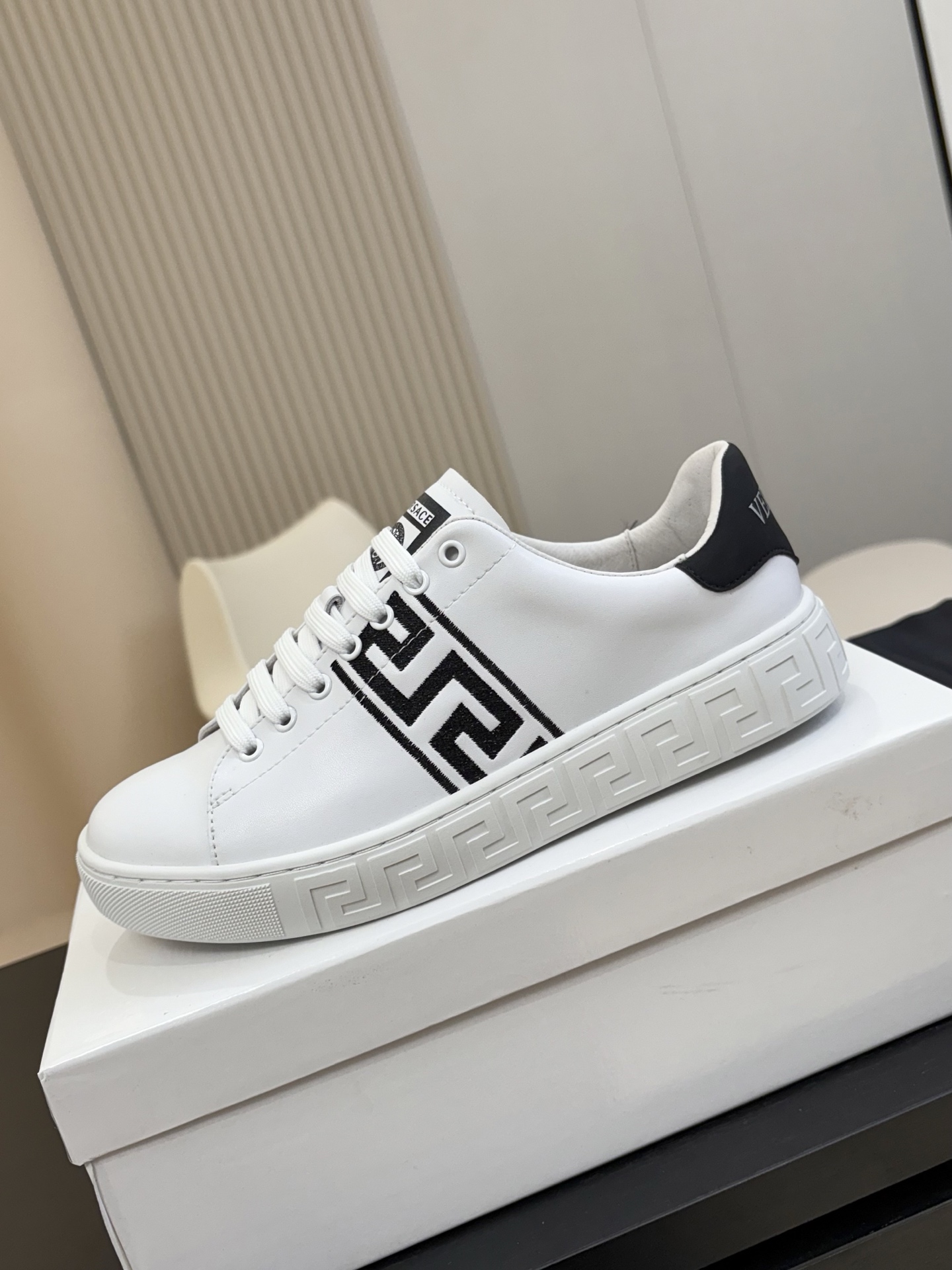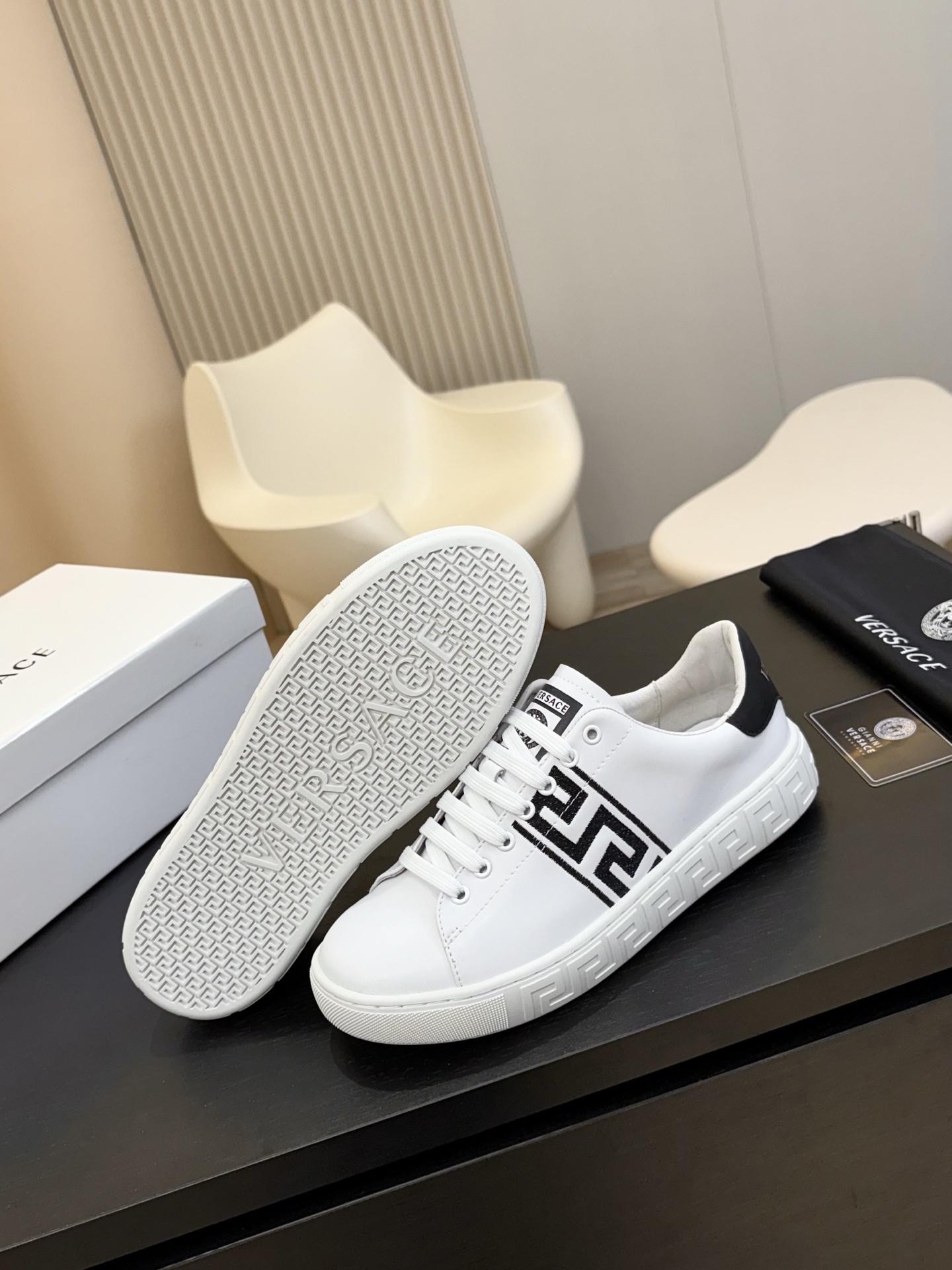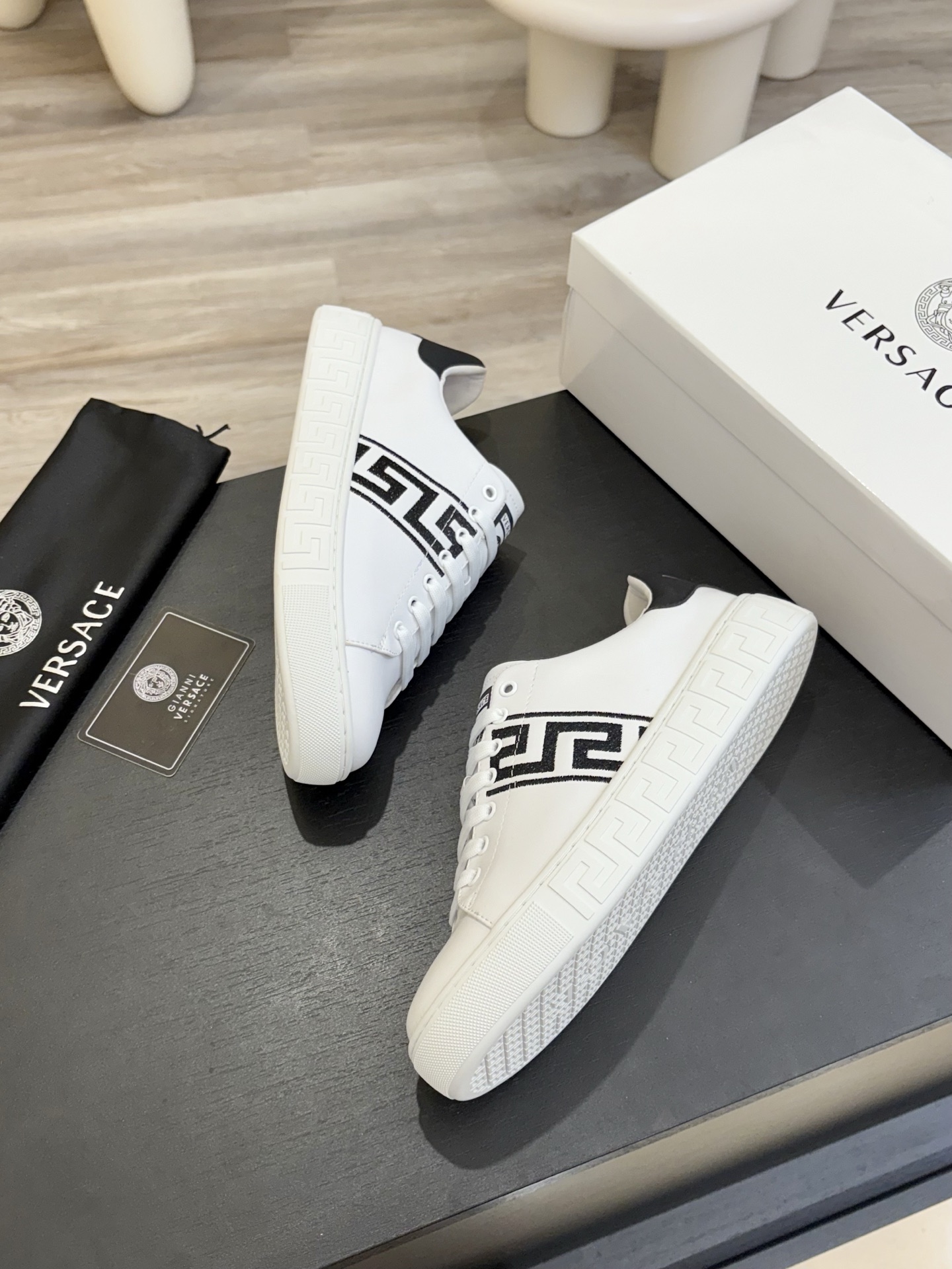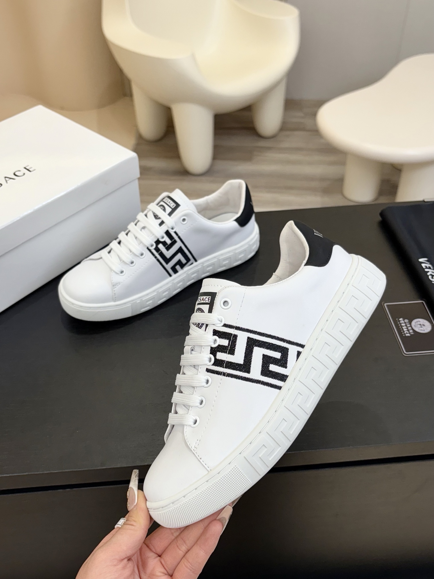 這款鞋子是AAAAA 1:1 質量(非常棒). 使用了和原版一模一樣的材料. 商標部分也保持了和范思哲/Versace一樣. 圖片拍攝是實物鞋子拍攝, 您所收到的實物保證和我們圖片一模一樣.