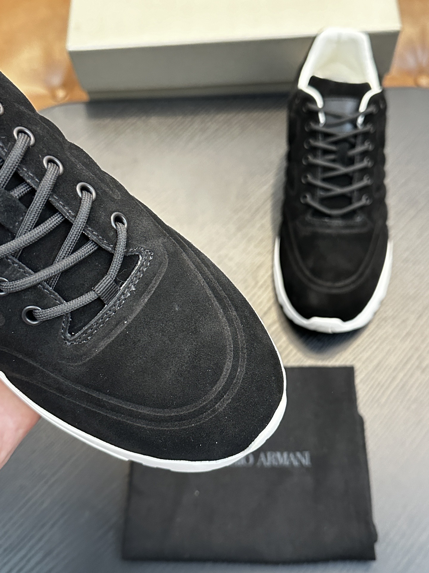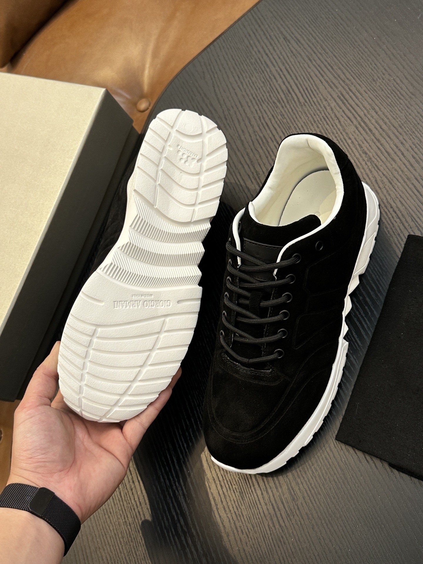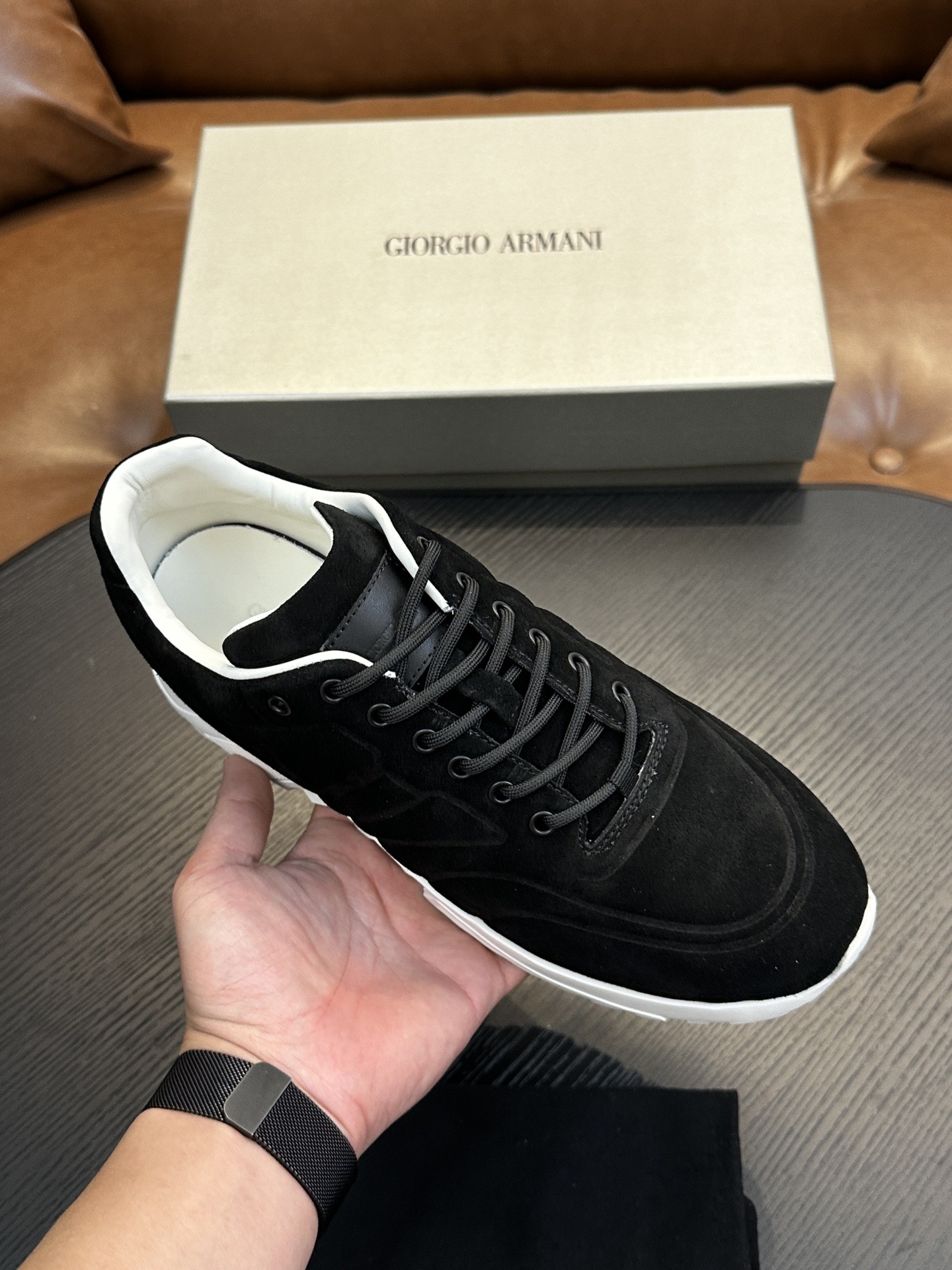 這款鞋子是AAAAA 1:1 質量(非常棒). 使用了和原版一模一樣的材料. 商標部分也保持了和阿瑪尼/Armani一樣. 圖片拍攝是實物鞋子拍攝, 您所收到的實物保證和我們圖片一模一樣.
