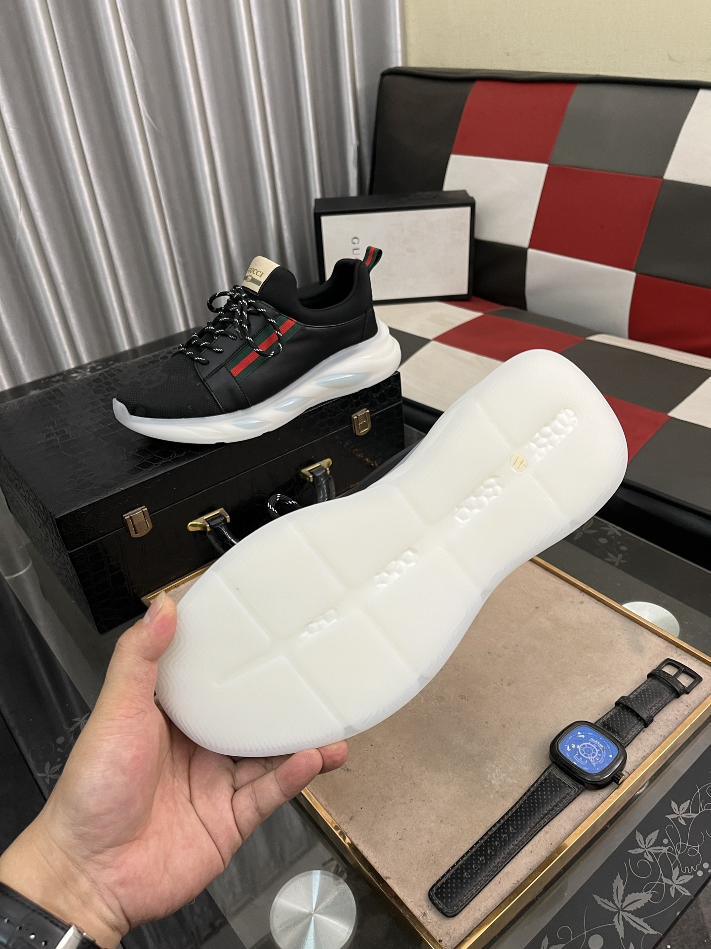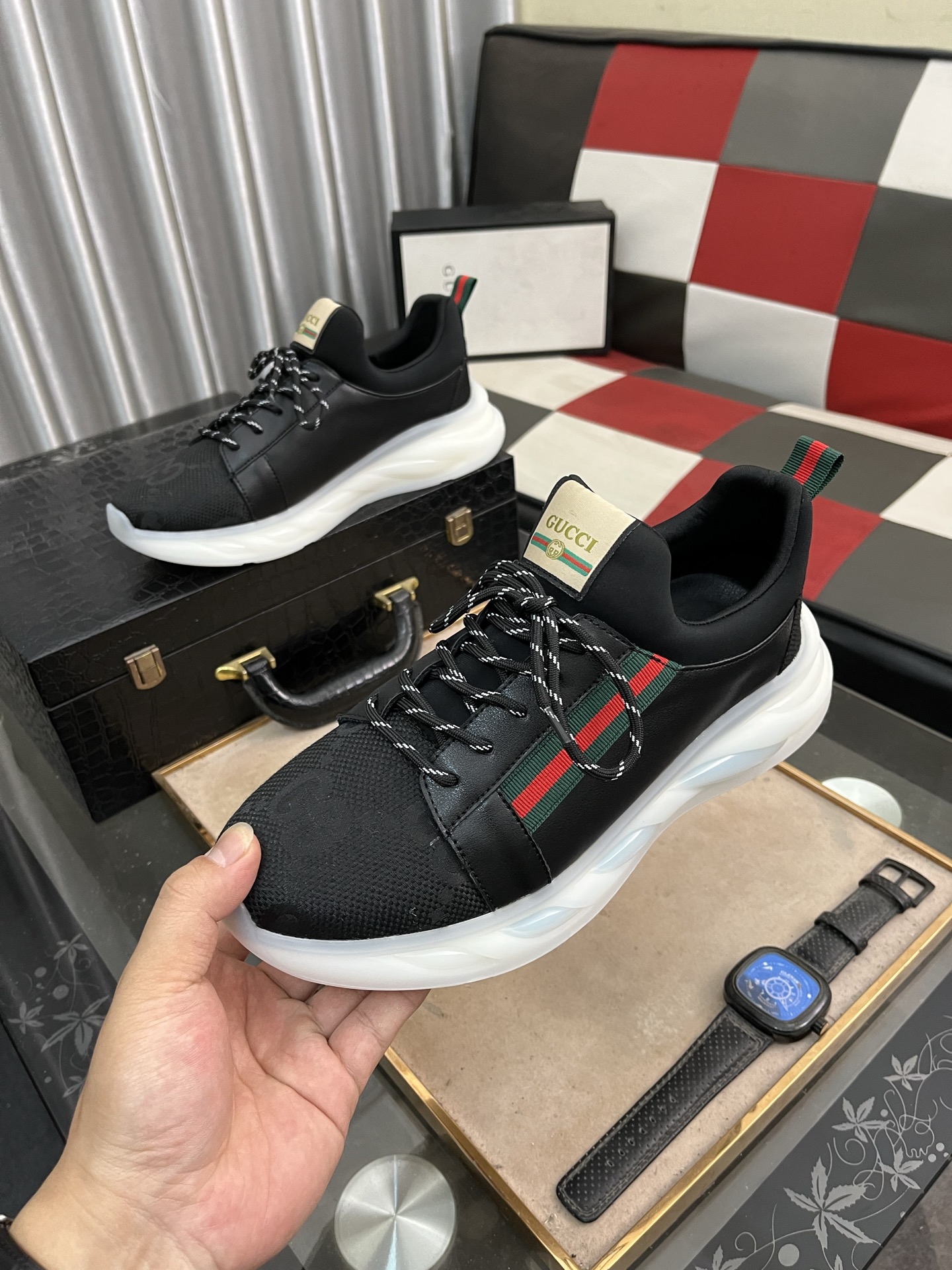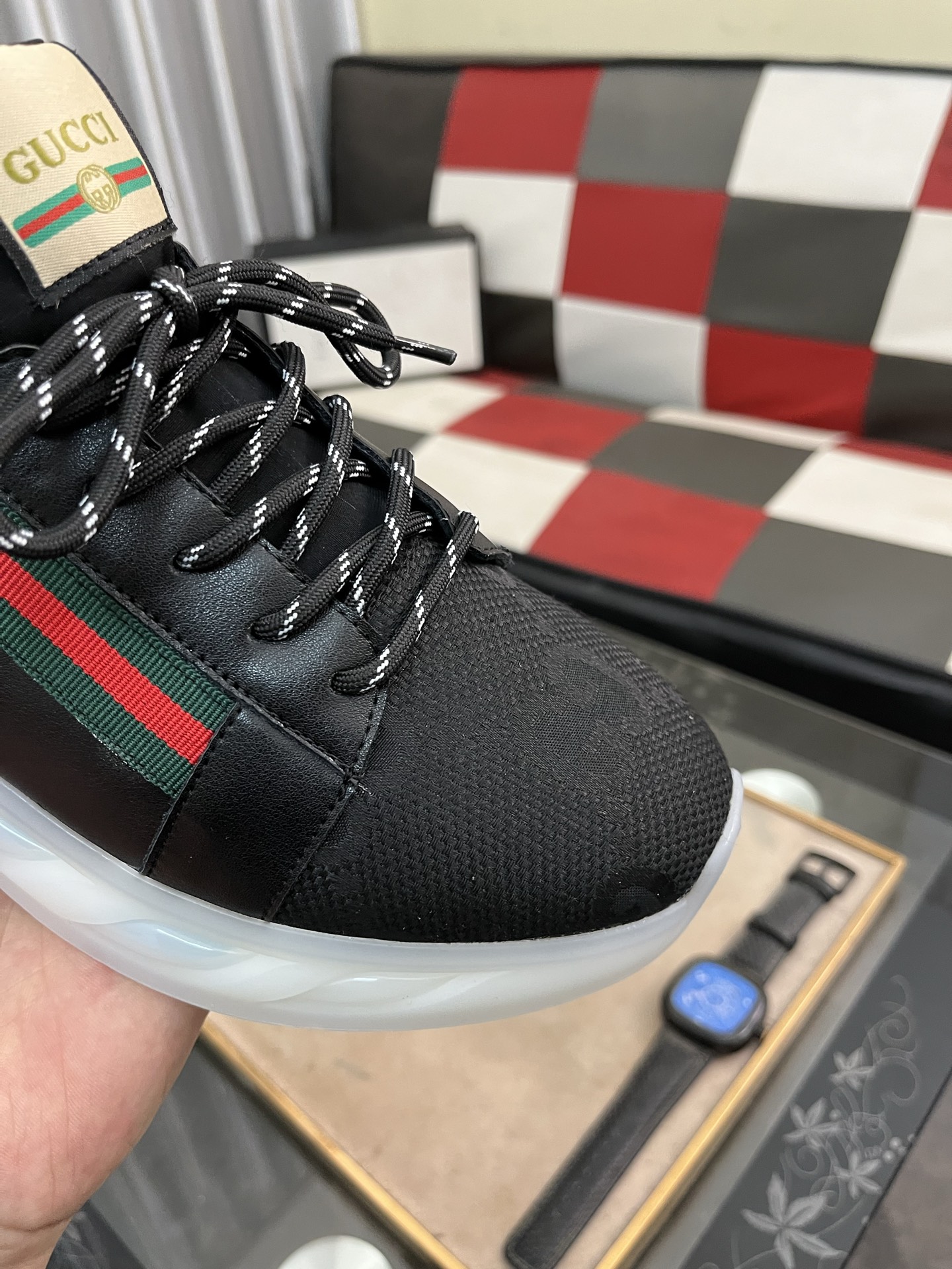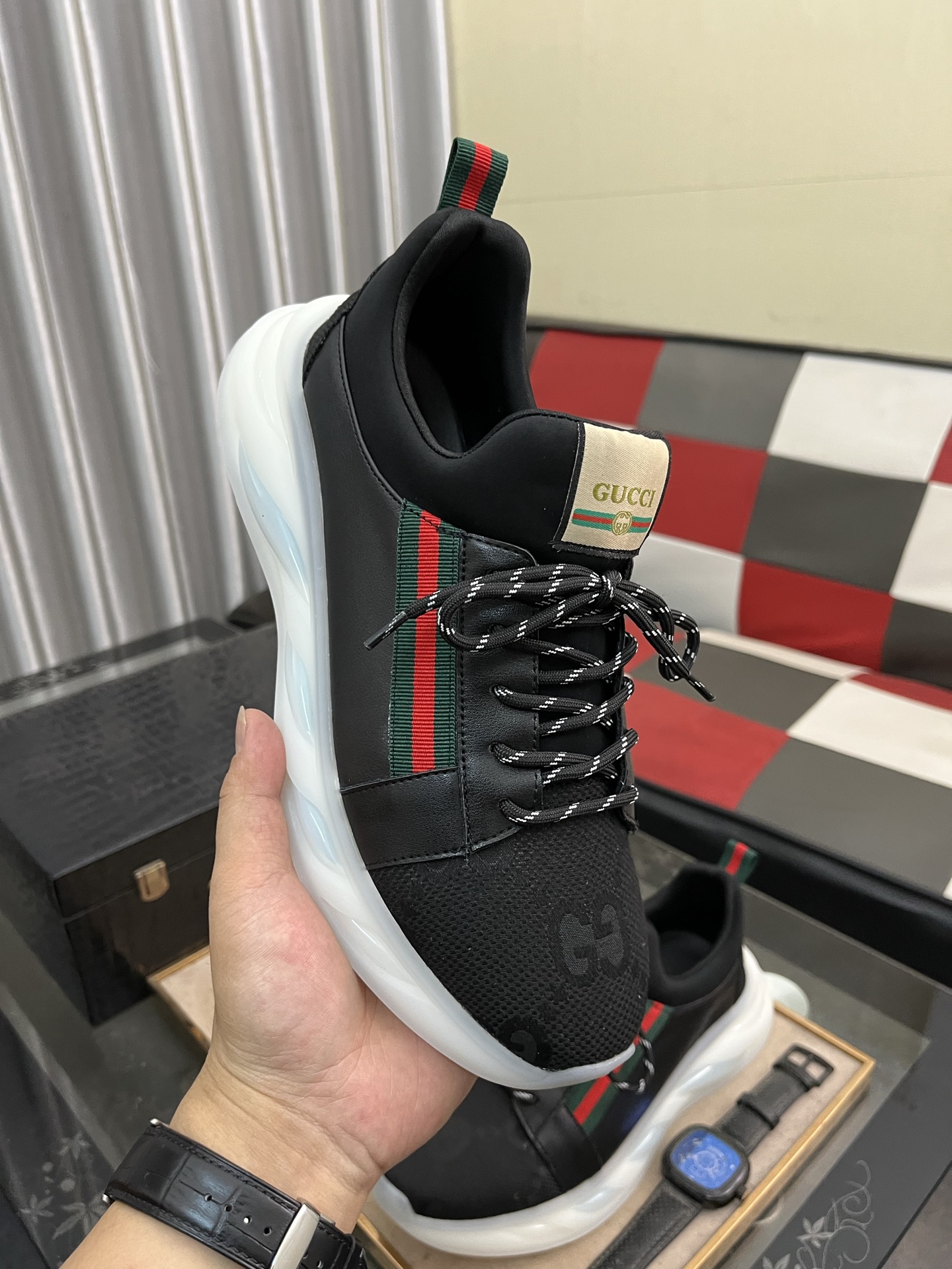 這款鞋子是AAAAA 1:1 質量(非常棒). 使用了和原版一模一樣的材料. 商標部分也保持了和古奇/Gucci一樣. 圖片拍攝是實物鞋子拍攝, 您所收到的實物保證和我們圖片一模一樣.