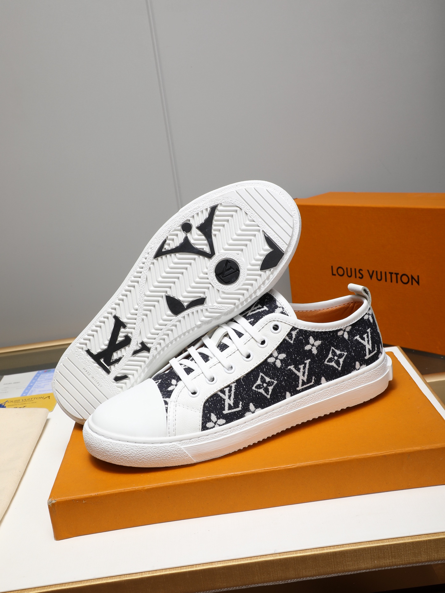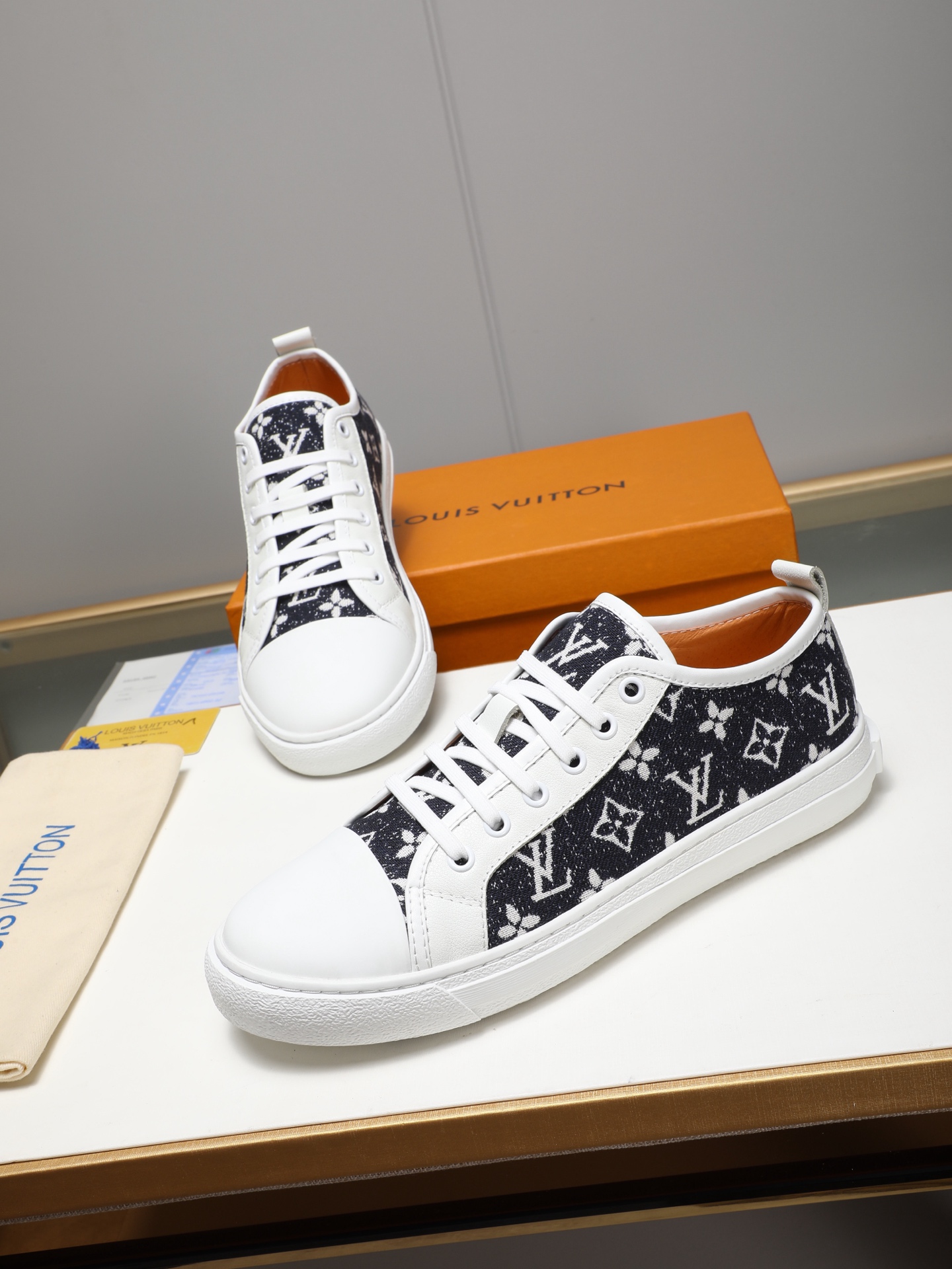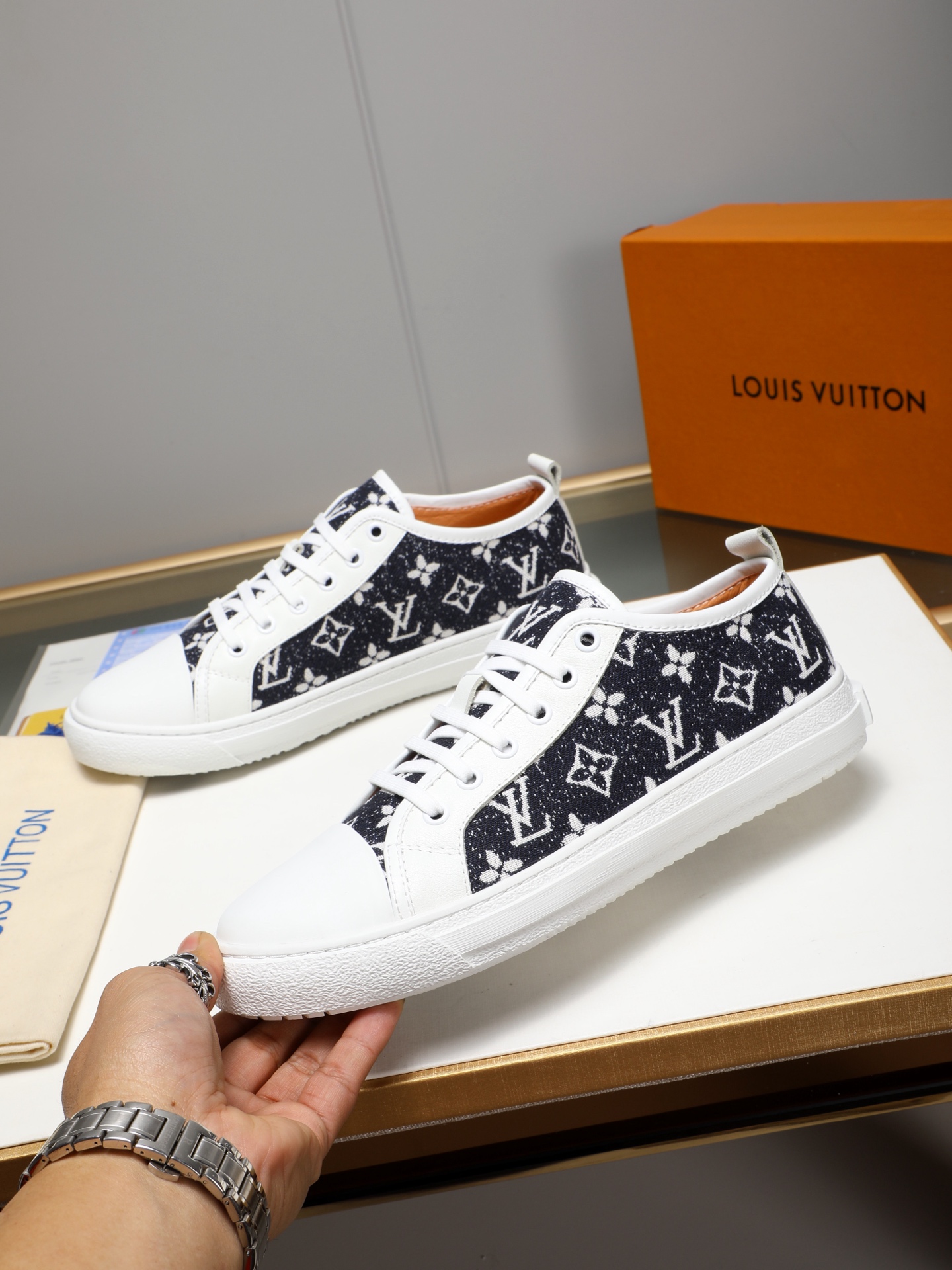 這款鞋子是AAAAA 1:1 質量(非常棒). 使用了和原版一模一樣的材料. 商標部分也保持了和路易威登/Louis Vuitton一樣. 圖片拍攝是實物鞋子拍攝, 您所收到的實物保證和我們圖片一模一樣.