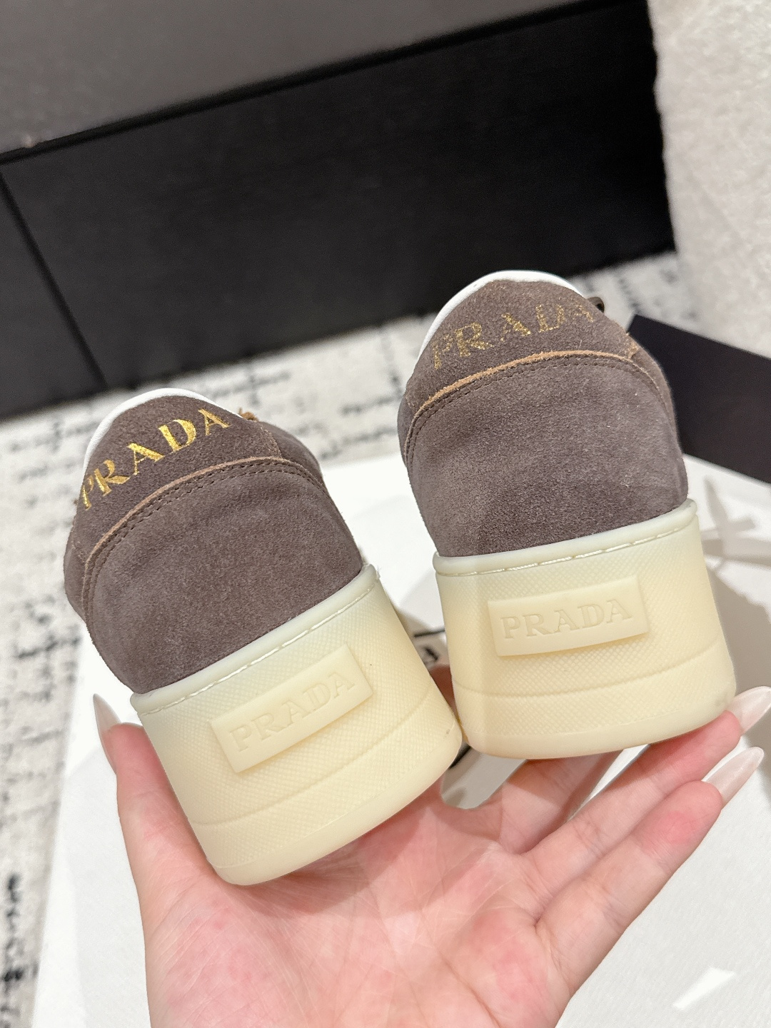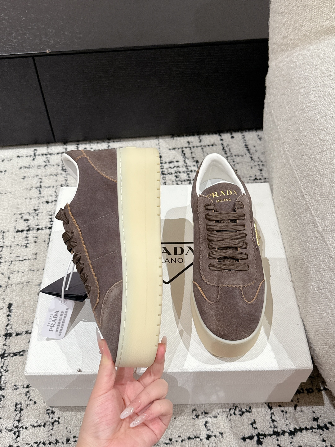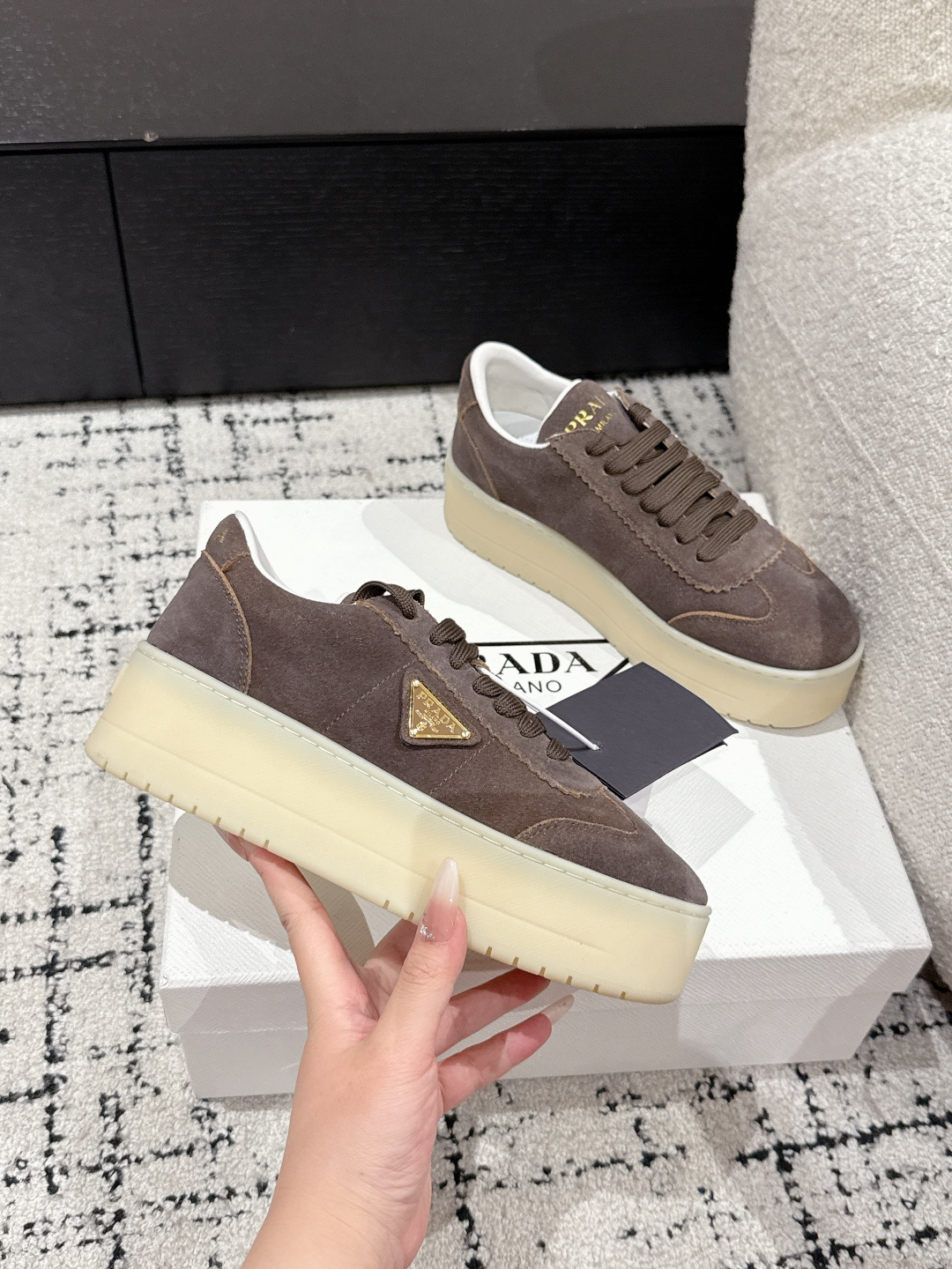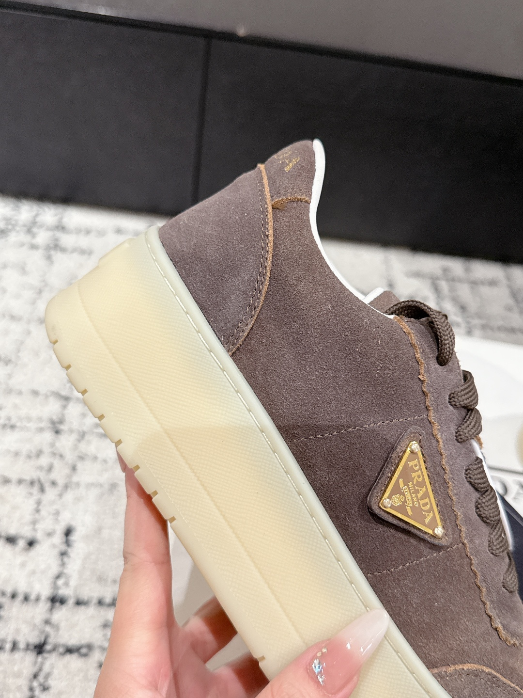 這款鞋子是AAAAA 1:1 質量(非常棒). 使用了和原版一模一樣的材料. 商標部分也保持了和普拉達/Prada一樣. 圖片拍攝是實物鞋子拍攝, 您所收到的實物保證和我們圖片一模一樣.
