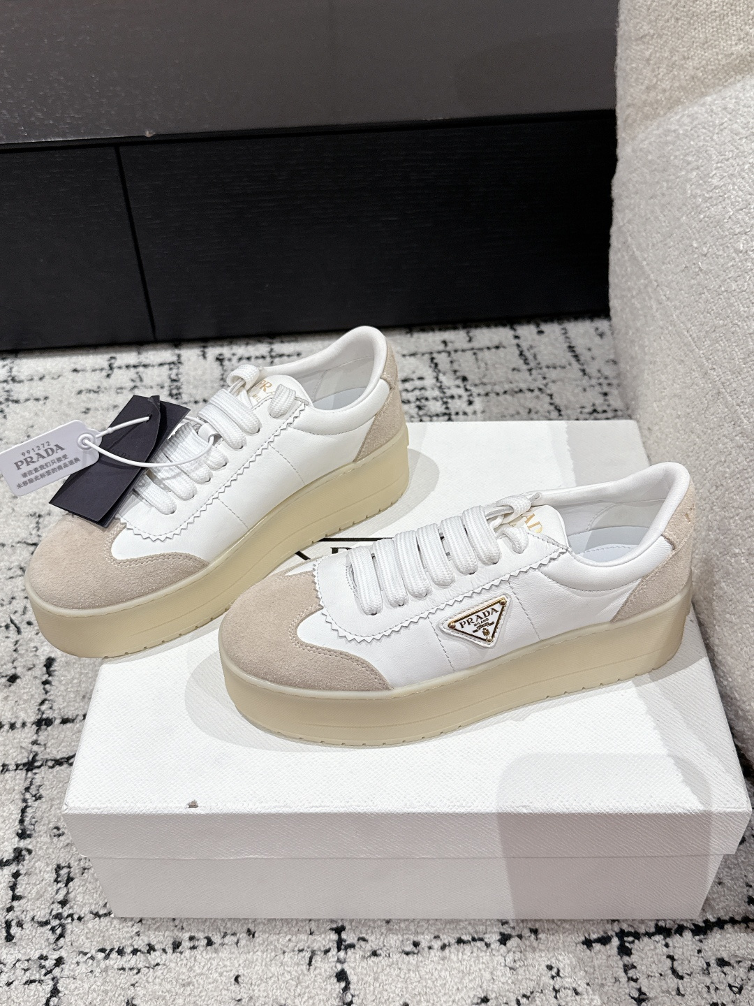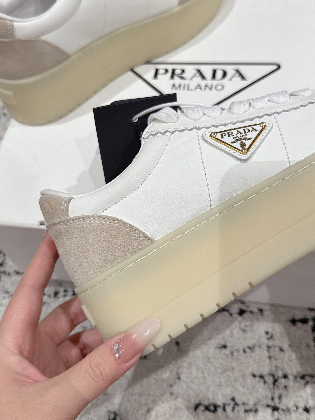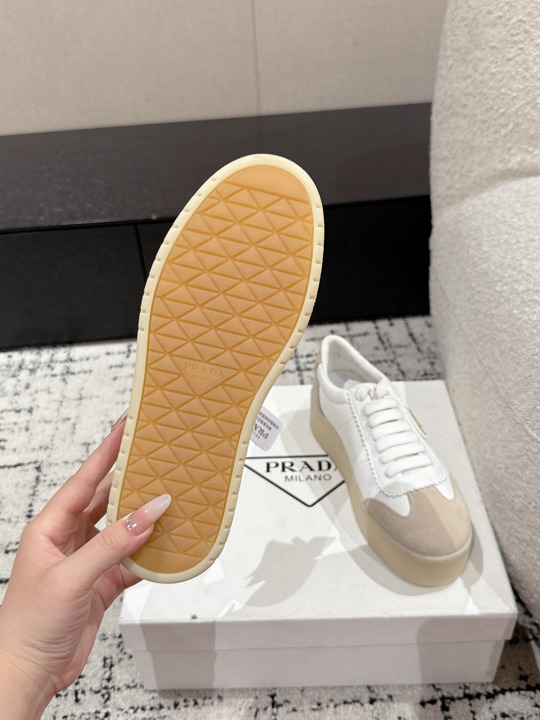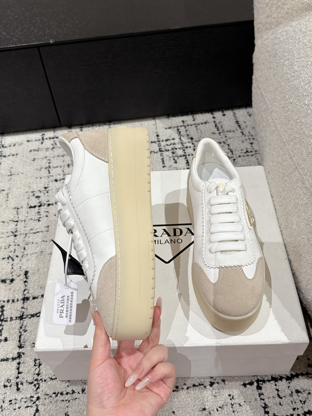 這款鞋子是AAAAA 1:1 質量(非常棒). 使用了和原版一模一樣的材料. 商標部分也保持了和普拉達/Prada一樣. 圖片拍攝是實物鞋子拍攝, 您所收到的實物保證和我們圖片一模一樣.