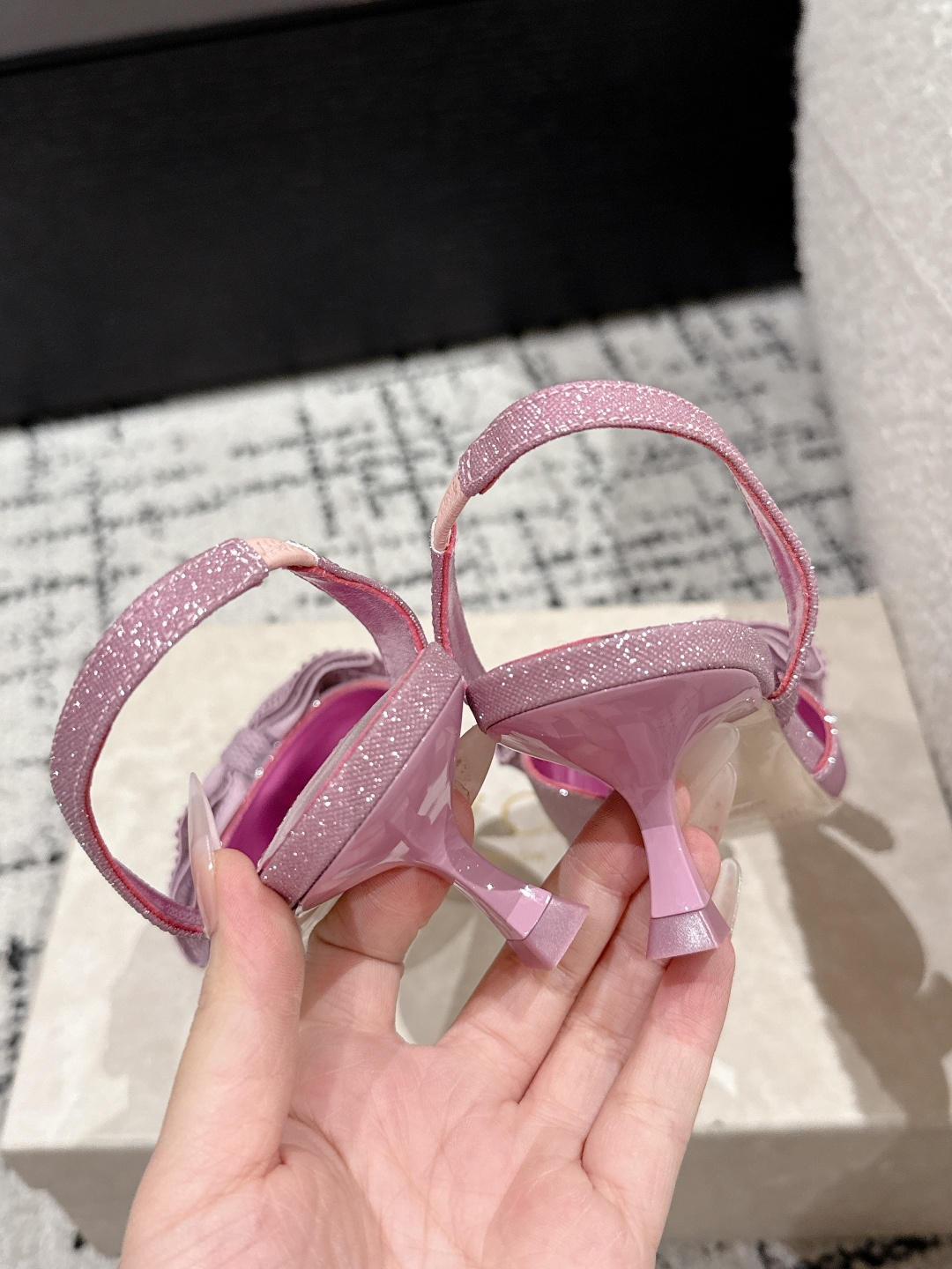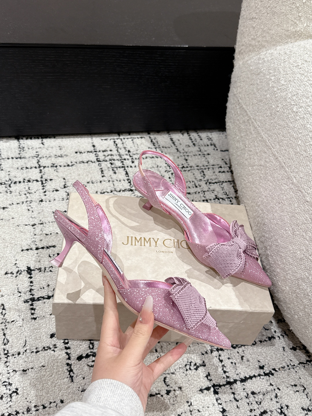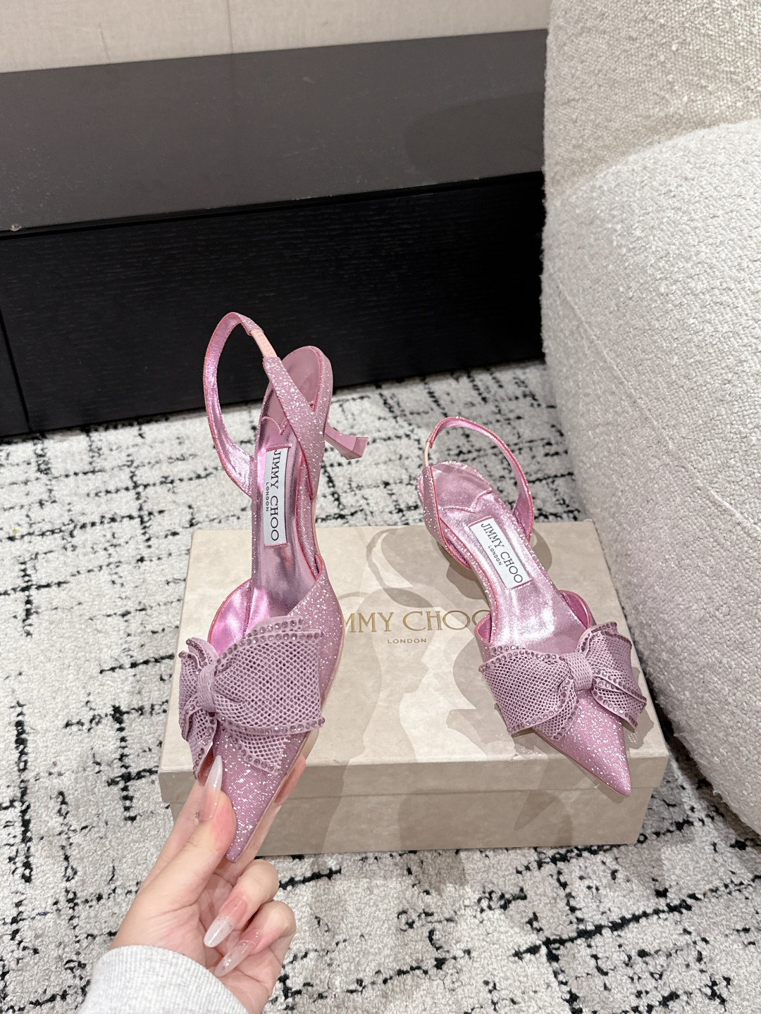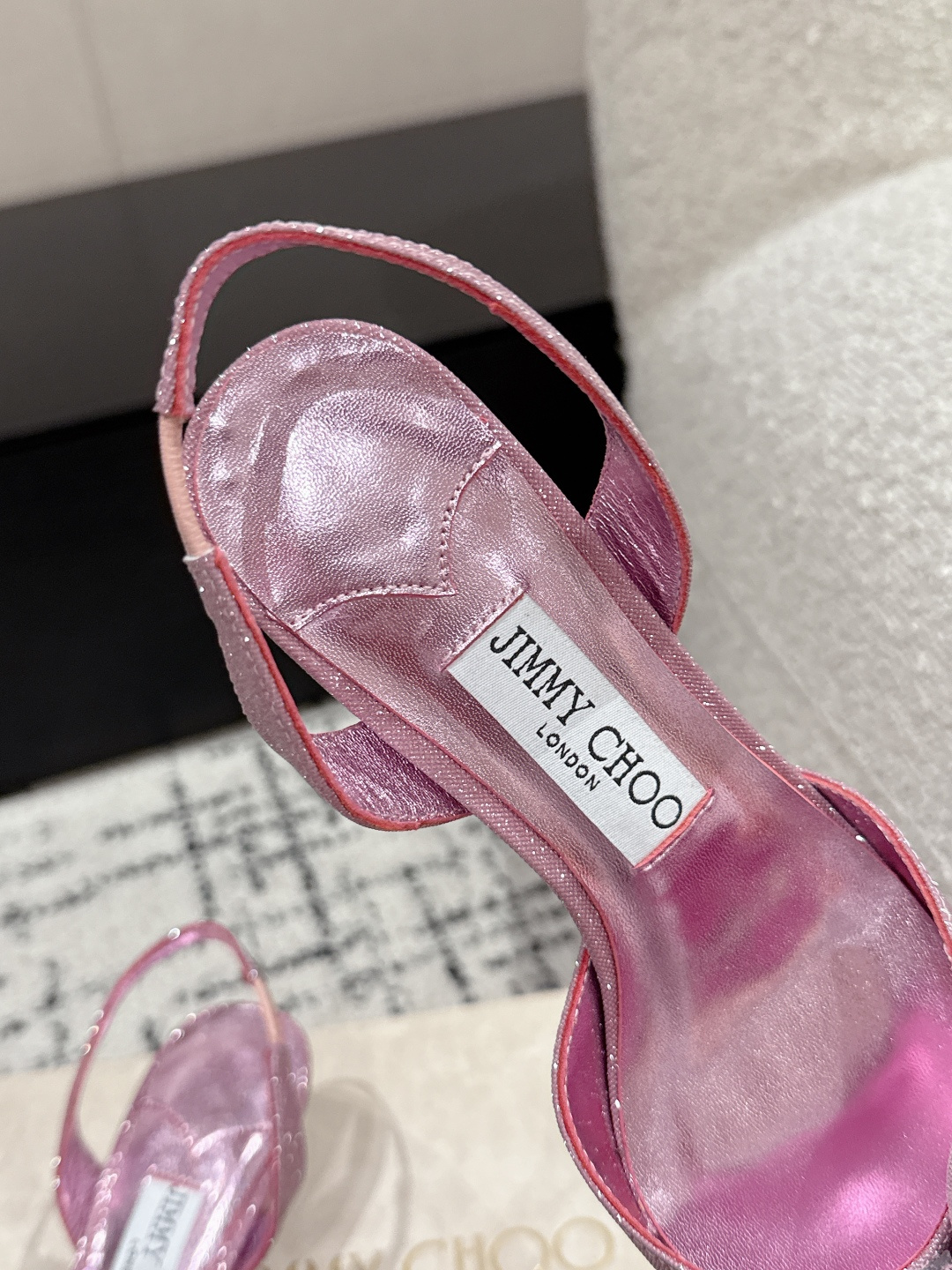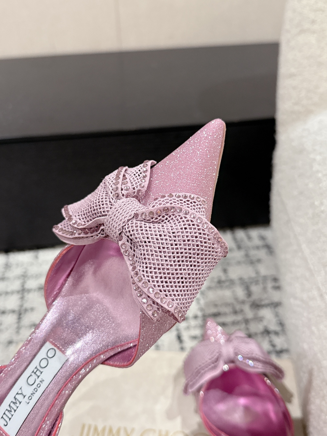 這款鞋子是AAAAA 1:1 質量(非常棒). 使用了和原版一模一樣的材料. 商標部分也保持了和吉米喬/JIMMY CHOO一樣. 圖片拍攝是實物鞋子拍攝, 您所收到的實物保證和我們圖片一模一樣.