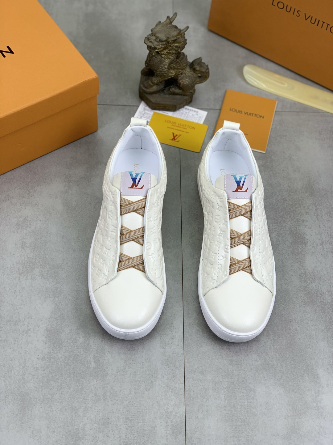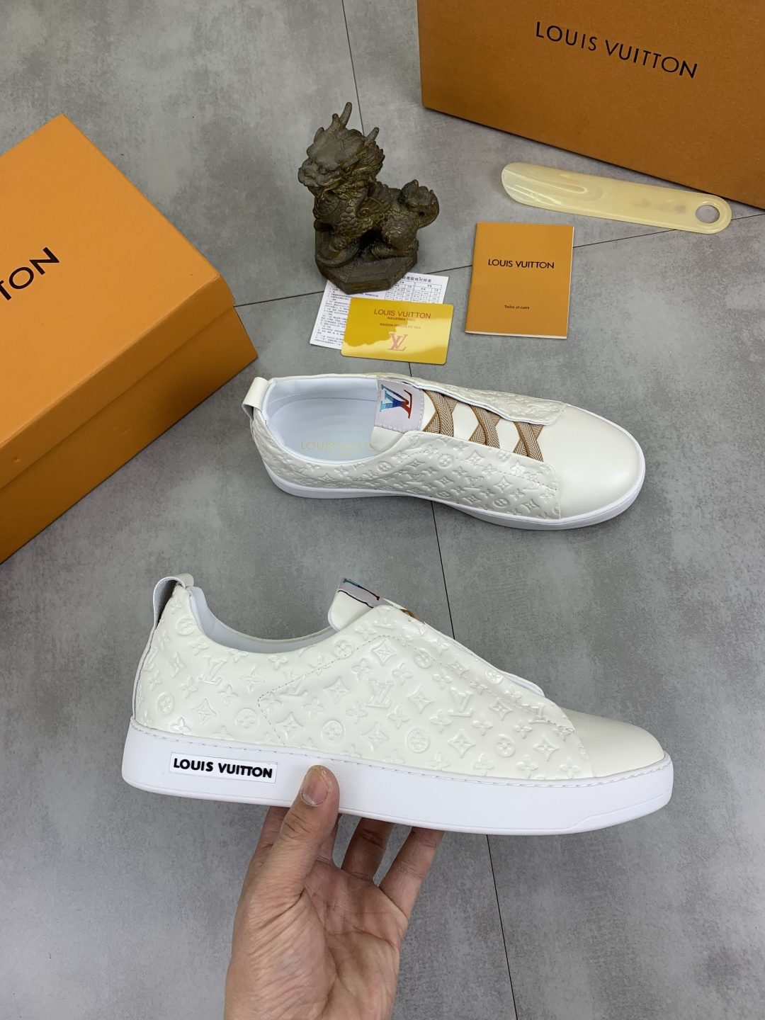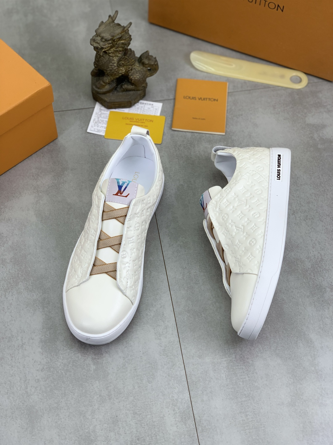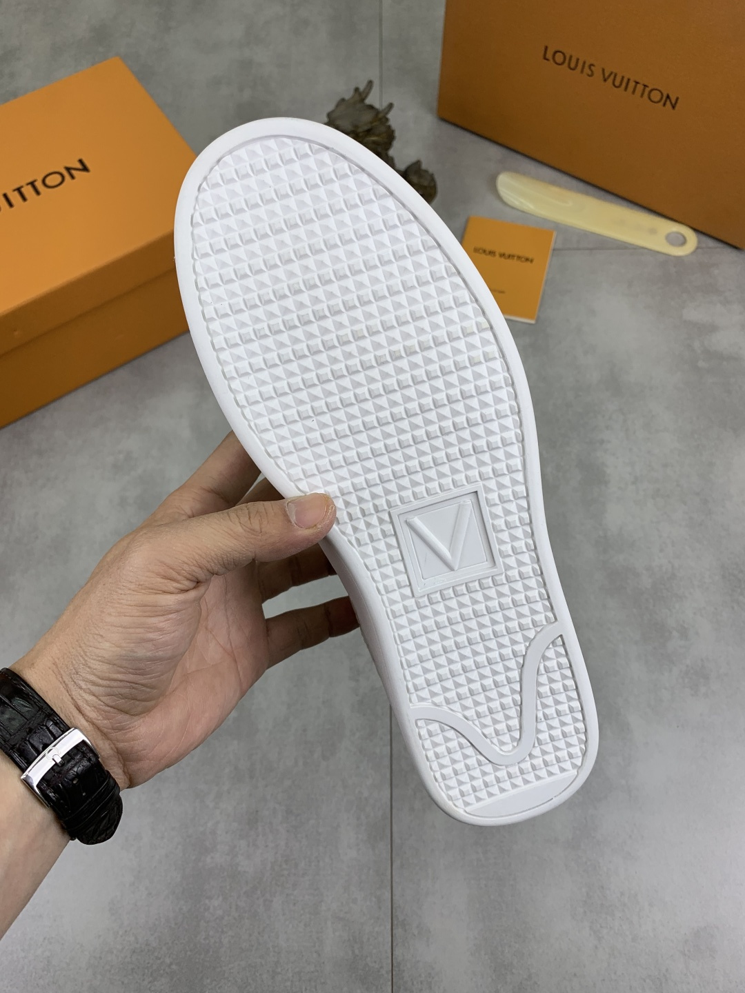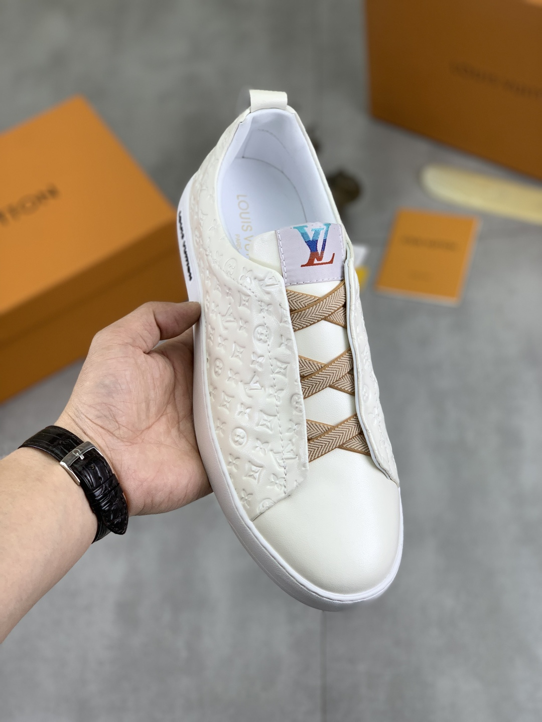 這款鞋子是AAAAA 1:1 質量(非常棒). 使用了和原版一模一樣的材料. 商標部分也保持了和路易威登/Louis Vuitton一樣. 圖片拍攝是實物鞋子拍攝, 您所收到的實物保證和我們圖片一模一樣.