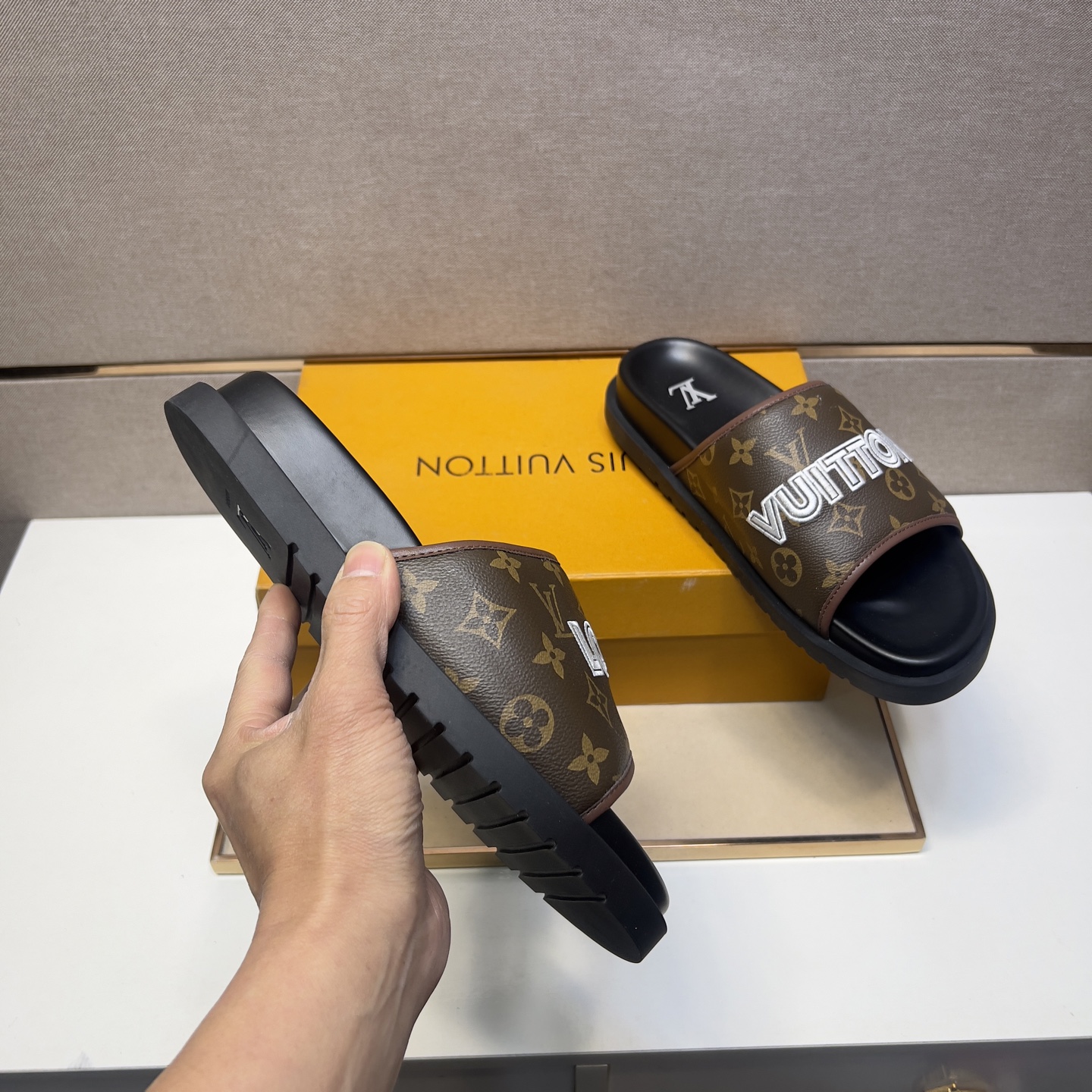 這款鞋子是AAAAA 1:1 質量(非常棒). 使用了和原版一模一樣的材料. 商標部分也保持了和路易威登/Louis Vuitton一樣. 圖片拍攝是實物鞋子拍攝, 您所收到的實物保證和我們圖片一模一樣.