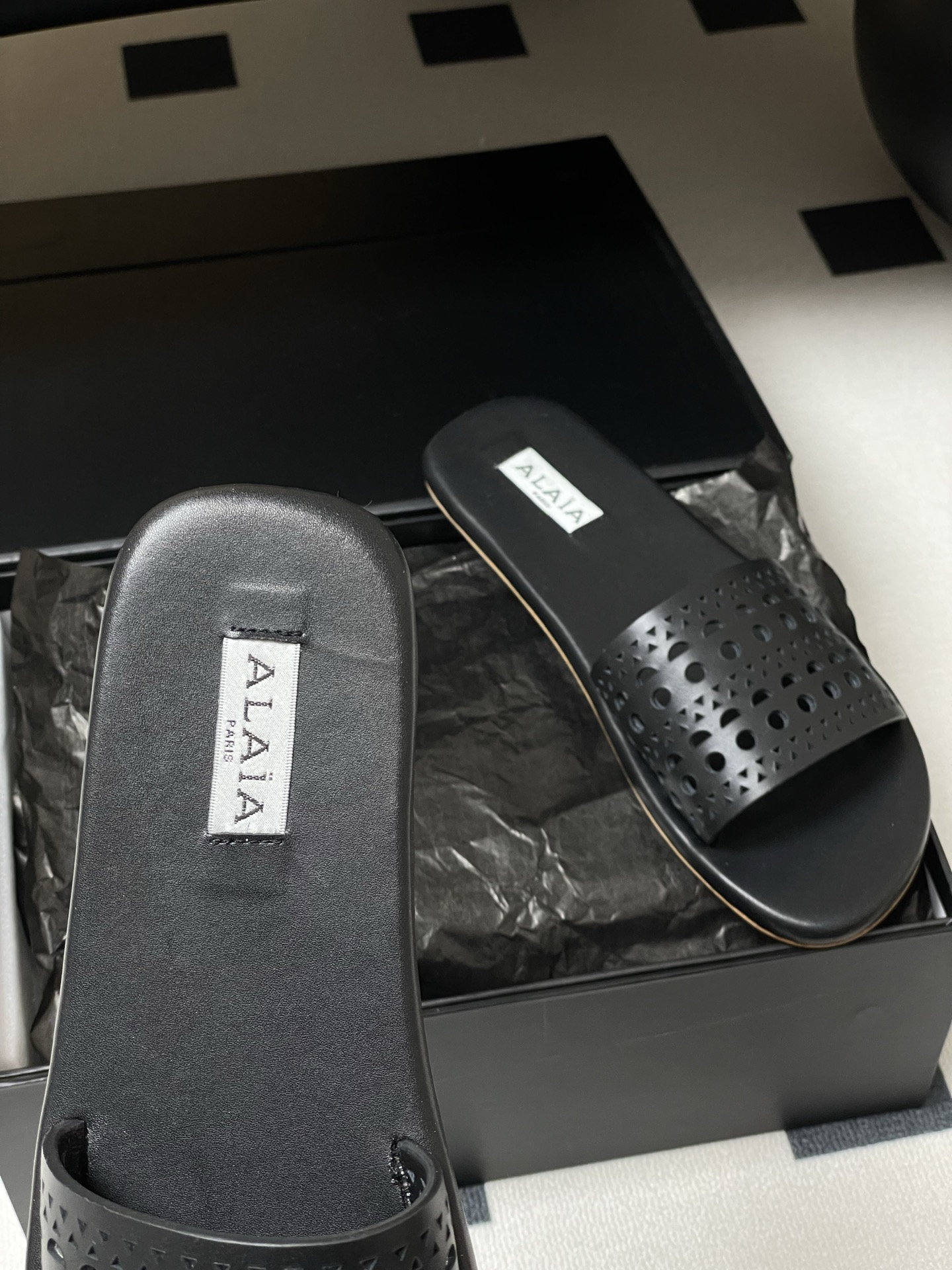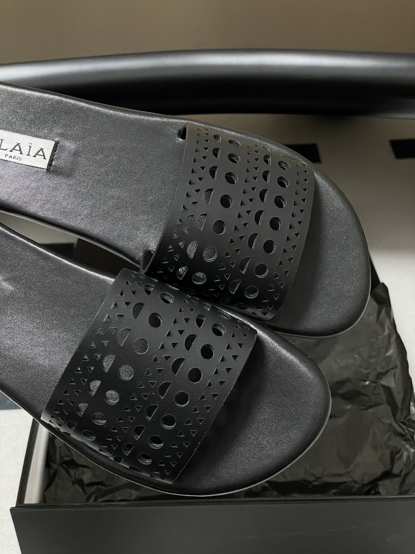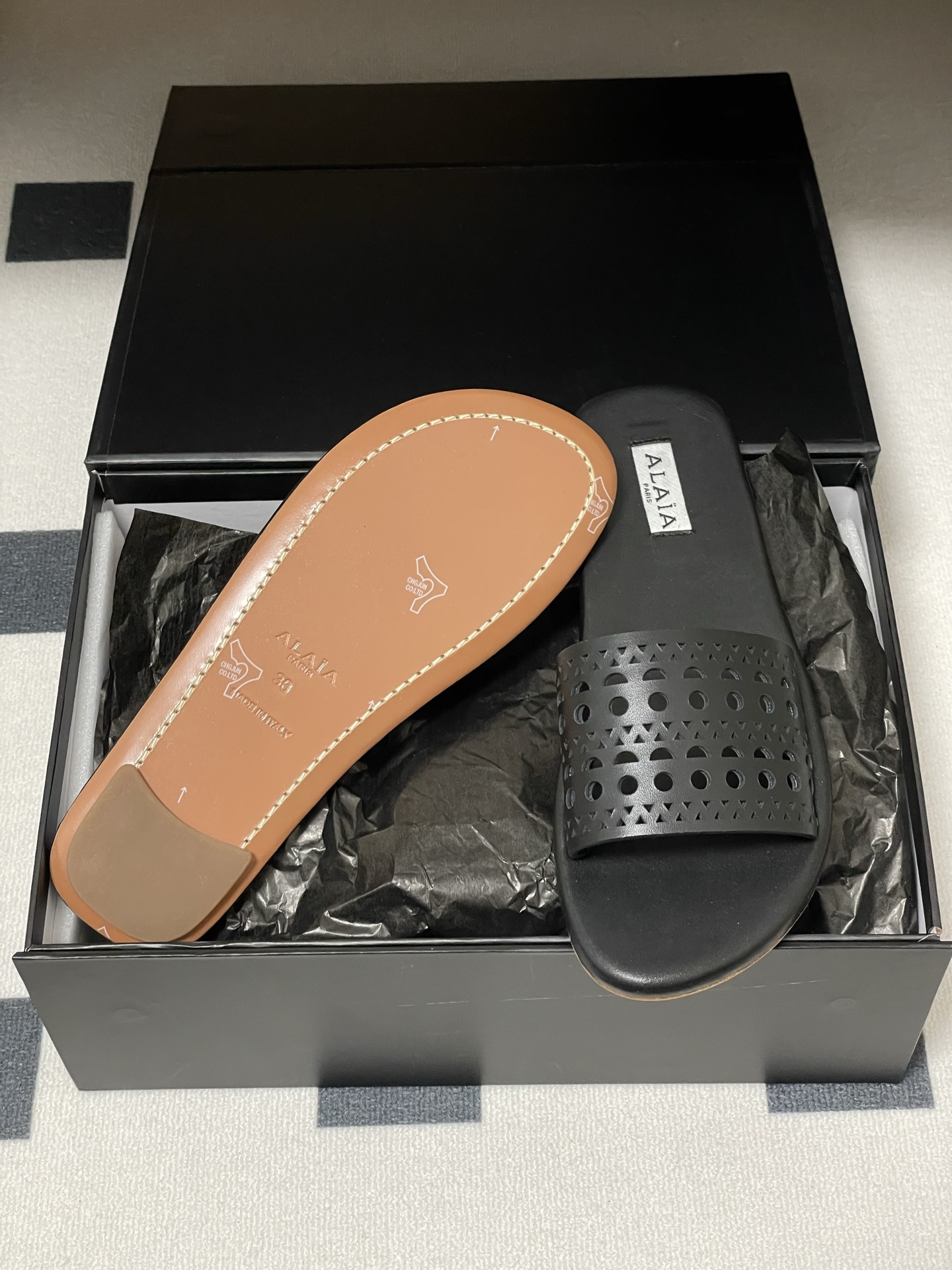 這款鞋子是AAAAA 1:1 質量(非常棒). 使用了和原版一模一樣的材料. 商標部分也保持了和Alaia一樣. 圖片拍攝是實物鞋子拍攝, 您所收到的實物保證和我們圖片一模一樣.