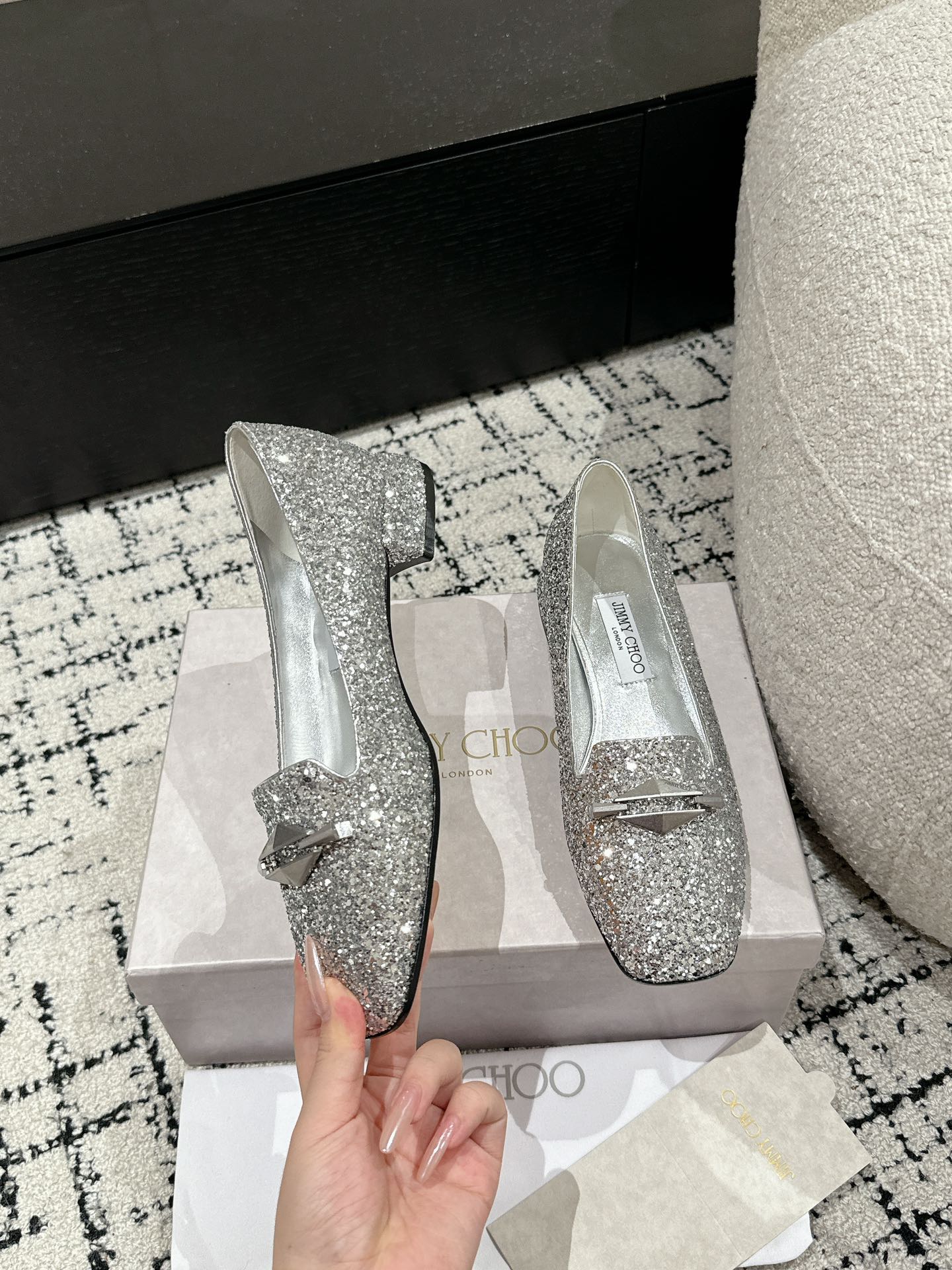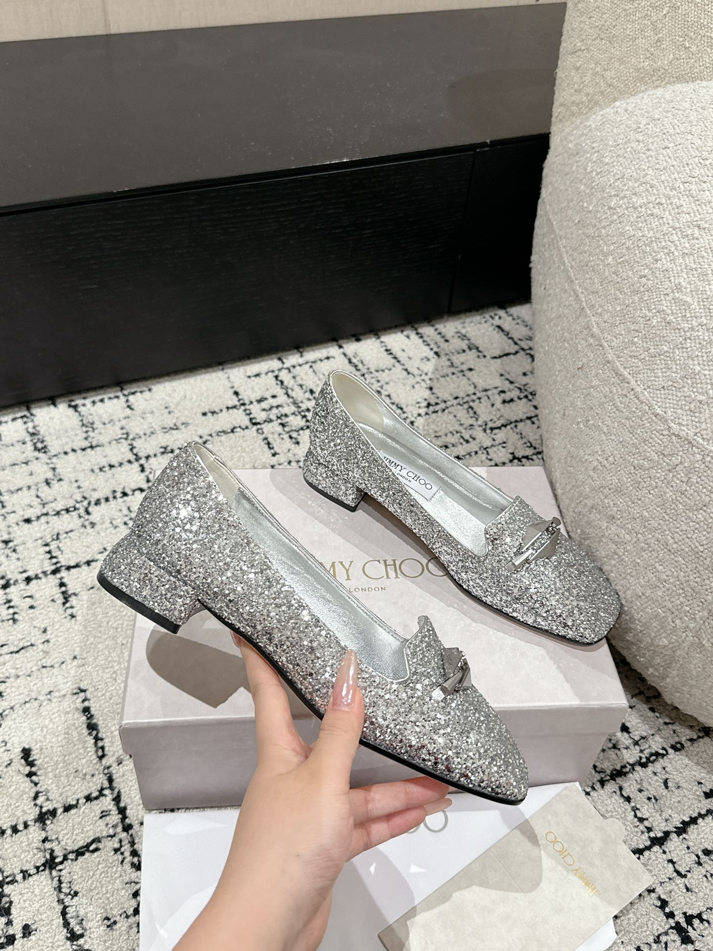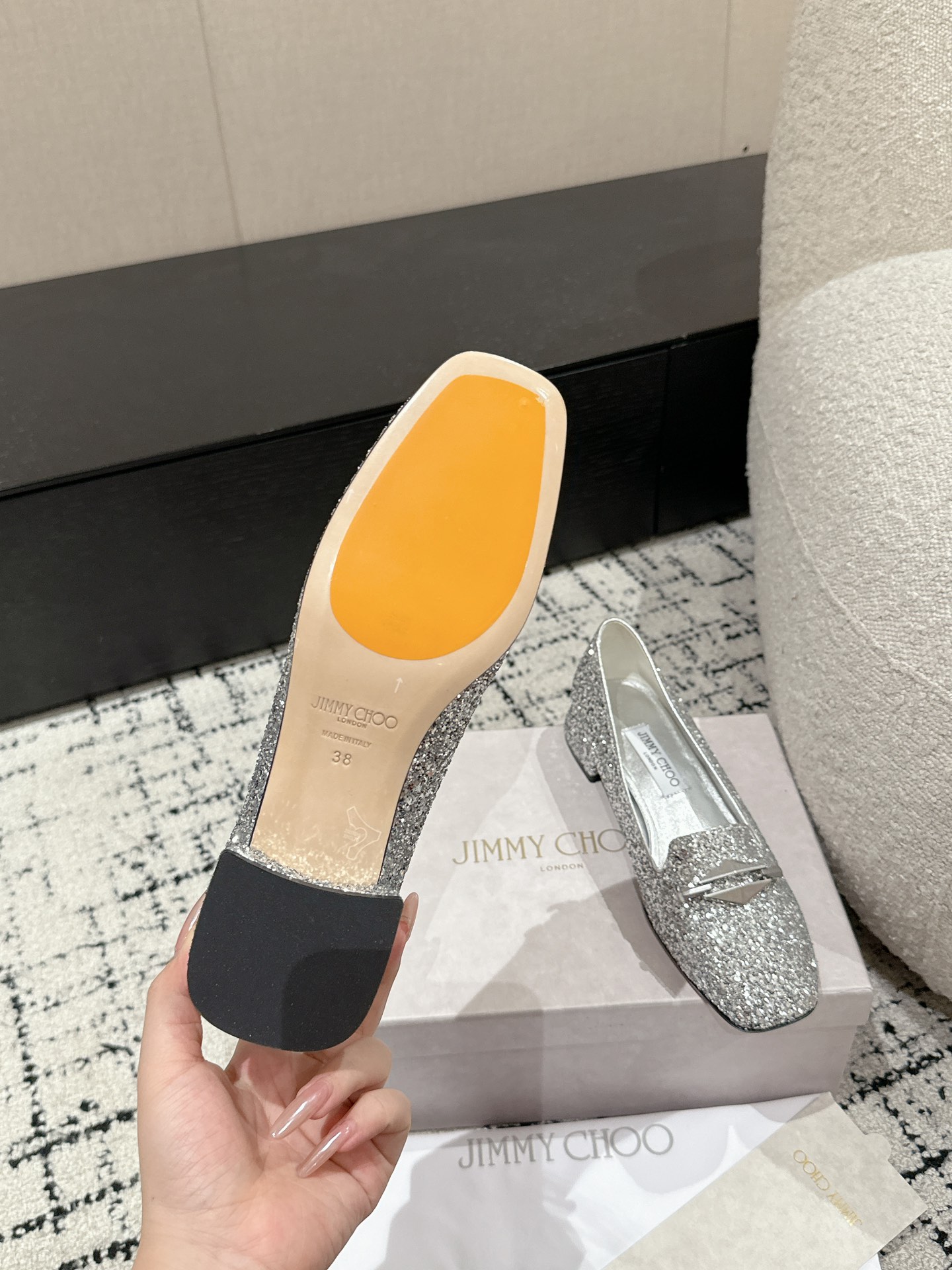 這款鞋子是AAAAA 1:1 質量(非常棒). 使用了和原版一模一樣的材料. 商標部分也保持了和吉米喬/JIMMY CHOO一樣. 圖片拍攝是實物鞋子拍攝, 您所收到的實物保證和我們圖片一模一樣.