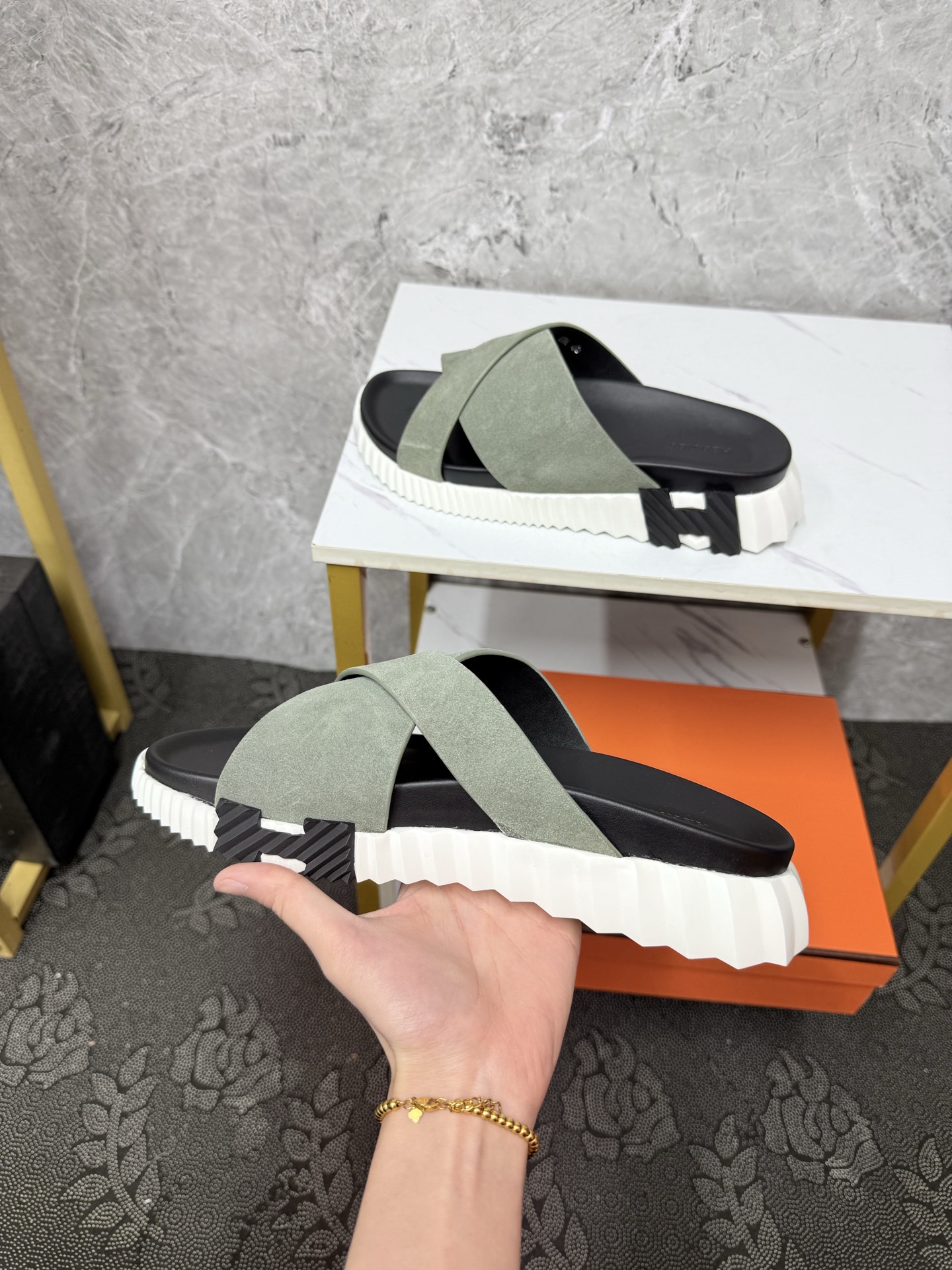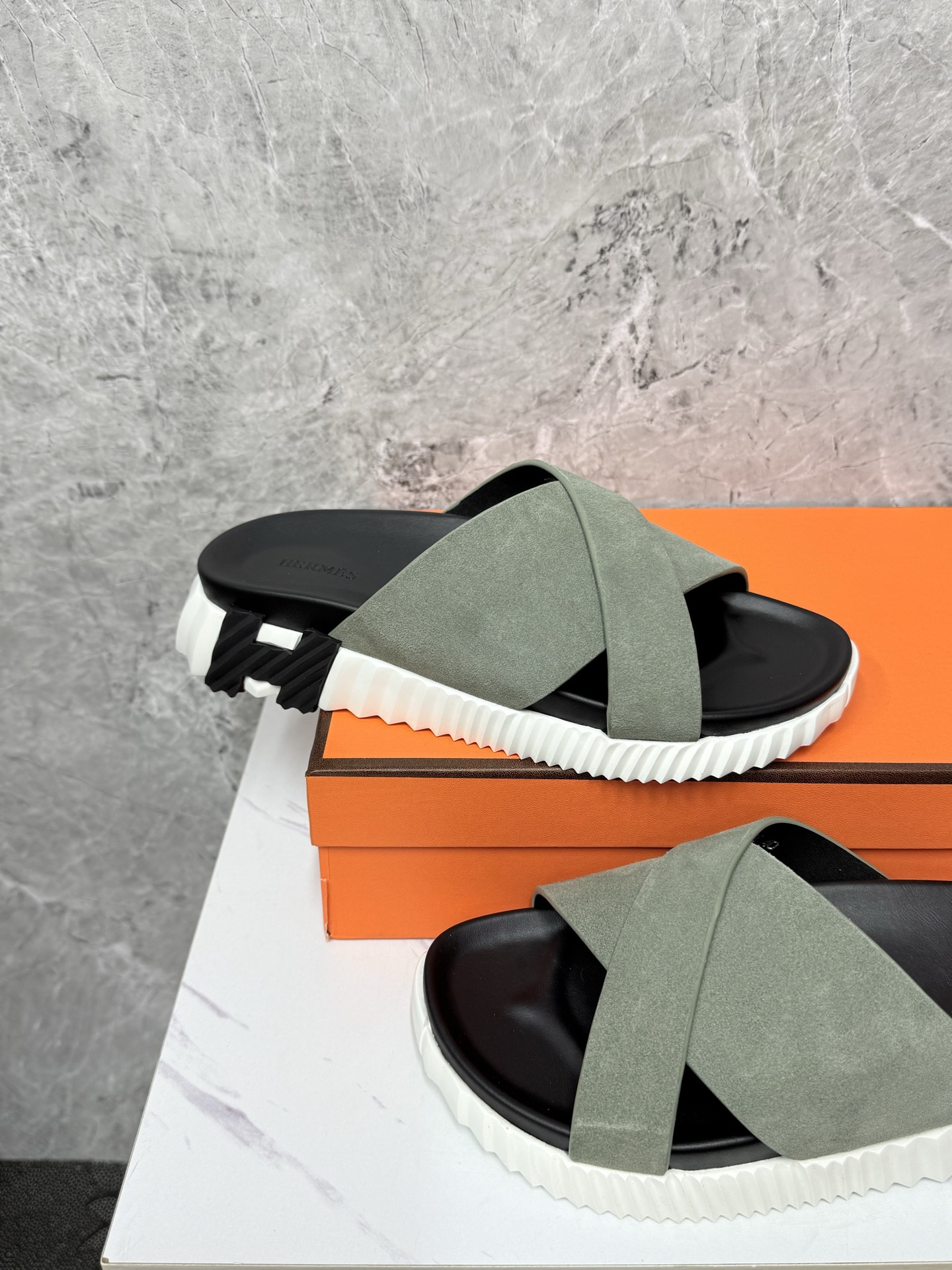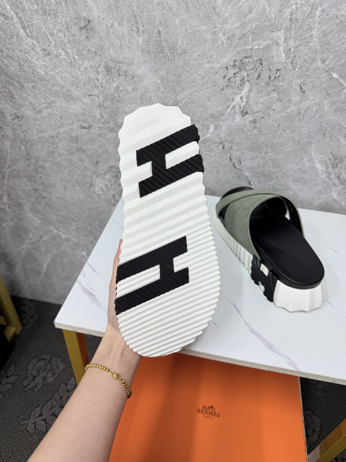 這款鞋子是AAAAA 1:1 質量(非常棒). 使用了和原版一模一樣的材料. 商標部分也保持了和愛馬仕/Hermes一樣. 圖片拍攝是實物鞋子拍攝, 您所收到的實物保證和我們圖片一模一樣.