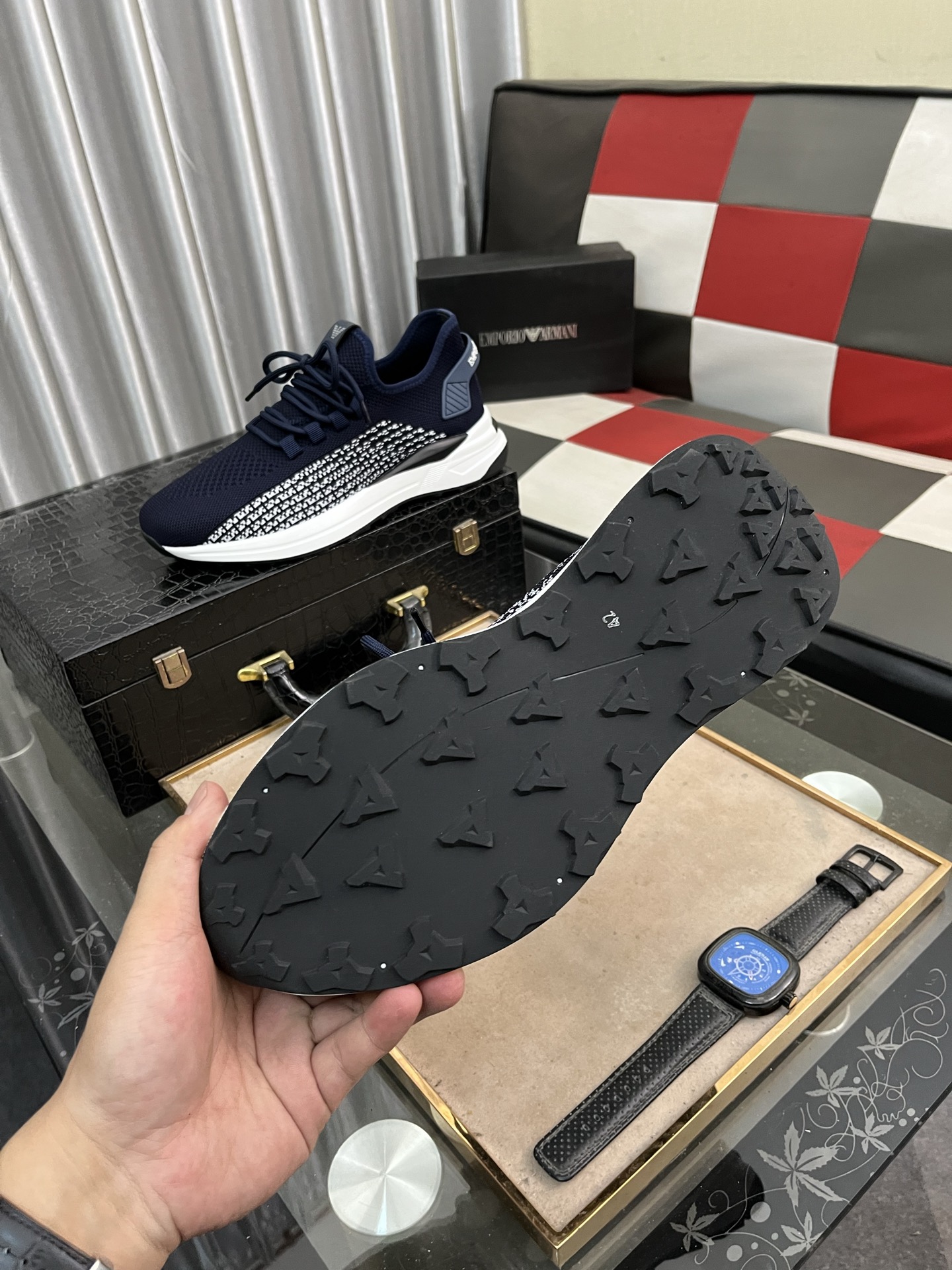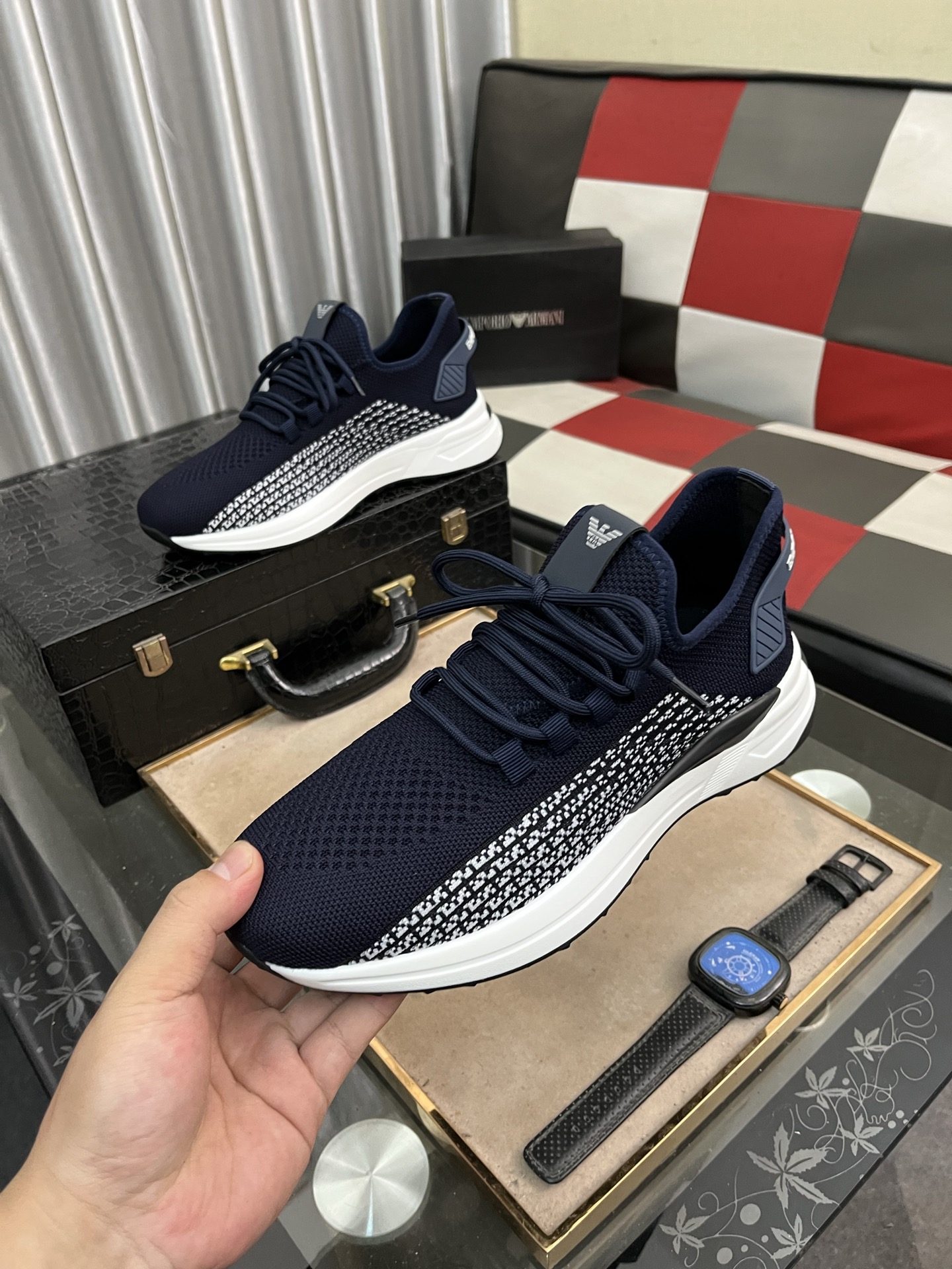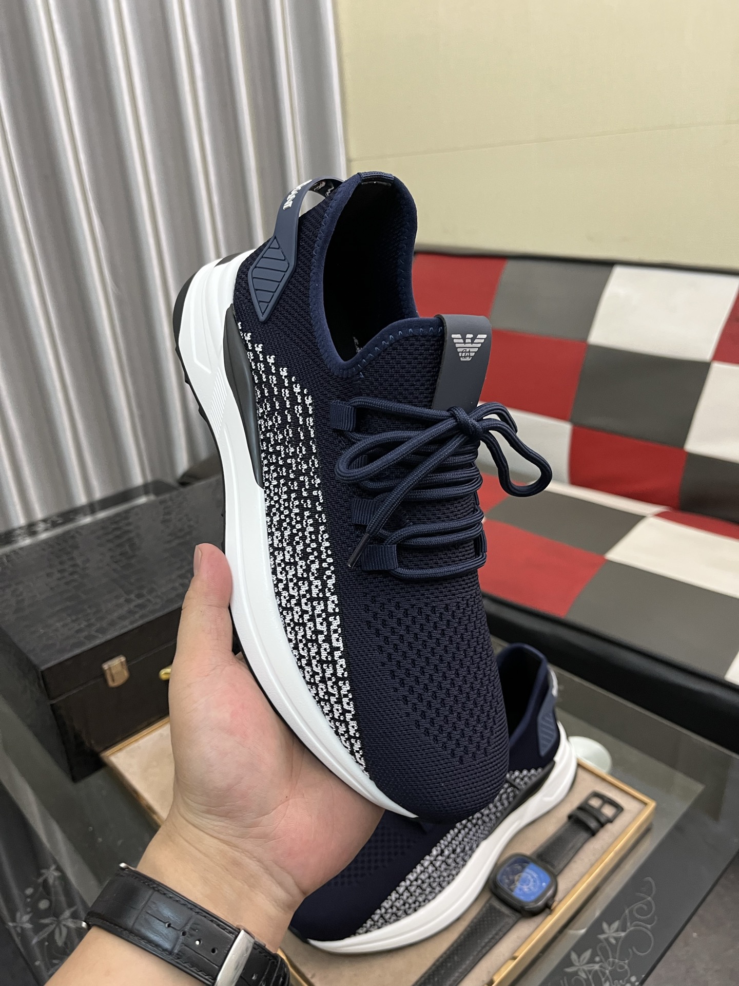 這款鞋子是AAAAA 1:1 質量(非常棒). 使用了和原版一模一樣的材料. 商標部分也保持了和阿瑪尼/Armani一樣. 圖片拍攝是實物鞋子拍攝, 您所收到的實物保證和我們圖片一模一樣.