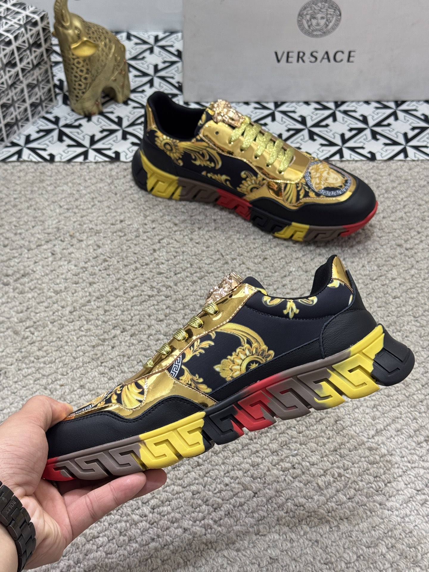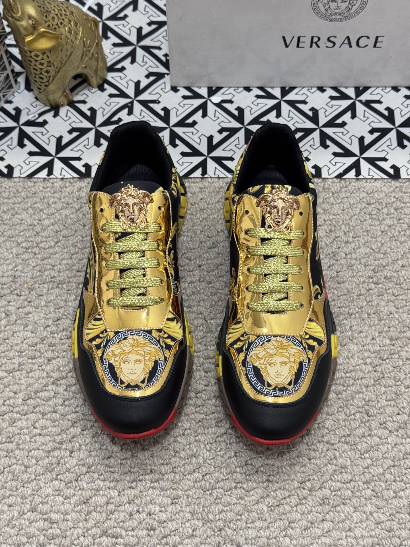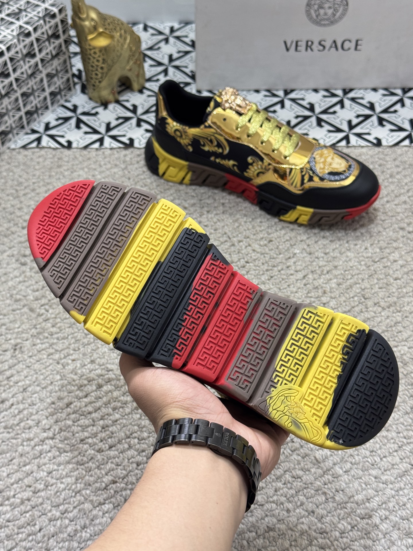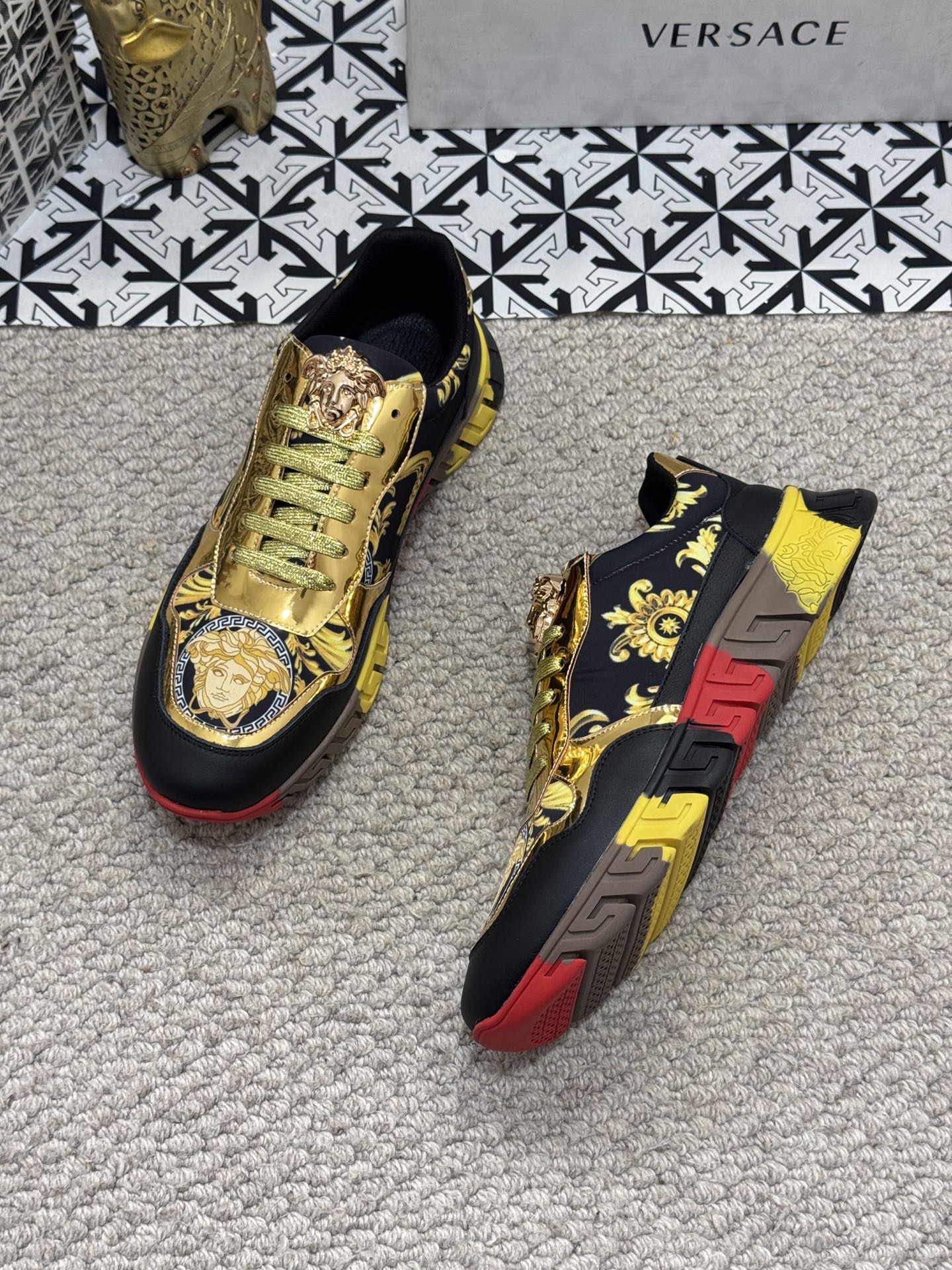 這款鞋子是AAAAA 1:1 質量(非常棒). 使用了和原版一模一樣的材料. 商標部分也保持了和范思哲/Versace一樣. 圖片拍攝是實物鞋子拍攝, 您所收到的實物保證和我們圖片一模一樣.