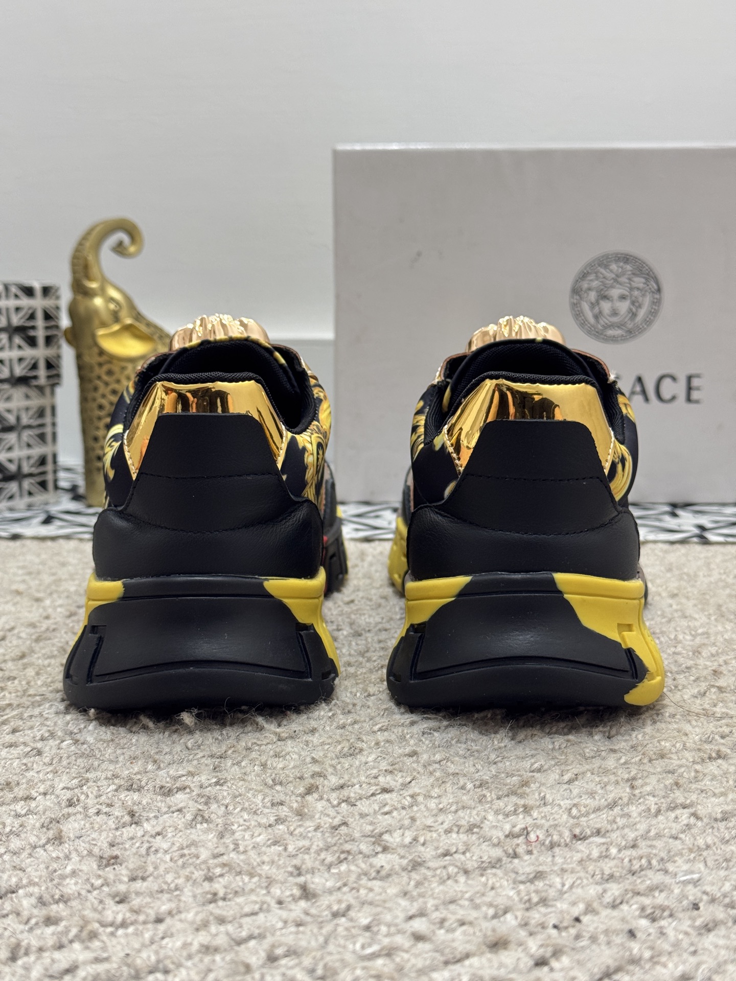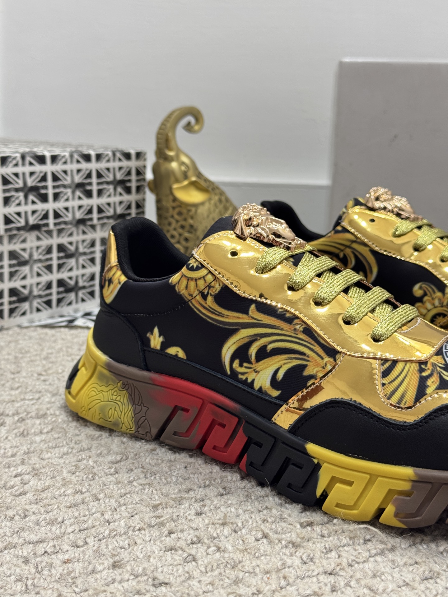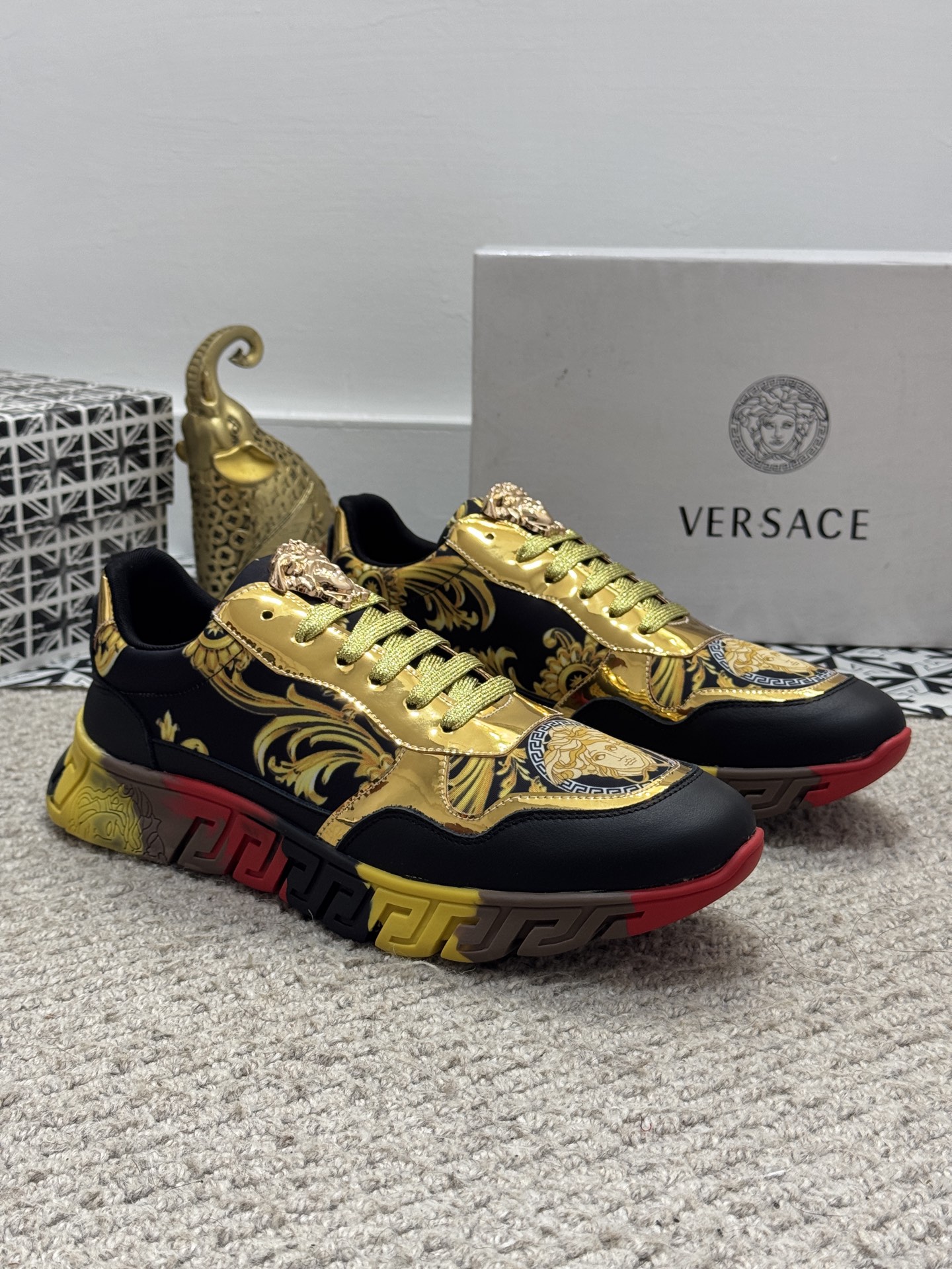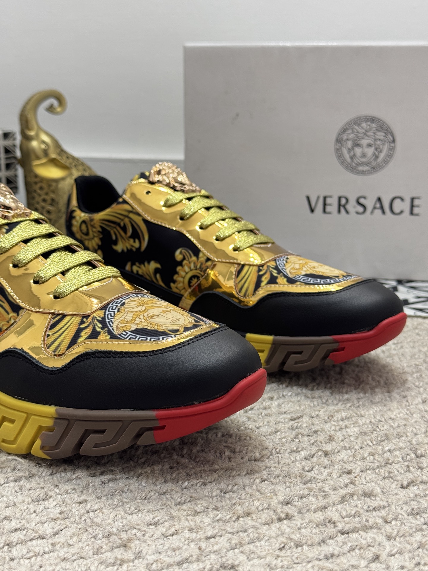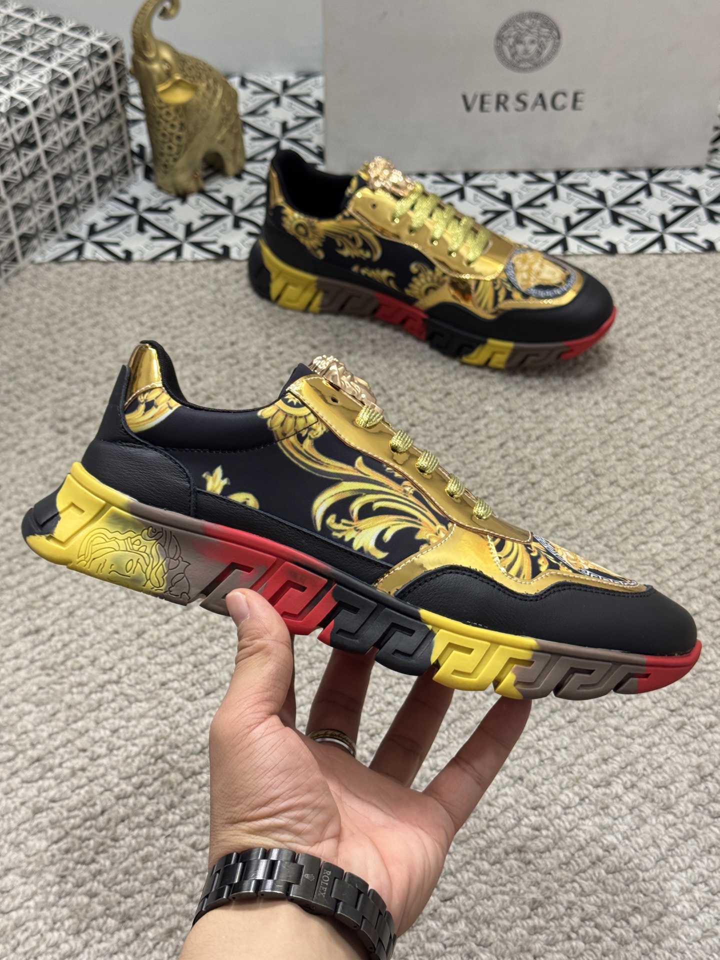 這款鞋子是AAAAA 1:1 質量(非常棒). 使用了和原版一模一樣的材料. 商標部分也保持了和范思哲/Versace一樣. 圖片拍攝是實物鞋子拍攝, 您所收到的實物保證和我們圖片一模一樣.