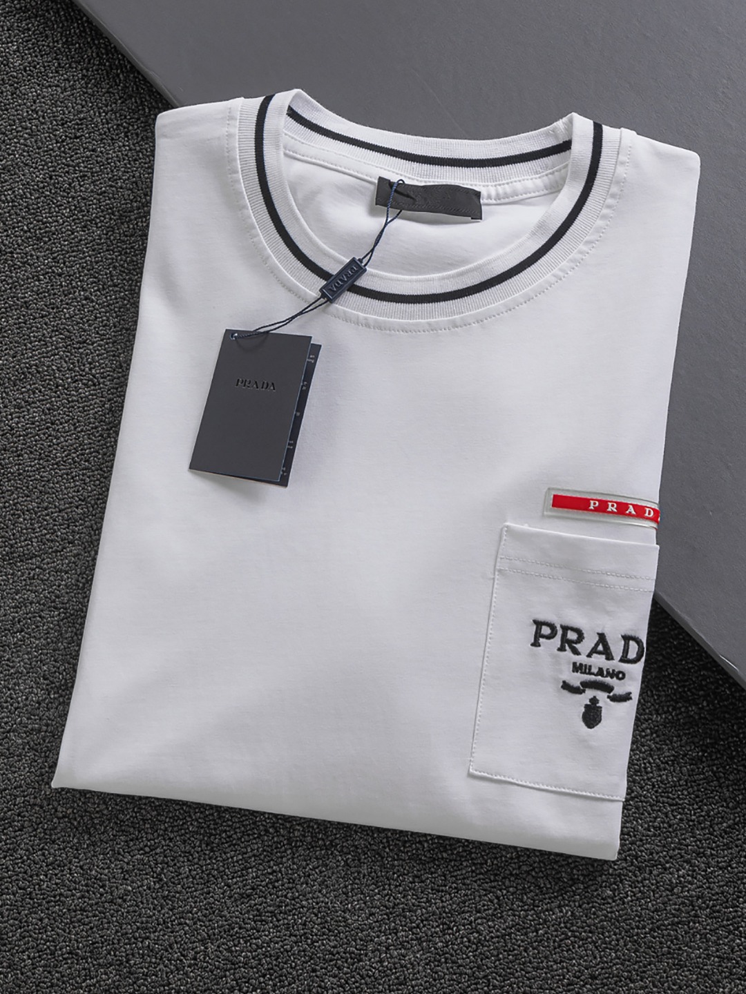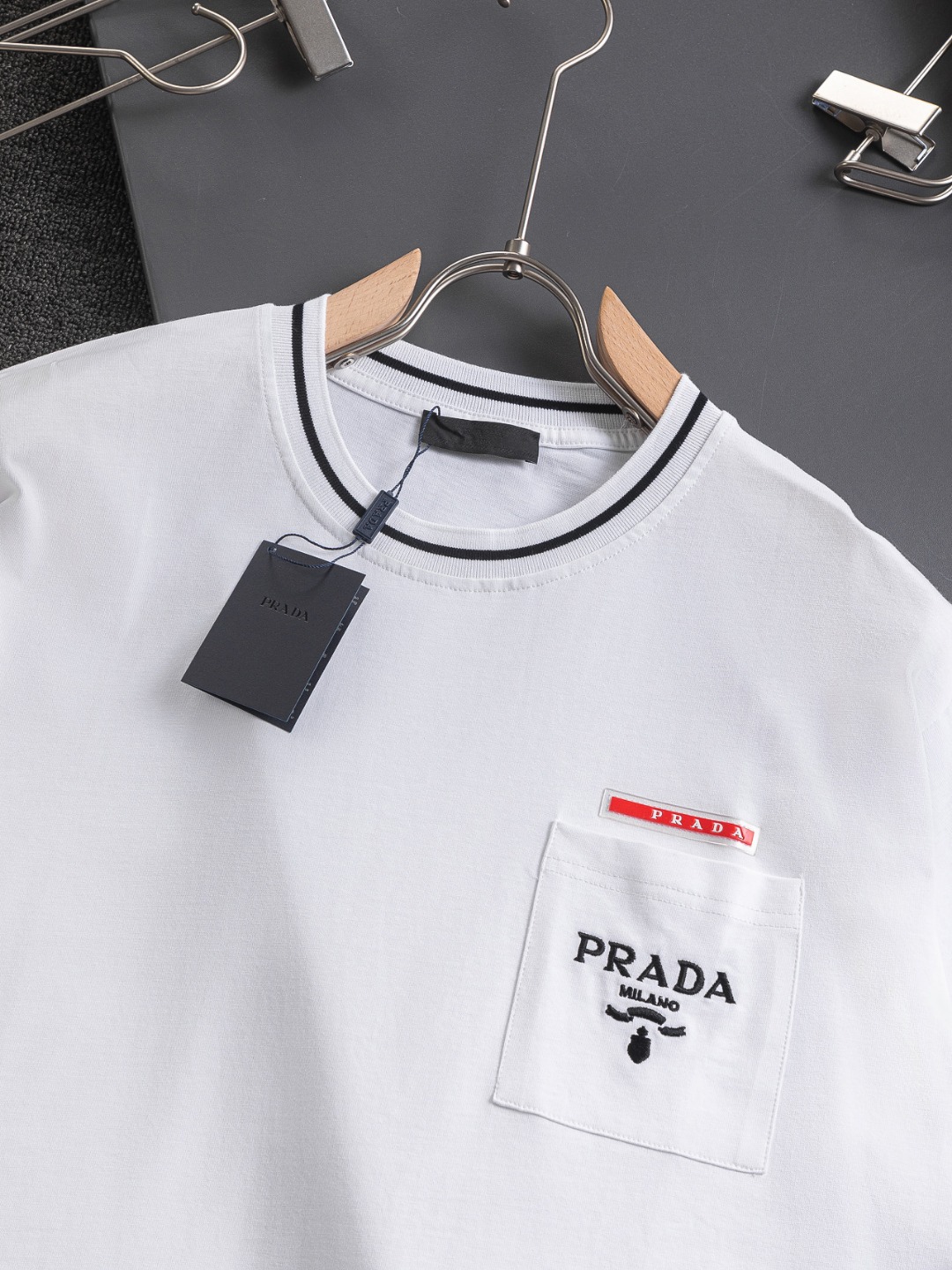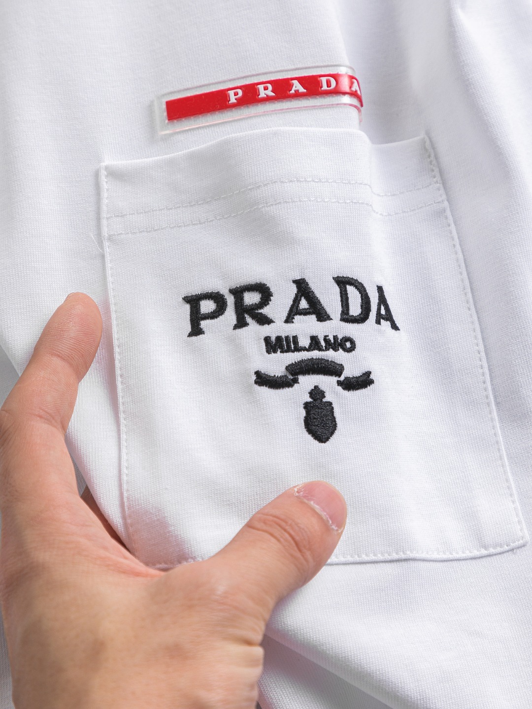 這款衣服是AAAAA 1:1 質量(非常棒). 使用了和原版一模一樣的材料. 商標部分也保持了和普拉達/Prada一樣. 圖片拍攝是實物衣服拍攝, 您所收到的實物保證和我們圖片一模一樣.