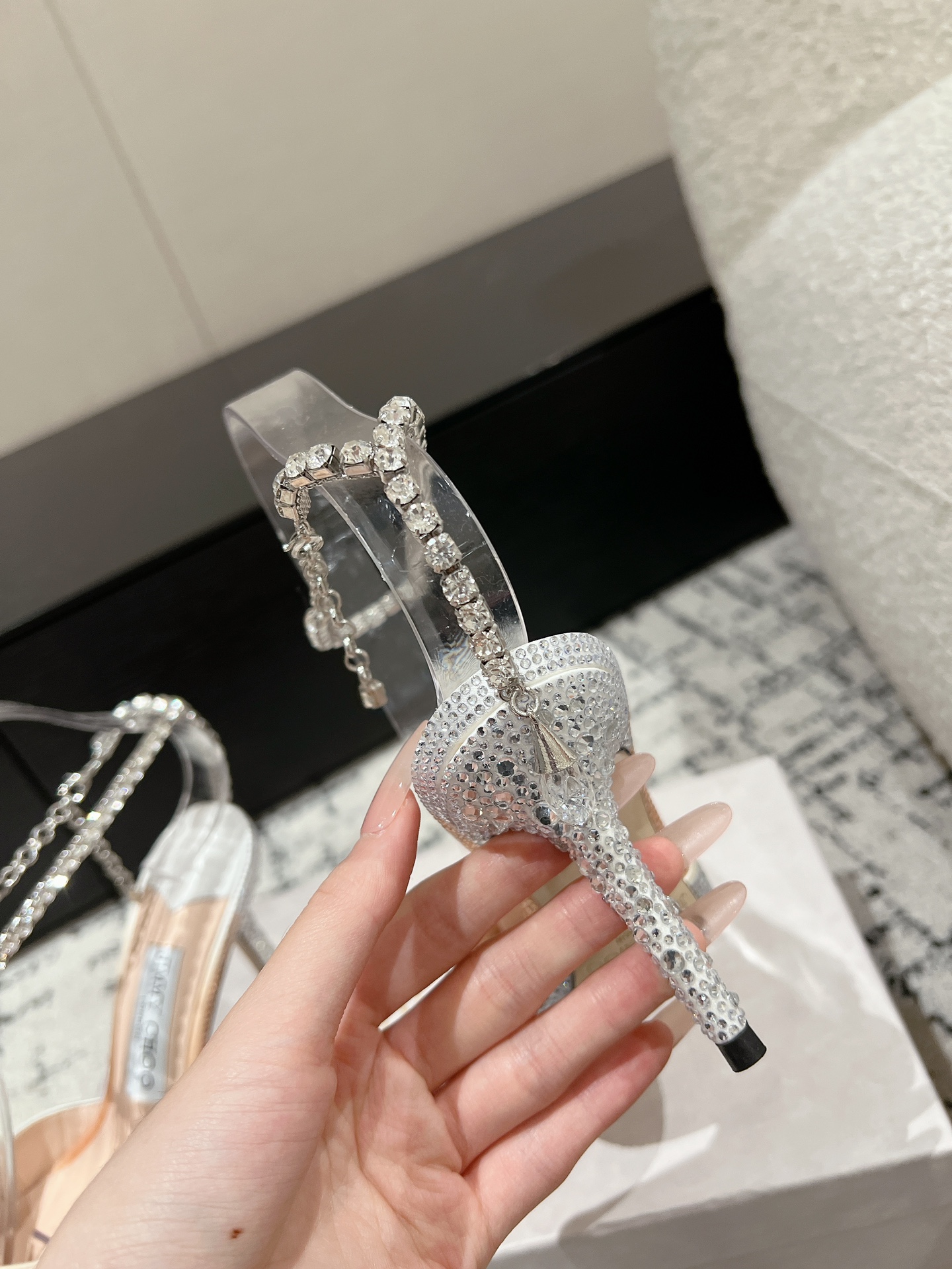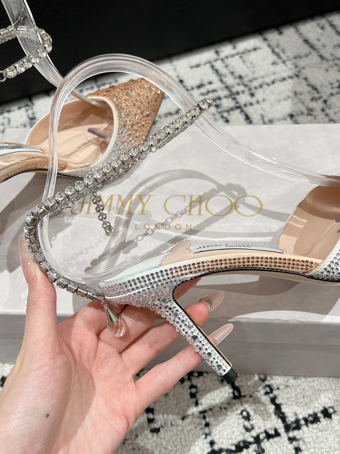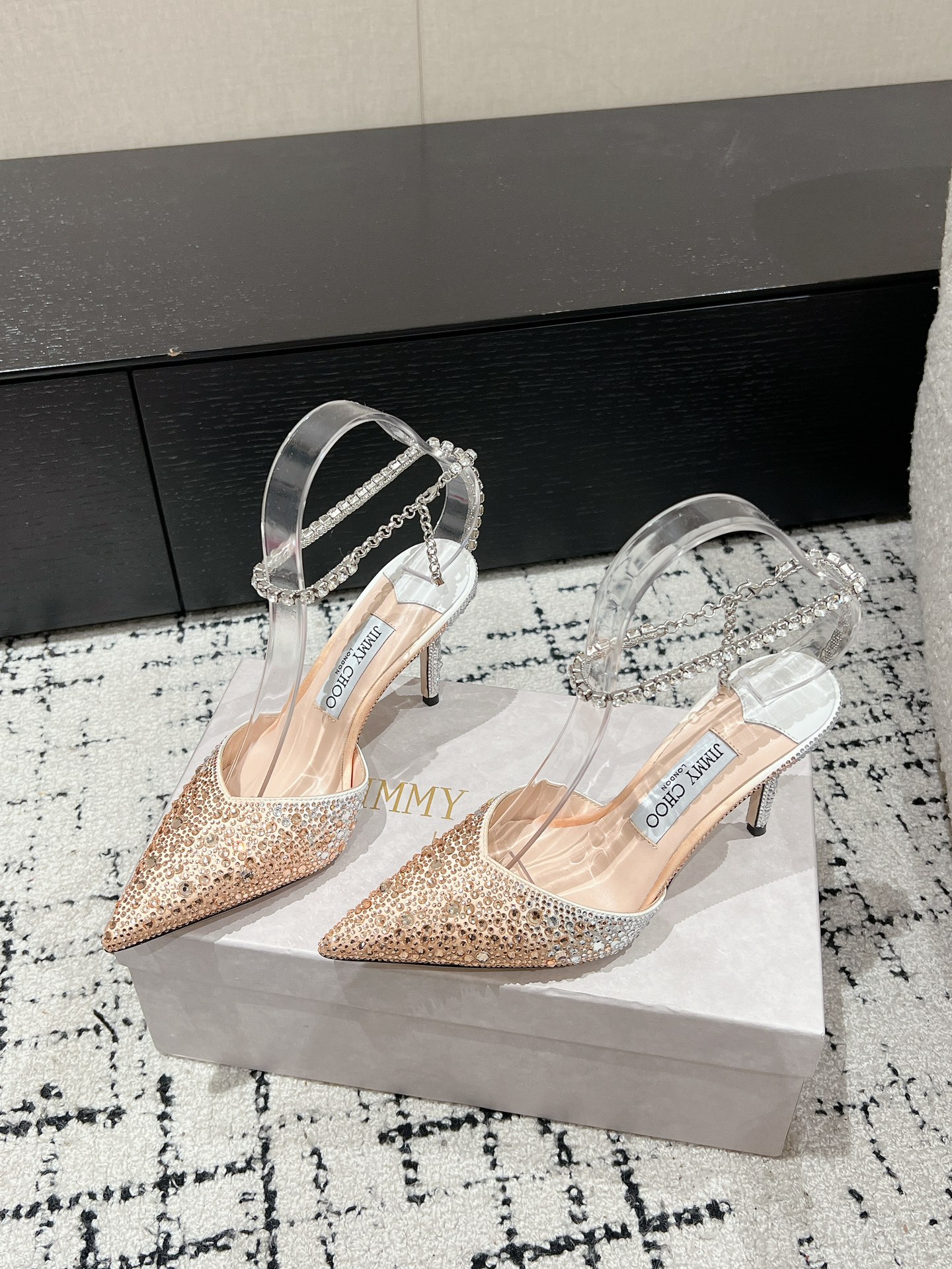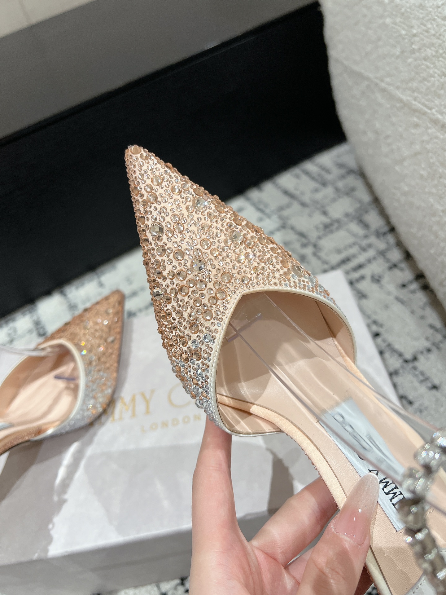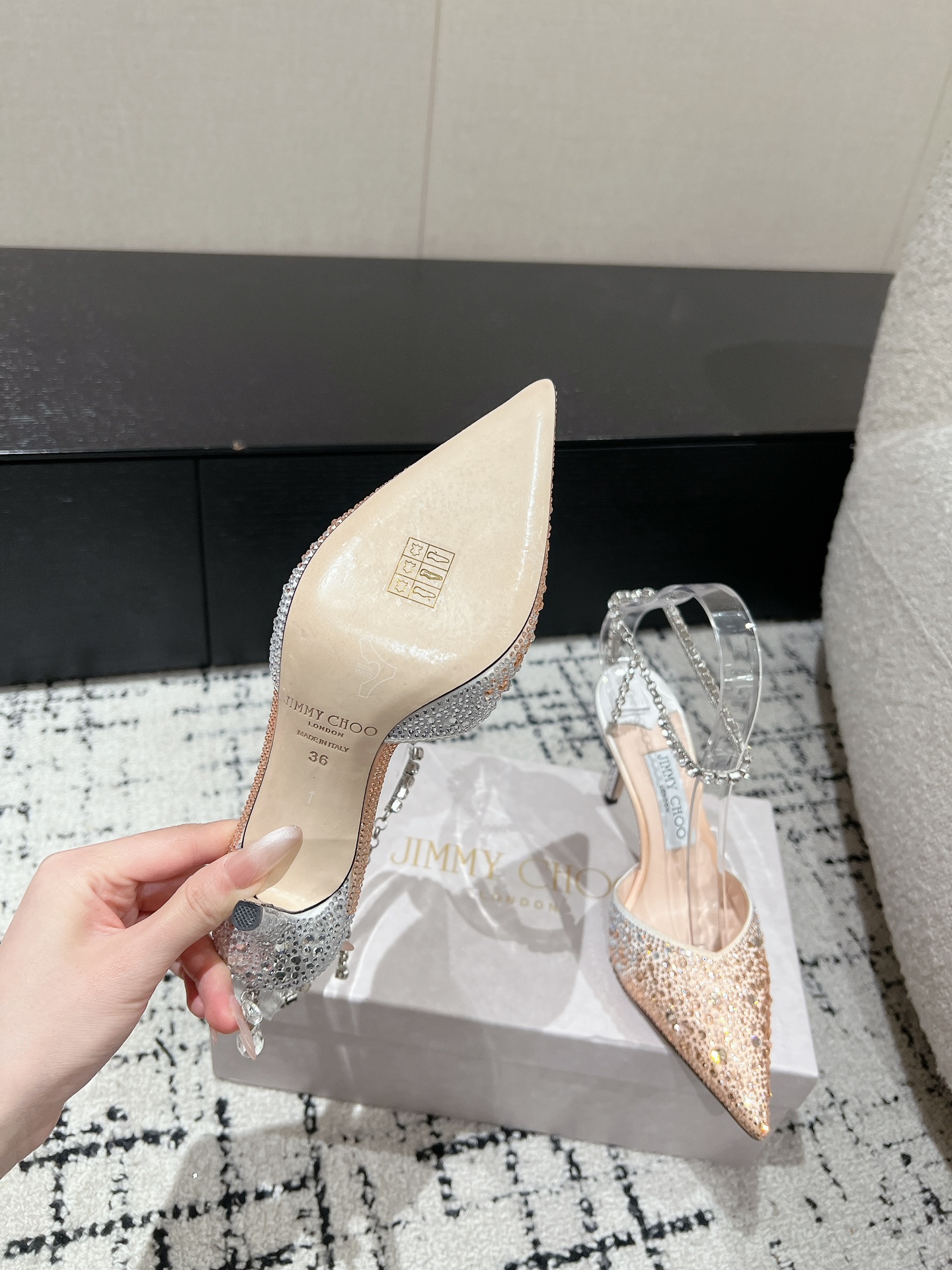這款鞋子是AAAAA 1:1 質量(非常棒). 使用了和原版一模一樣的材料. 商標部分也保持了和吉米喬/JIMMY CHOO一樣. 圖片拍攝是實物鞋子拍攝, 您所收到的實物保證和我們圖片一模一樣.