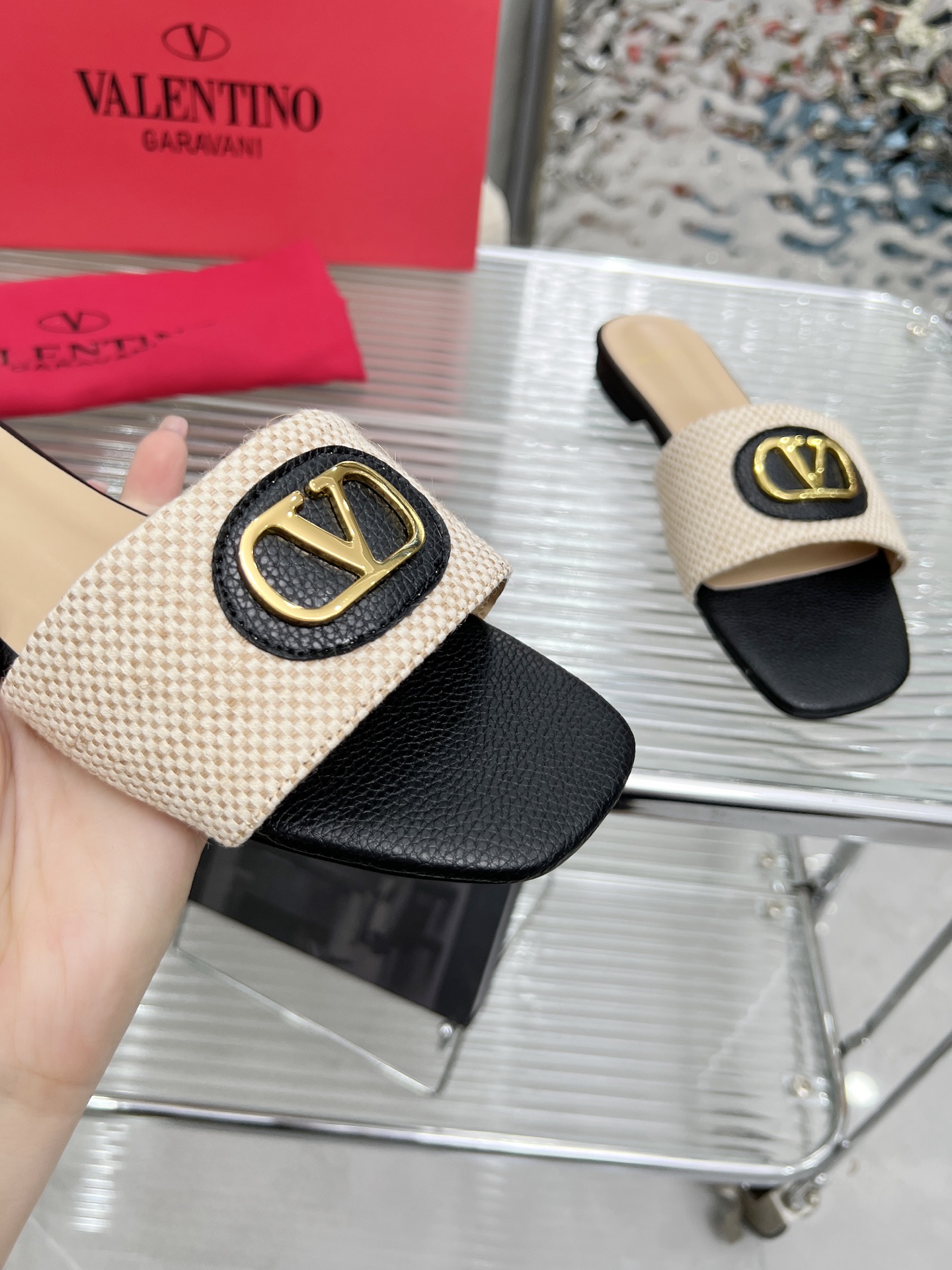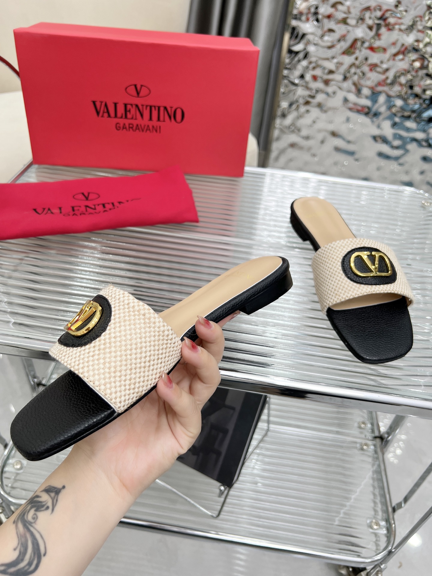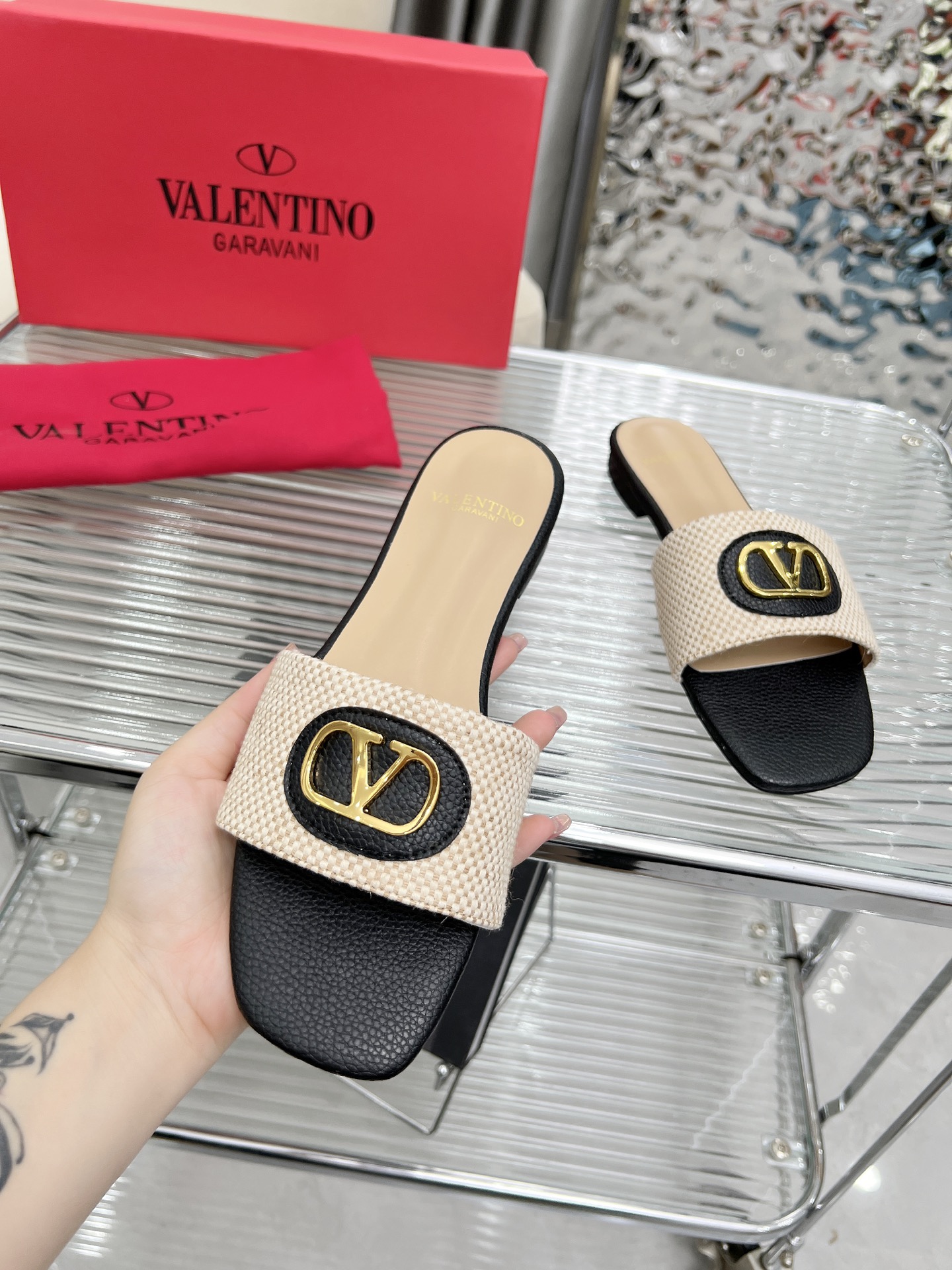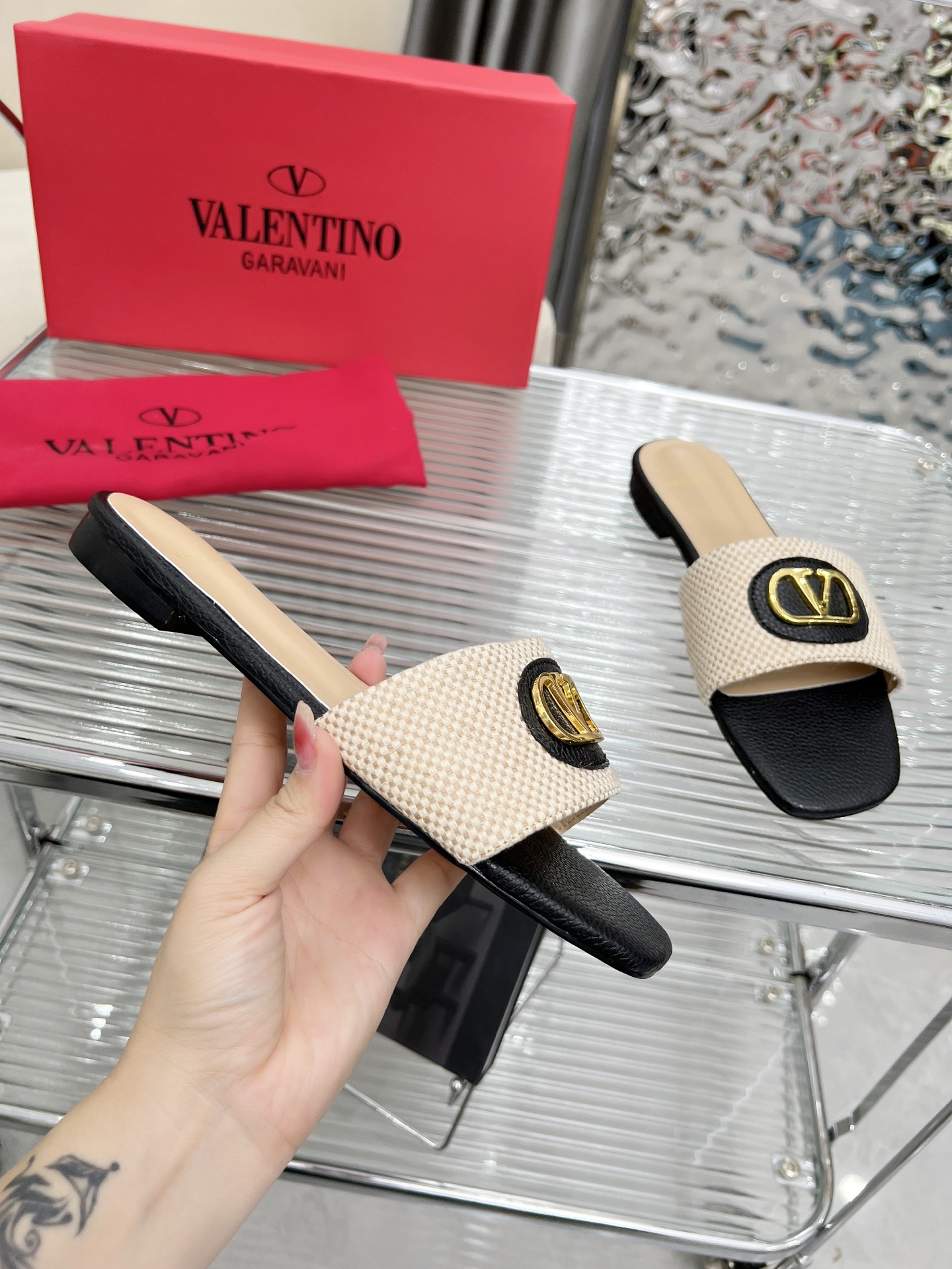 這款鞋子是AAAAA 1:1 質量(非常棒). 使用了和原版一模一樣的材料. 商標部分也保持了和瓦倫蒂諾/Valentino一樣. 圖片拍攝是實物鞋子拍攝, 您所收到的實物保證和我們圖片一模一樣.