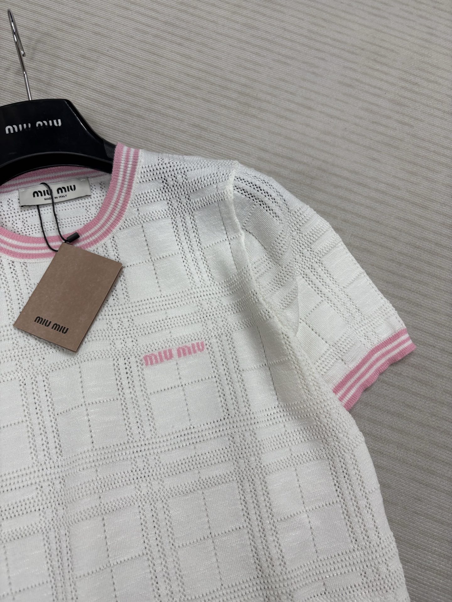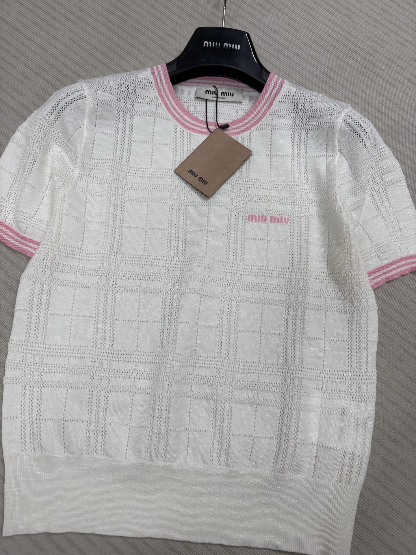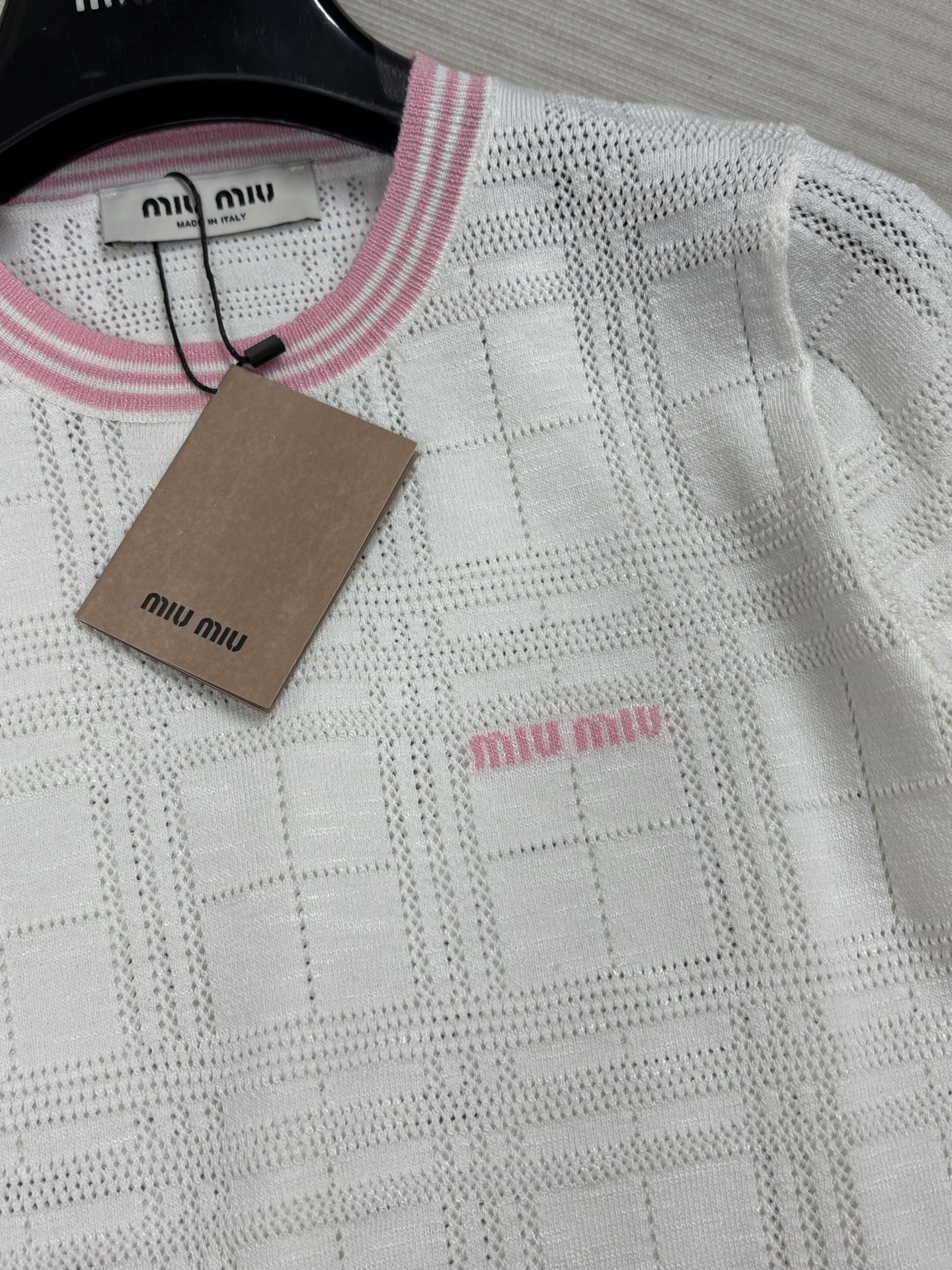 這款衣服是AAAAA 1:1 質量(非常棒). 使用了和原版一模一樣的材料. 商標部分也保持了和繆繆/Miu Miu一樣. 圖片拍攝是實物衣服拍攝, 您所收到的實物保證和我們圖片一模一樣.