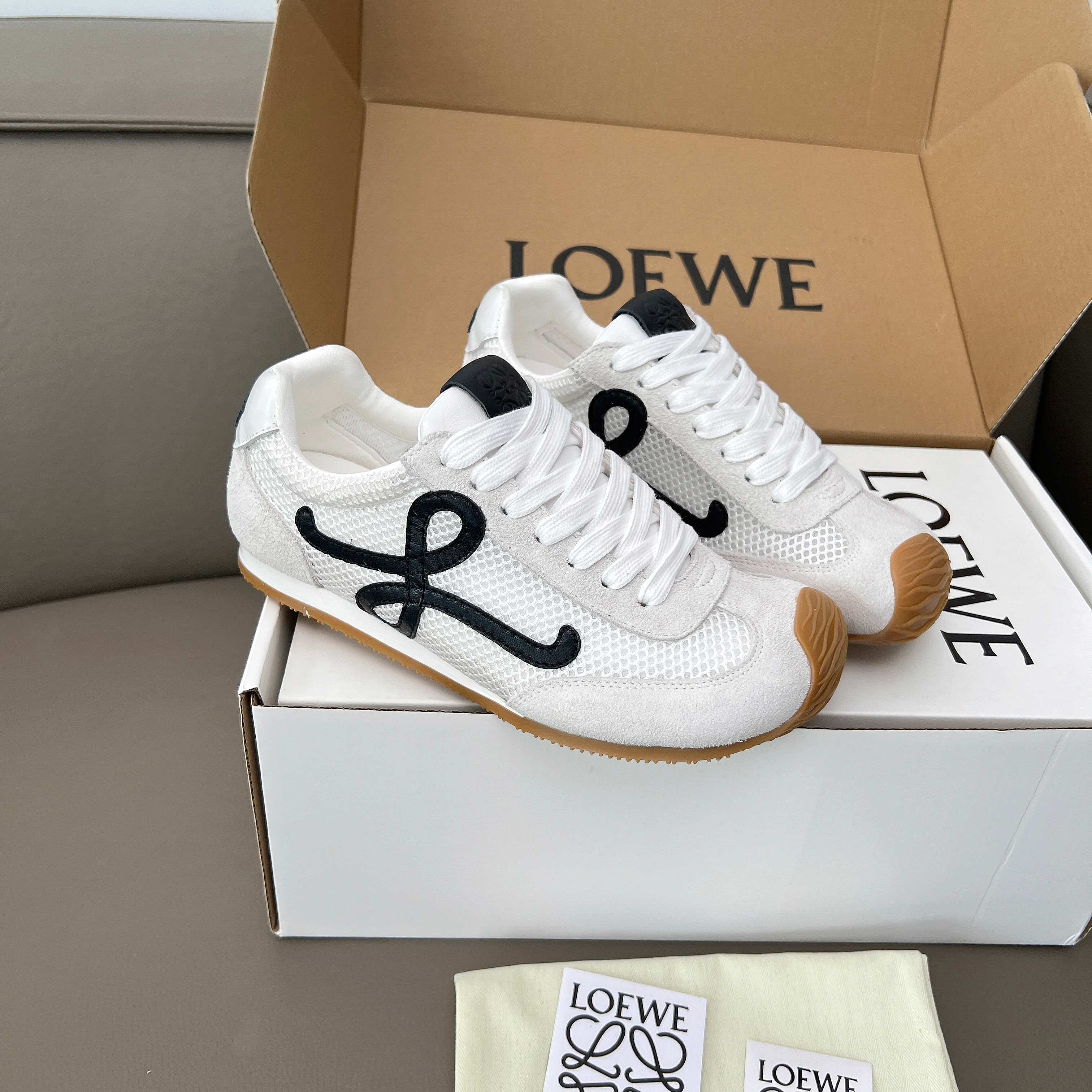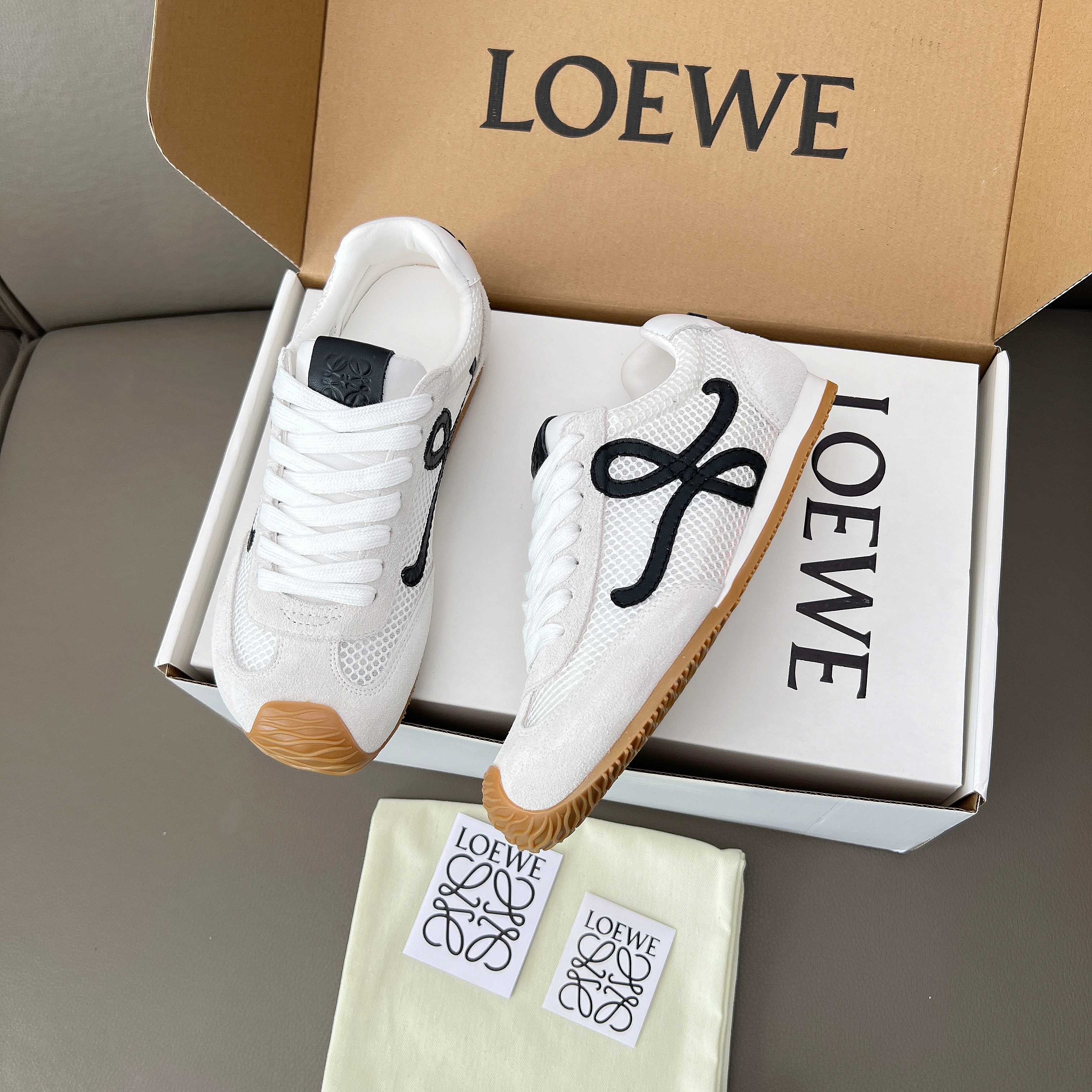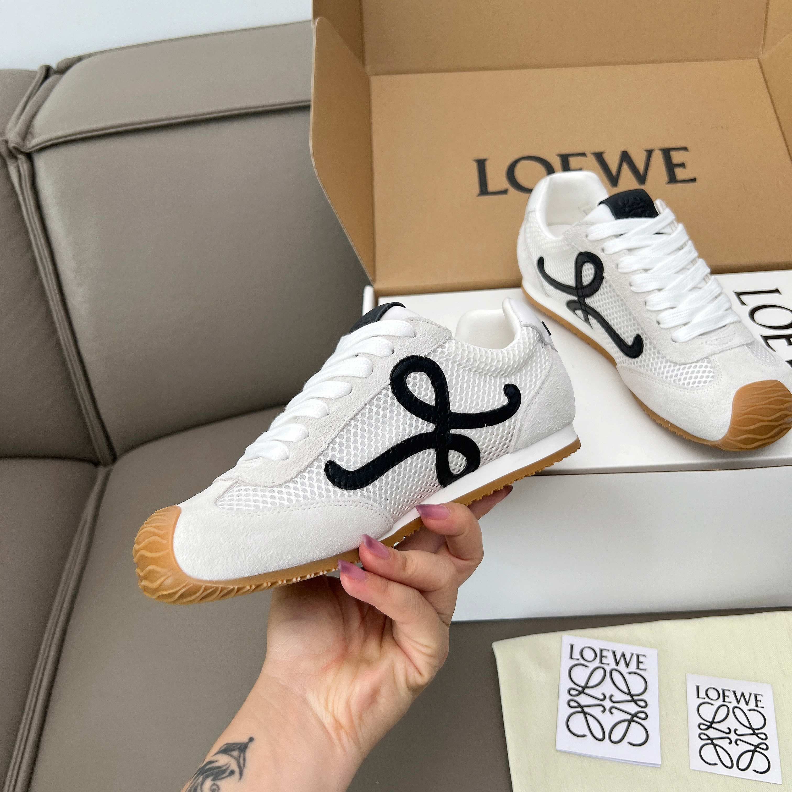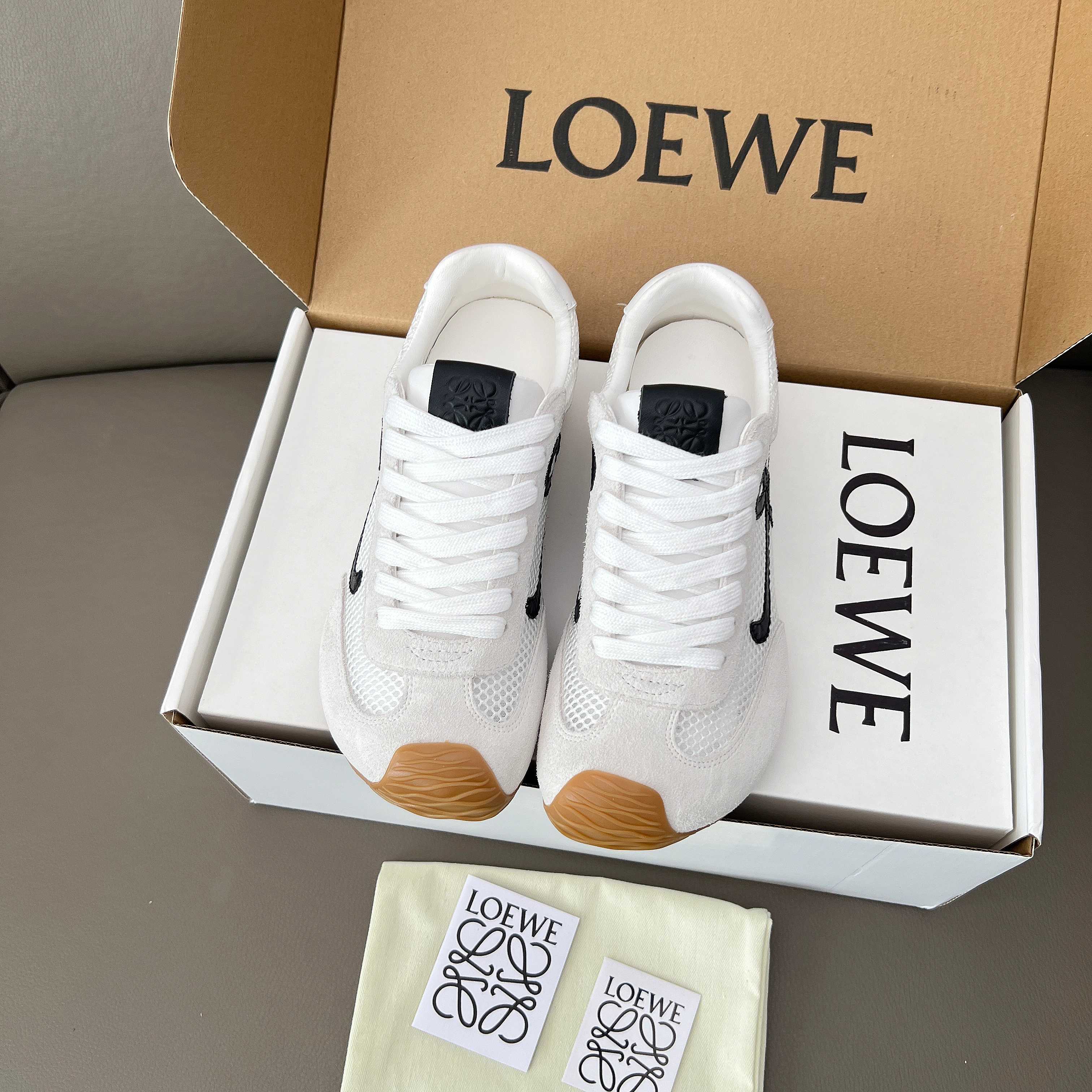 這款鞋子是AAAAA 1:1 質量(非常棒). 使用了和原版一模一樣的材料. 商標部分也保持了和Loewe一樣. 圖片拍攝是實物鞋子拍攝, 您所收到的實物保證和我們圖片一模一樣.