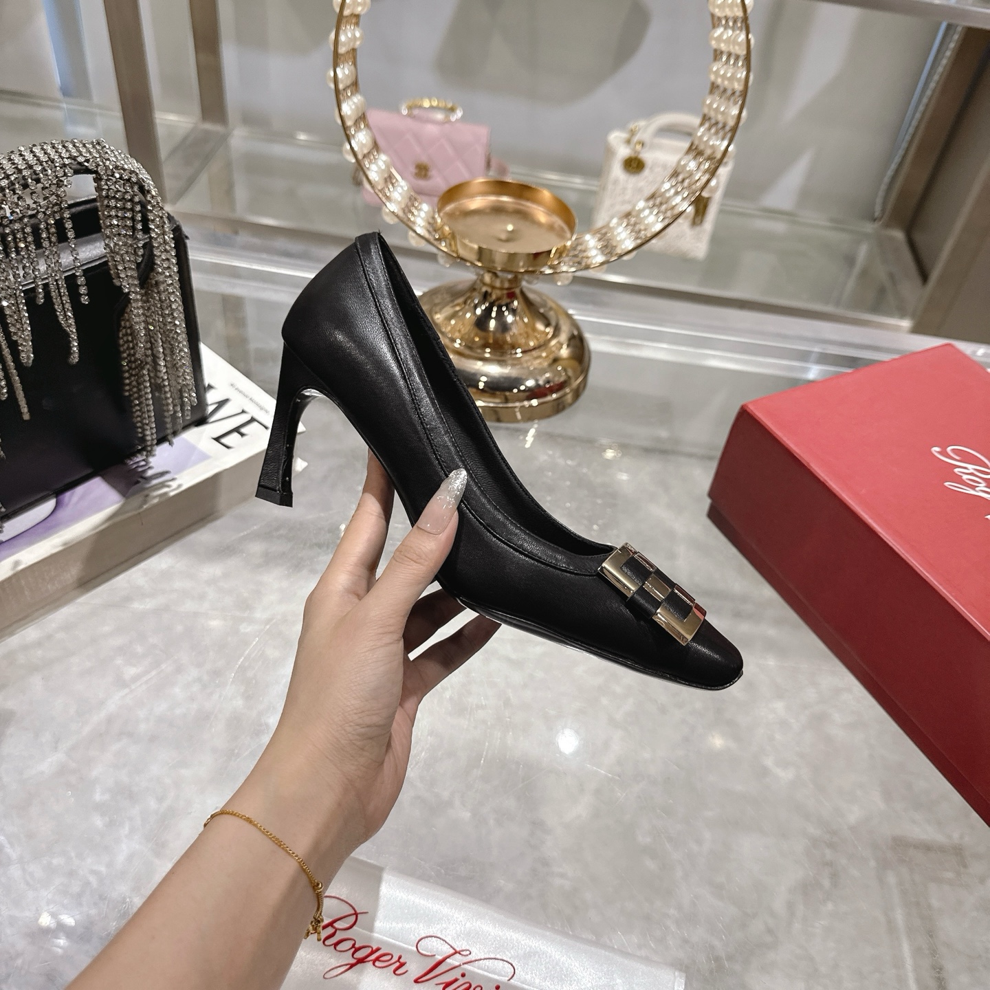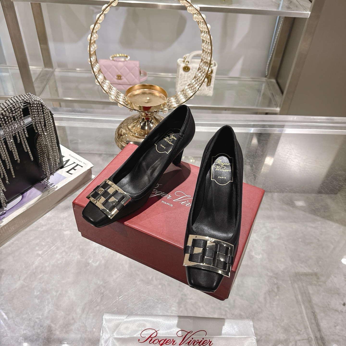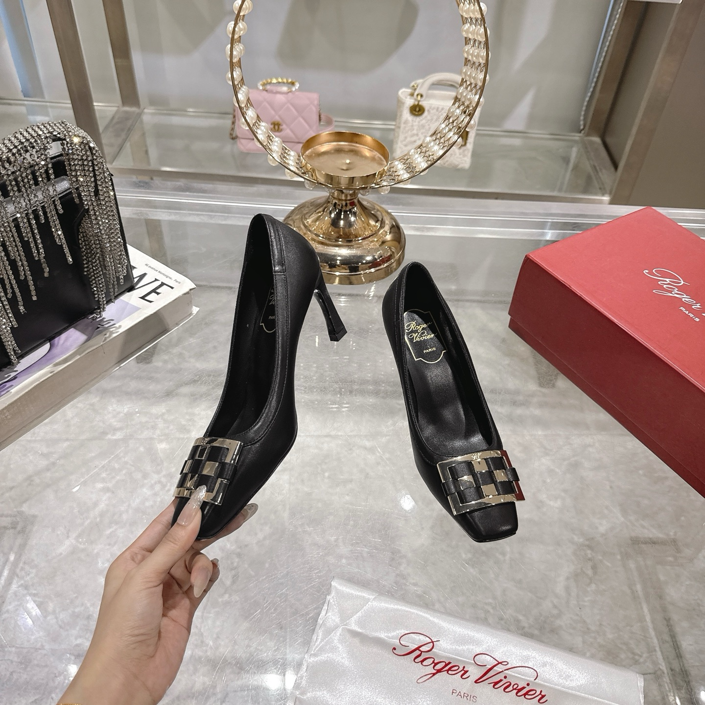 這款鞋子是AAAAA 1:1 質量(非常棒). 使用了和原版一模一樣的材料. 商標部分也保持了和羅傑維維耶/Roger Vivier一樣. 圖片拍攝是實物鞋子拍攝, 您所收到的實物保證和我們圖片一模一樣.