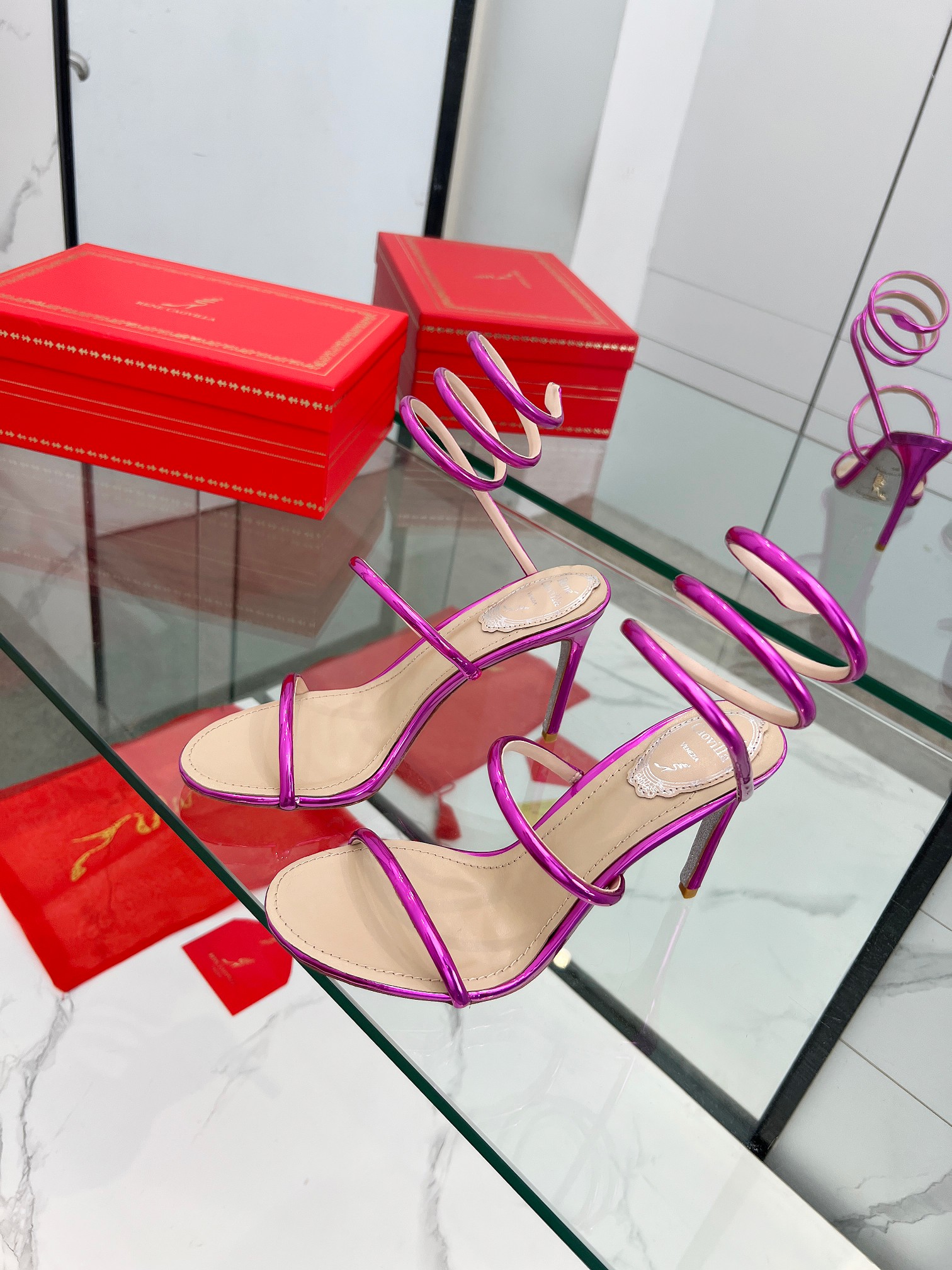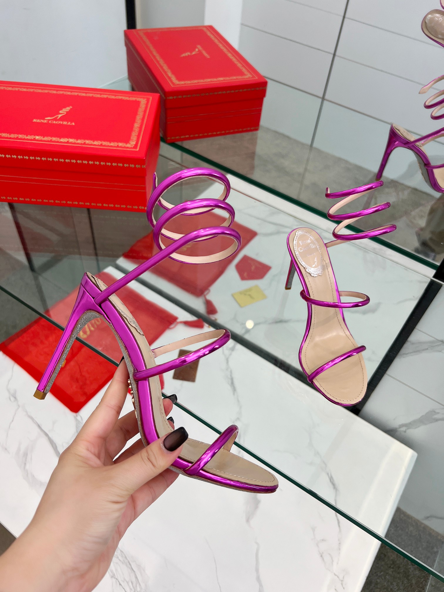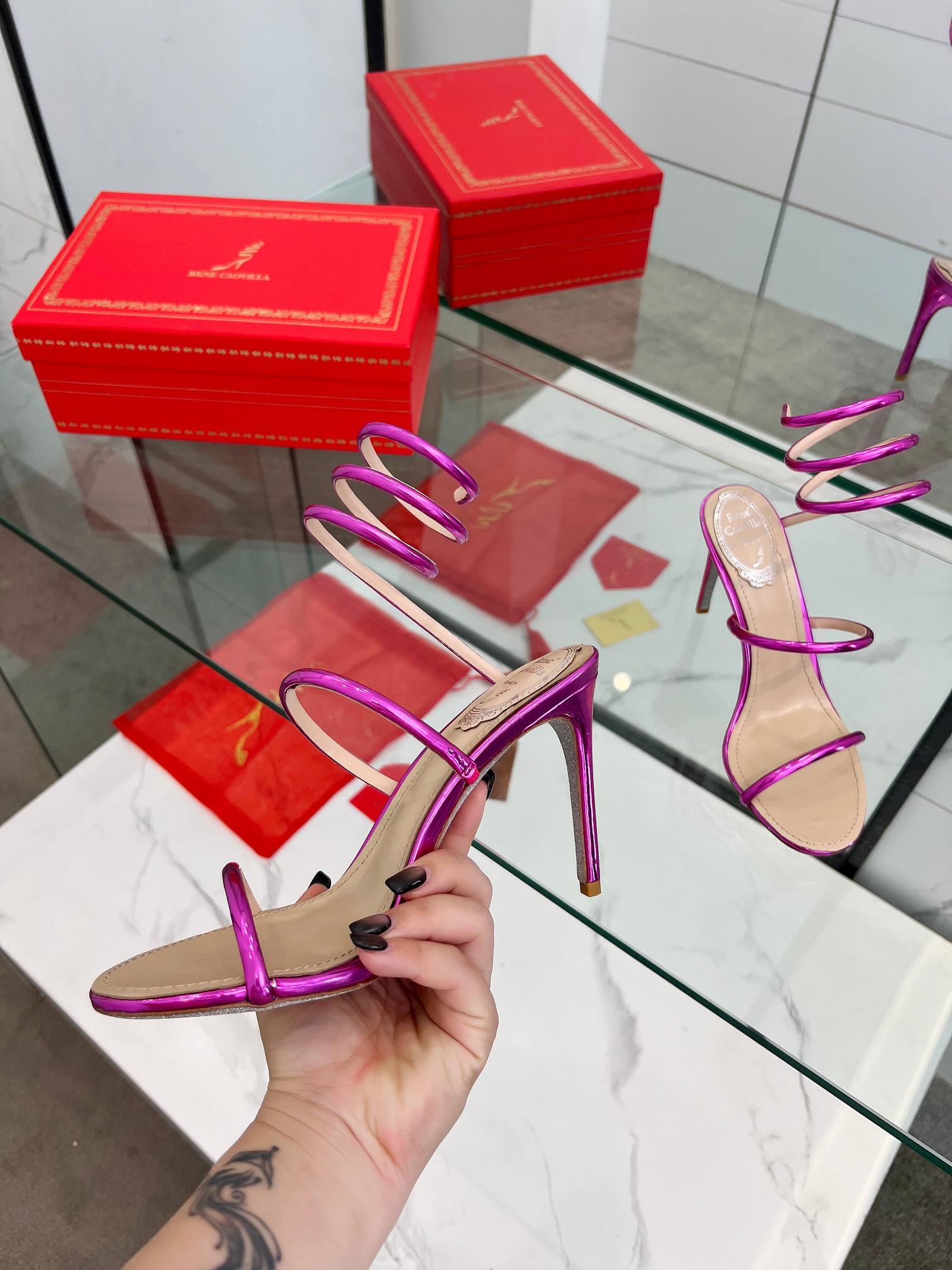 這款鞋子是AAAAA 1:1 質量(非常棒). 使用了和原版一模一樣的材料. 商標部分也保持了和Rene Caovilla一樣. 圖片拍攝是實物鞋子拍攝, 您所收到的實物保證和我們圖片一模一樣.