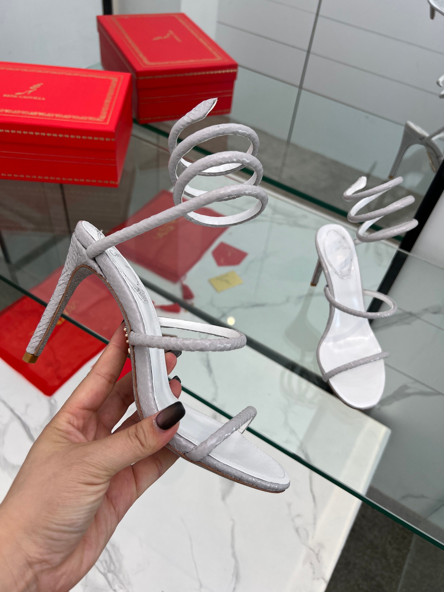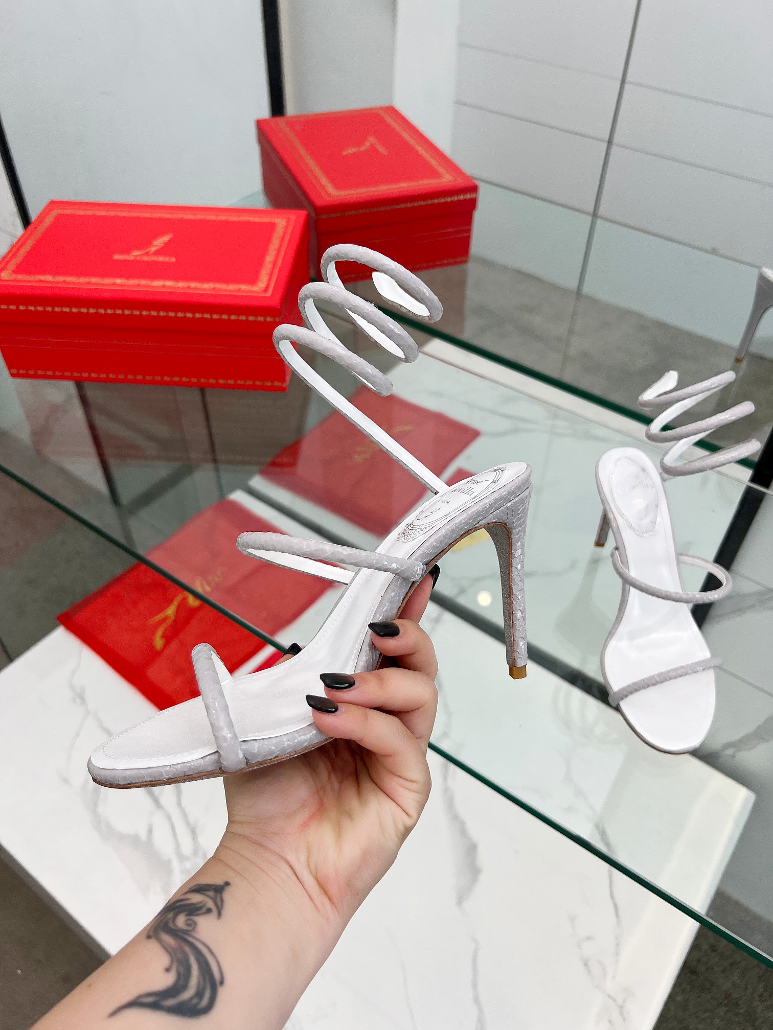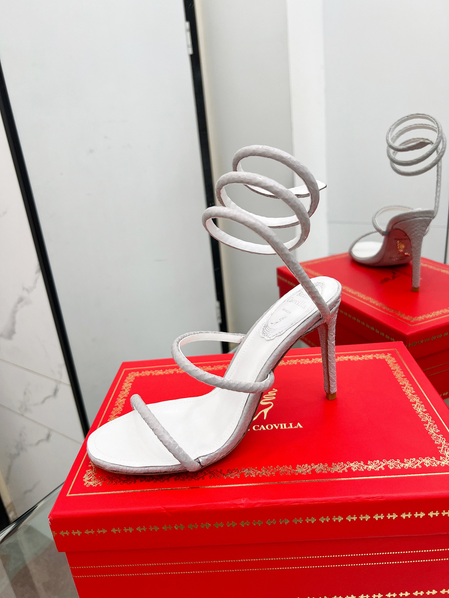 這款鞋子是AAAAA 1:1 質量(非常棒). 使用了和原版一模一樣的材料. 商標部分也保持了和Rene Caovilla一樣. 圖片拍攝是實物鞋子拍攝, 您所收到的實物保證和我們圖片一模一樣.